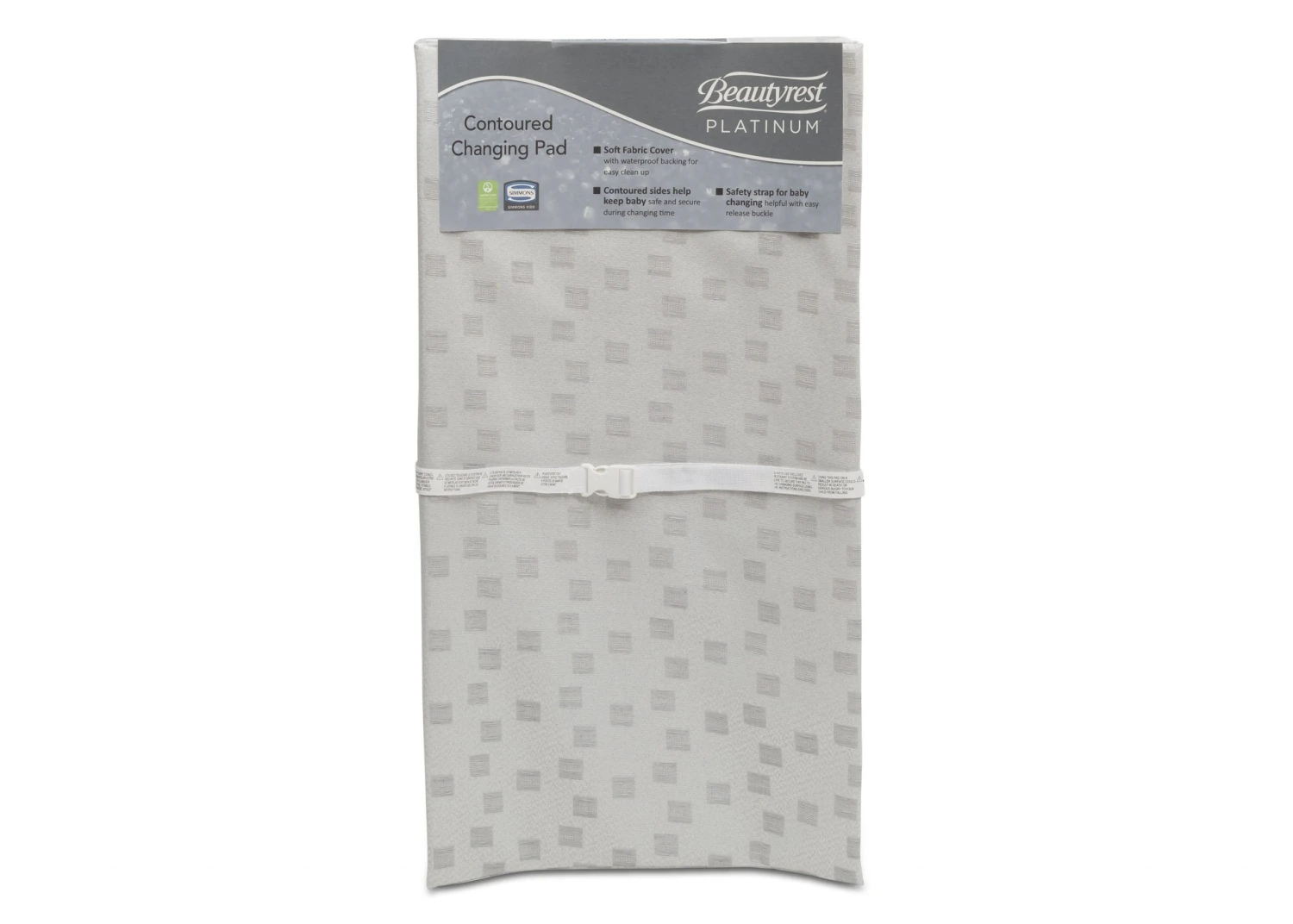 Your baby will be comfortable and safe come changing time with the Beautyrest Platinum Contoured Changing Pad! Made with a soft fabric cover with a waterproof backing, this easy-to-clean changing pad is durable enough for everyday use. The contoured sides gently cradle baby while the safety belt keeps them securely in place. Security tabs on the back of the pad keep it attached to furniture and the non-skid bottom helps so it won’t slip or move. Get the Beautyrest Platinum Contoured Changing Pad and turn any surface into a completely safe changing table or dressing station. Fits most changing tables.