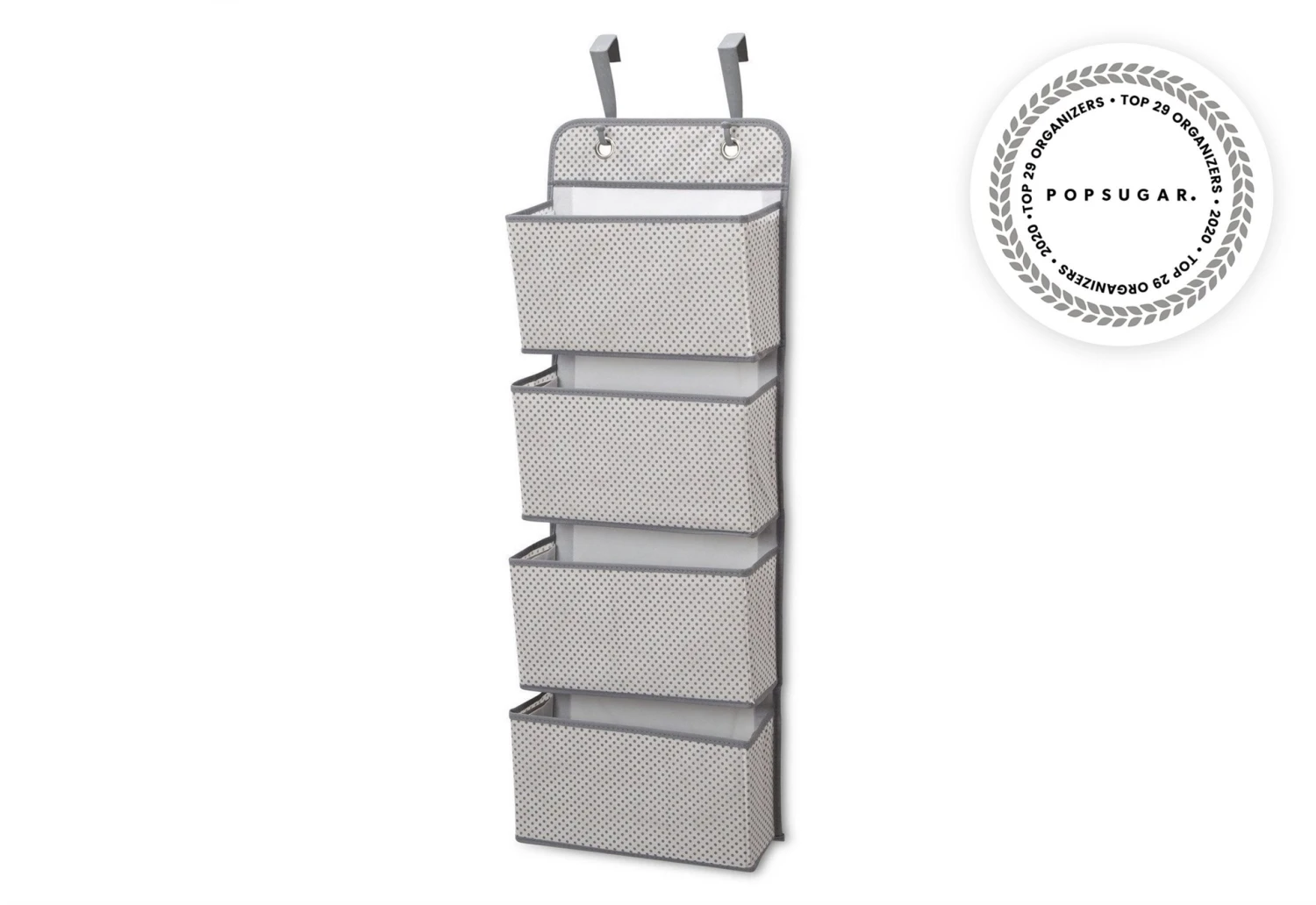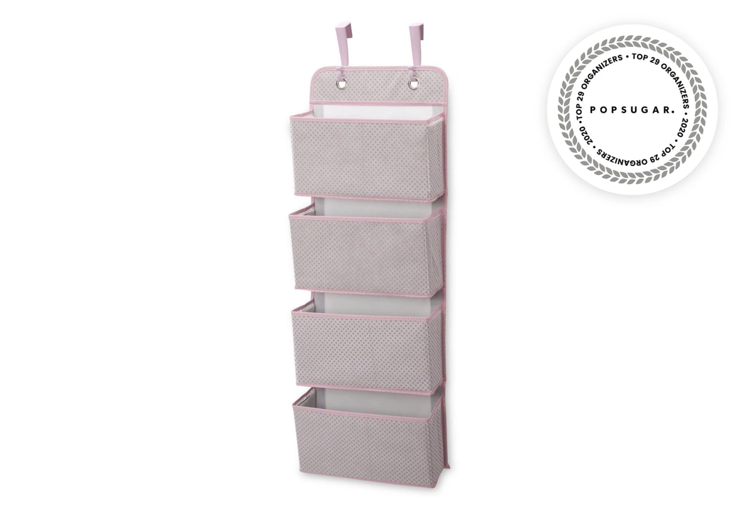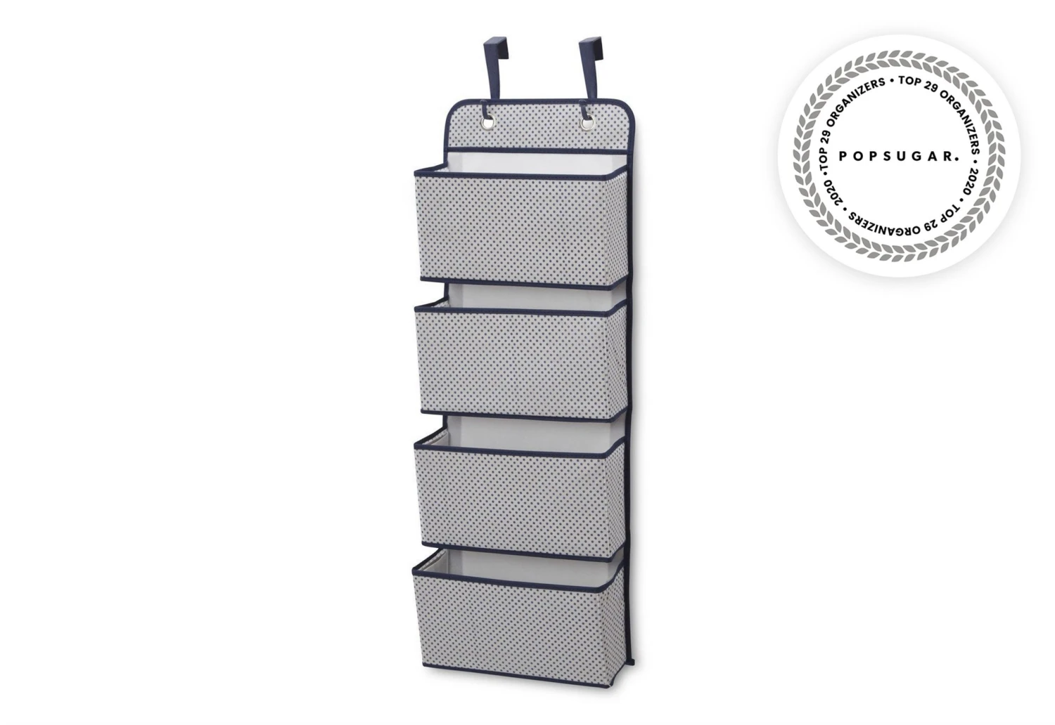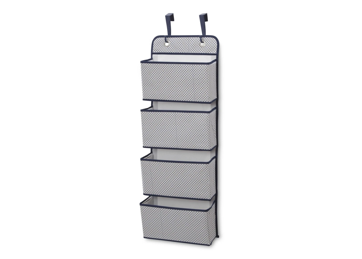 - Hanging storage with subtle print and contrast piping