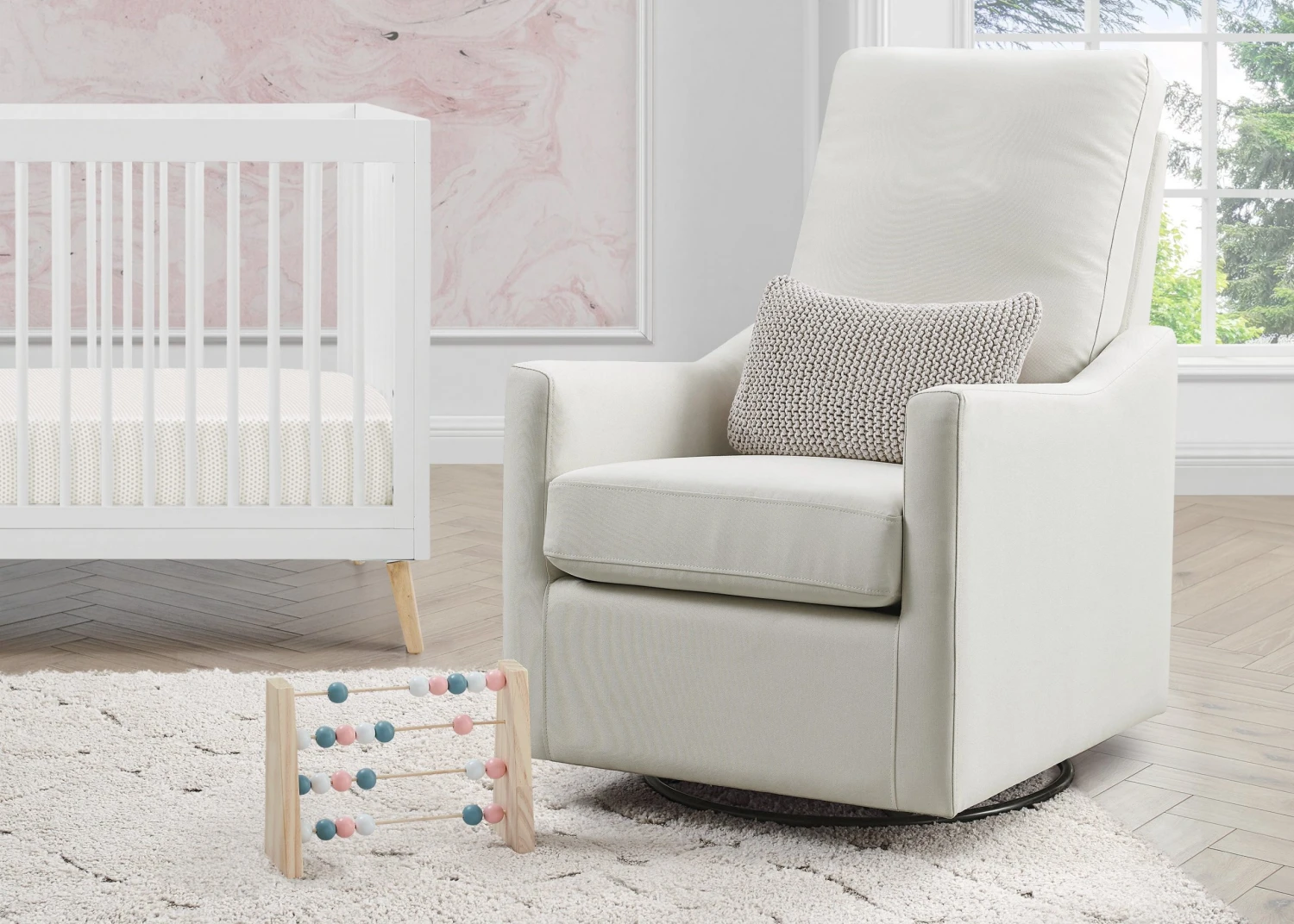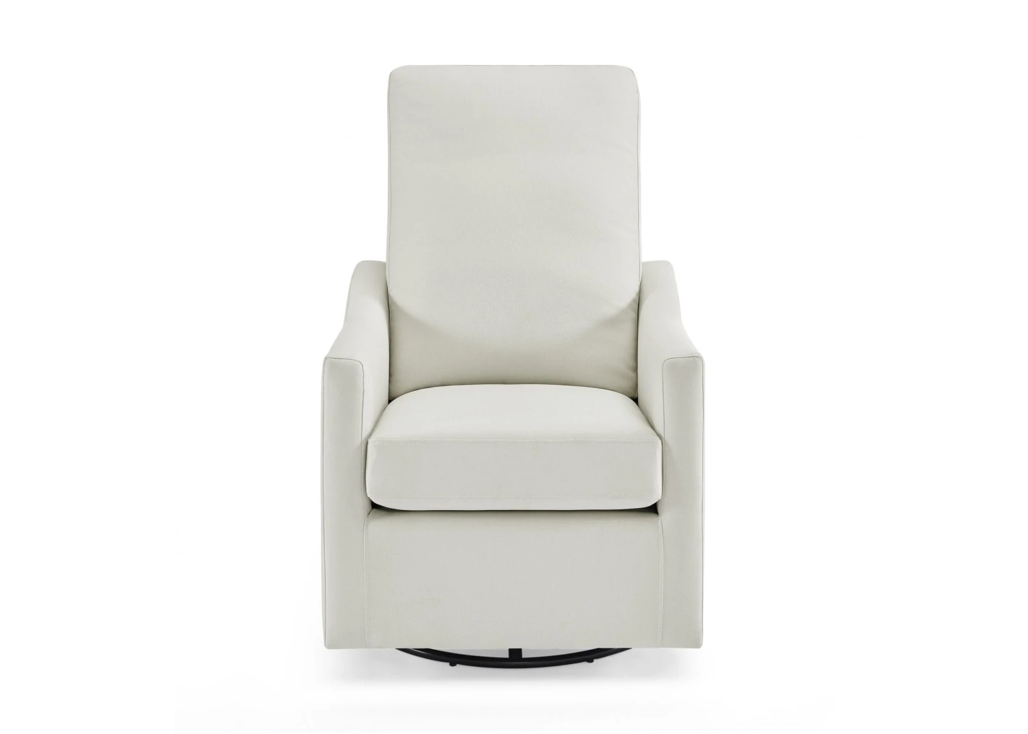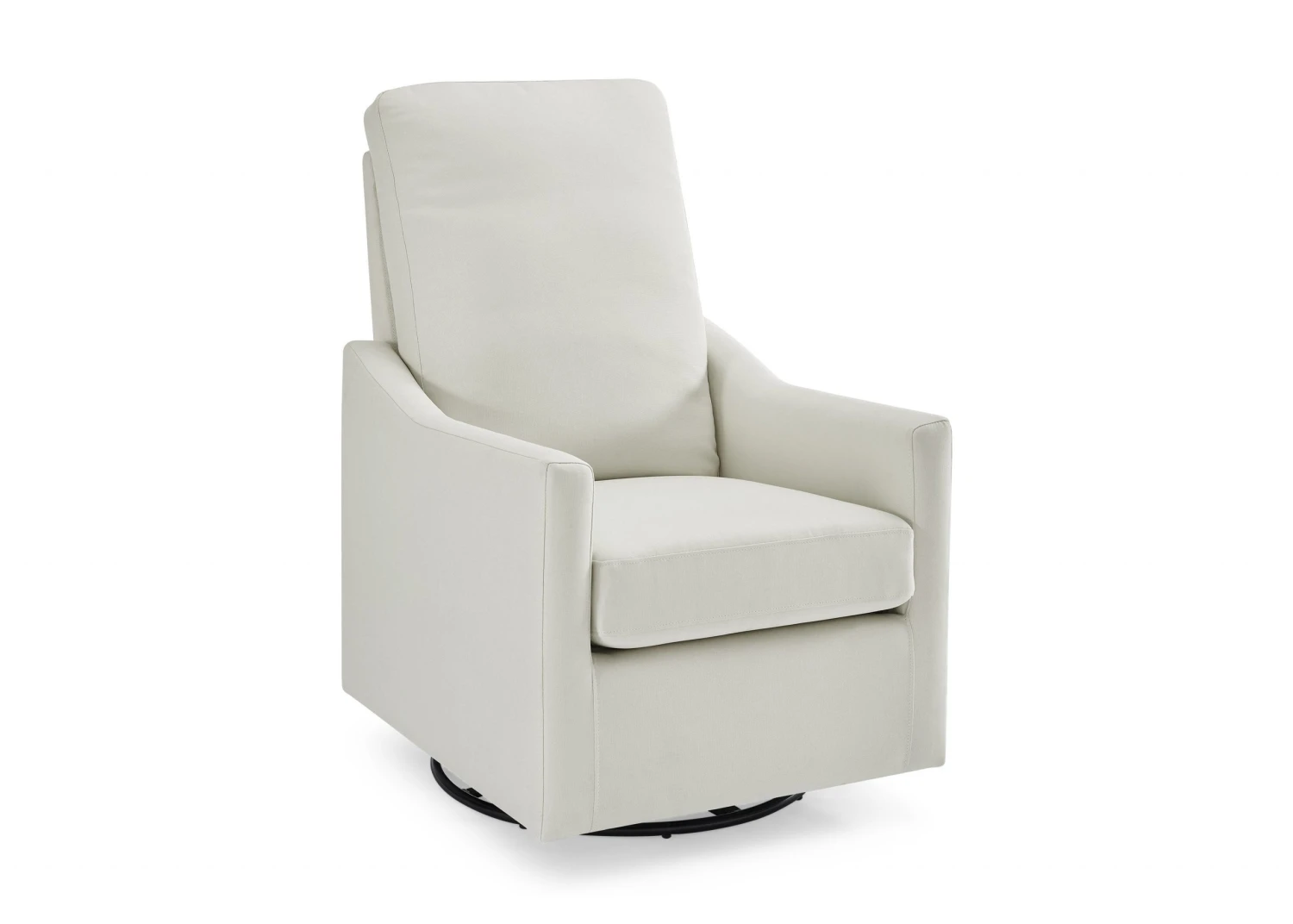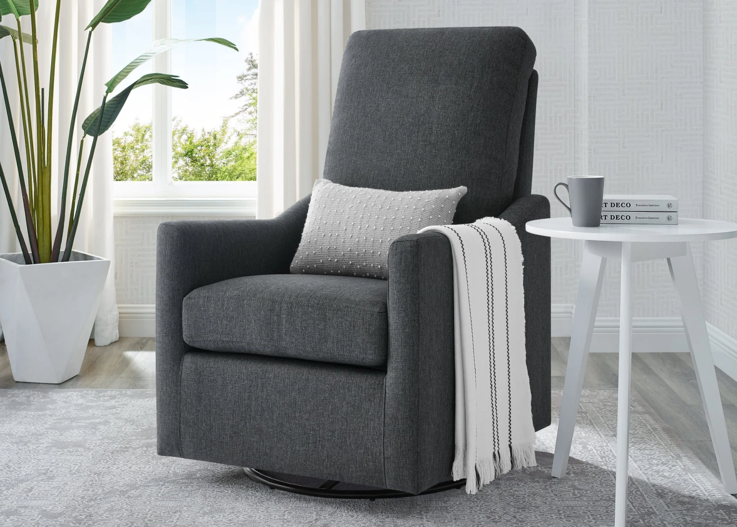 Designed for exceptional comfort, the Adley Nursery Glider Swivel Rocker Chair by Delta Children glides and swivels 360-degrees, making it the most soothing spot to lull baby to sleep. The chair’s whisper quiet movements ensure a serene environment while the soft seat cushion (6″ thick), padded armrests and backrest allow you to sit comfortably for hours. Its modern shape makes it an easy addition to your nursery or living room once your baby gets older. Assembled dimensions: 26.75″W x 37.5″D x 40.25″H. Available in three colors: Charcoal, French Grey and Cream. Removable seat cushion for easy cleaning.