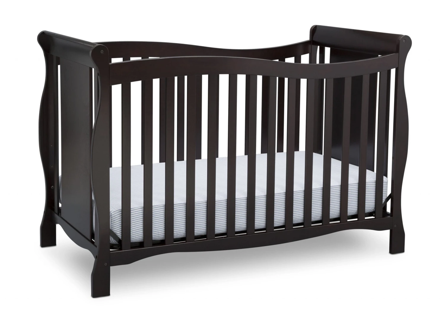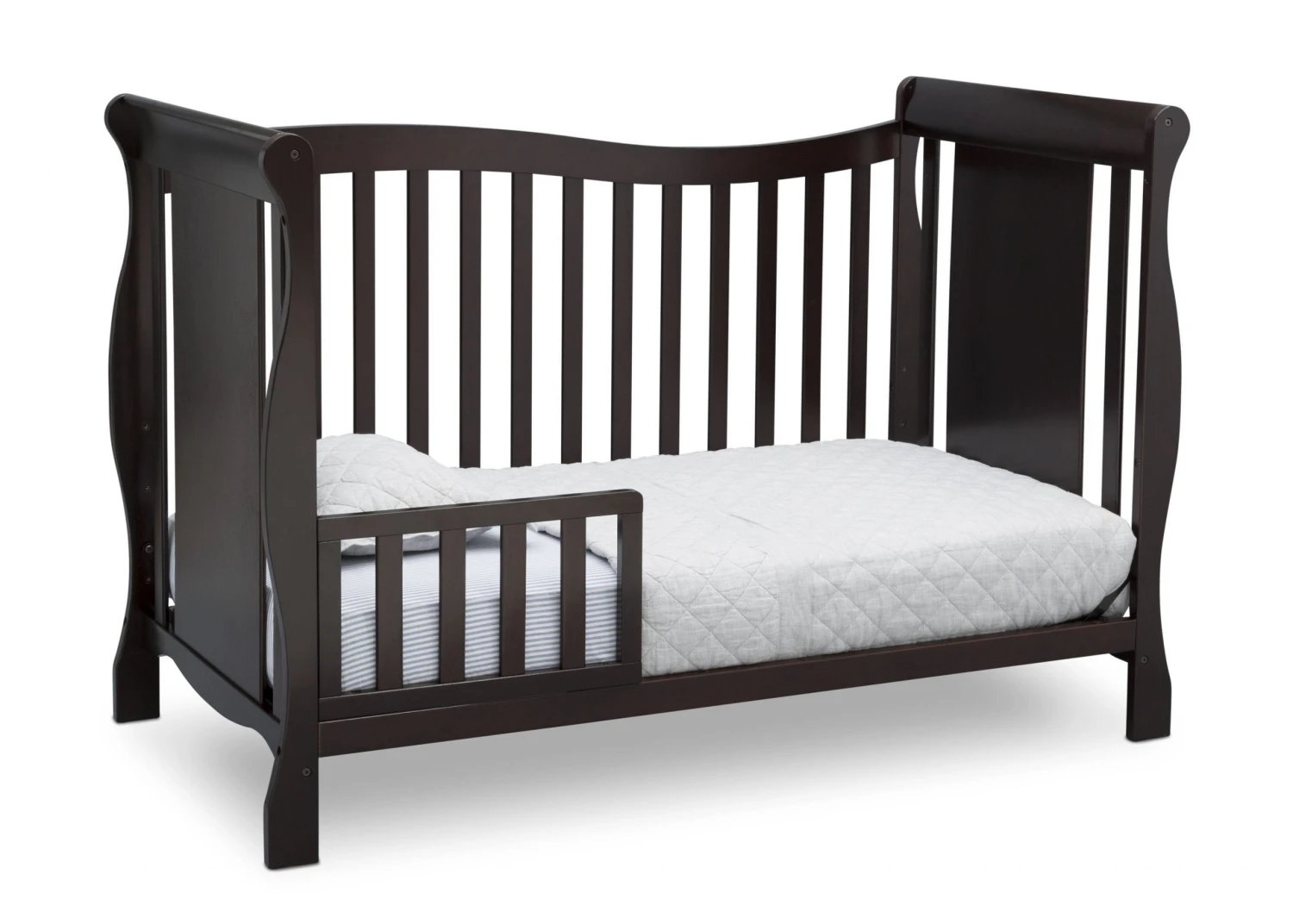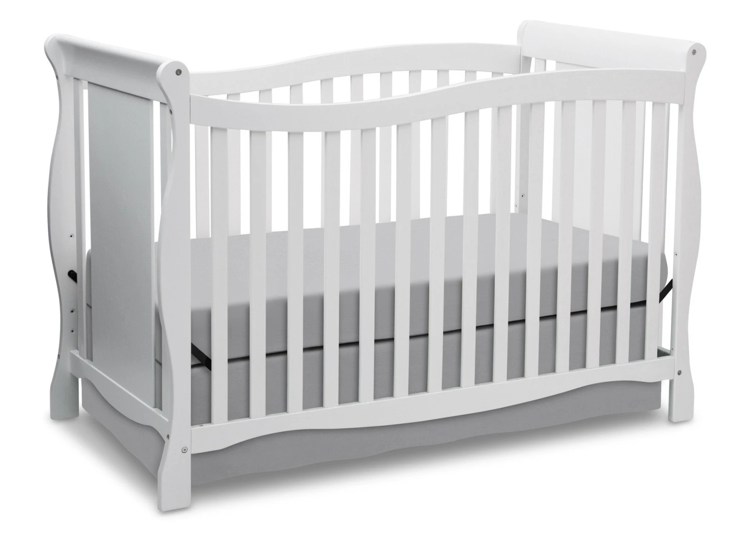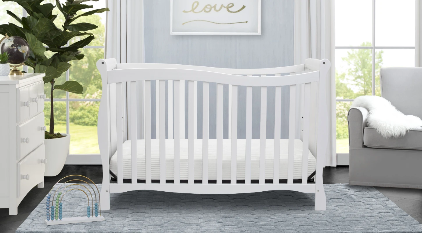 Designed with timeless appeal, the Brookside 4-in-1 Crib from Delta Children is built to grow with your child. Converting from a crib to a toddler bed, daybed, and full bed with headboard and footboard, this classic piece features soft curves and sleek sleigh styling that never goes out of fashion. Meeting all safety standards set by JPMA, parents can rest easy knowing children will sleep safe for years to come.