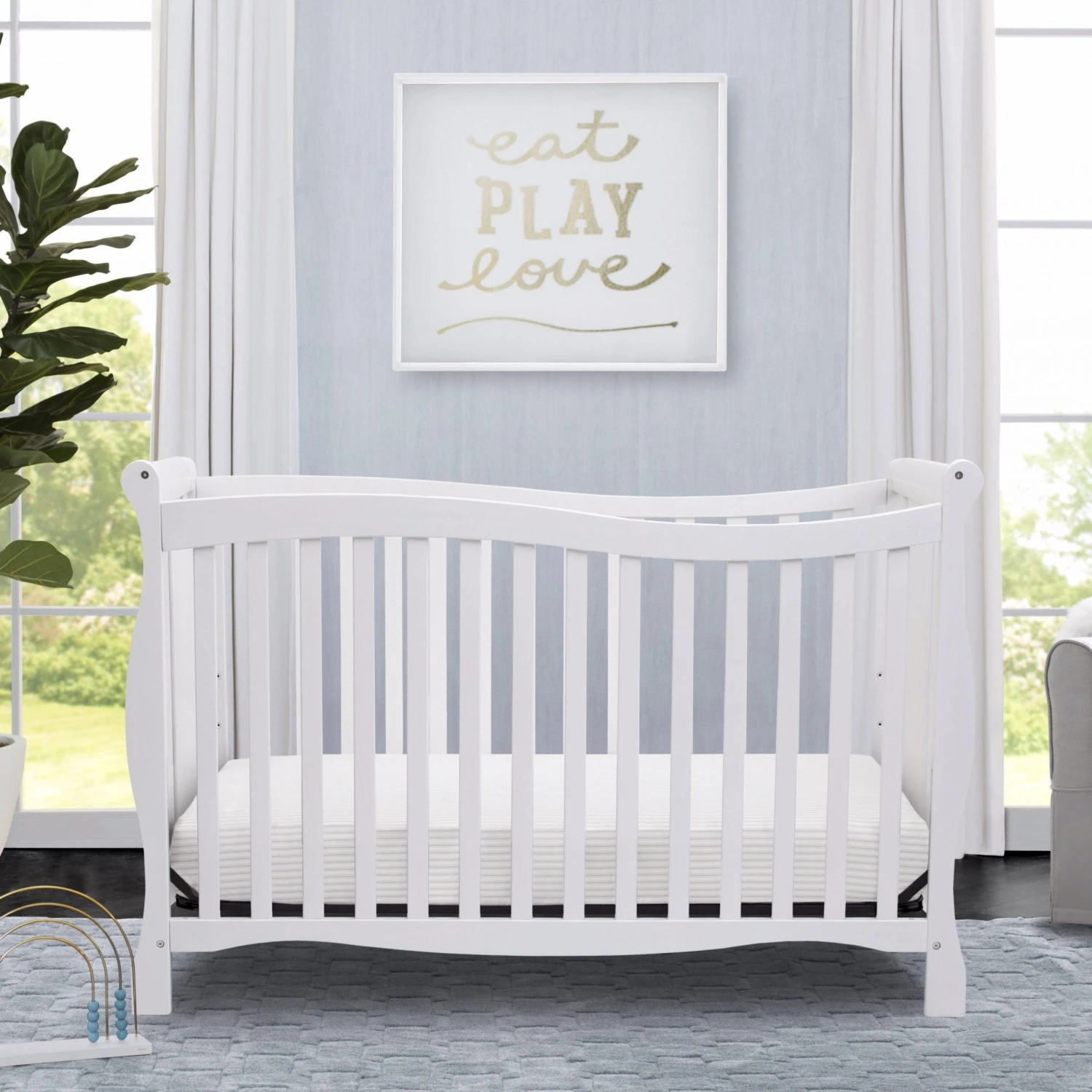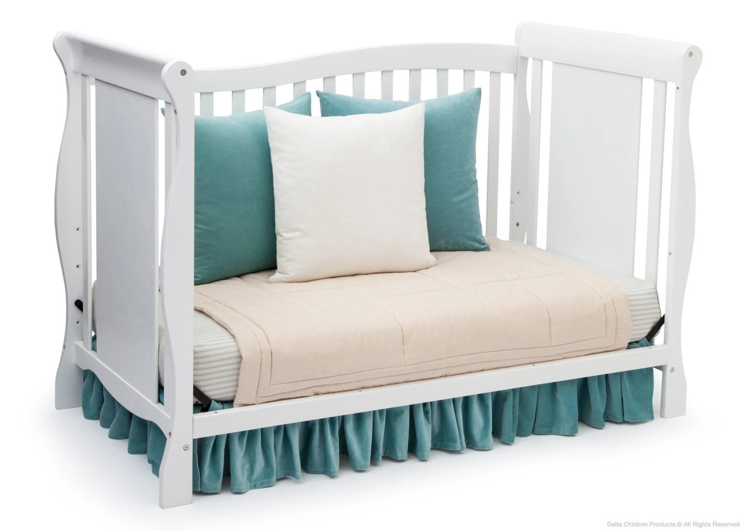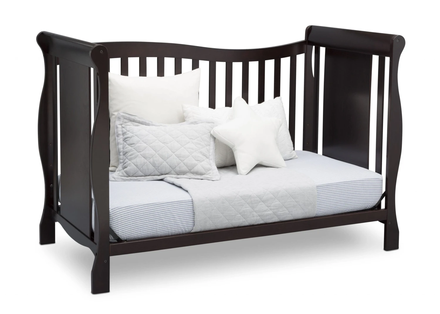 Designed with timeless appeal, the Brookside 4-in-1 Crib from Delta Children is built to grow with your child. Converting from a crib to a toddler bed, daybed, and full bed with headboard and footboard, this classic piece features soft curves and sleek sleigh styling that never goes out of fashion. Meeting all safety standards set by JPMA, parents can rest easy knowing children will sleep safe for years to come.