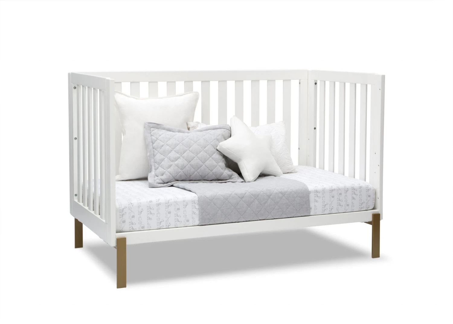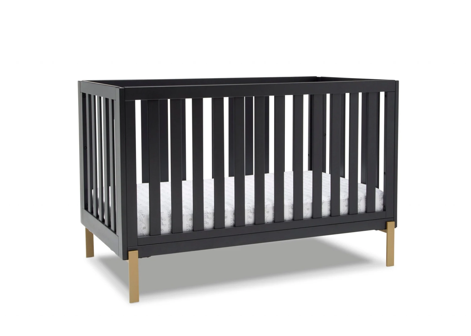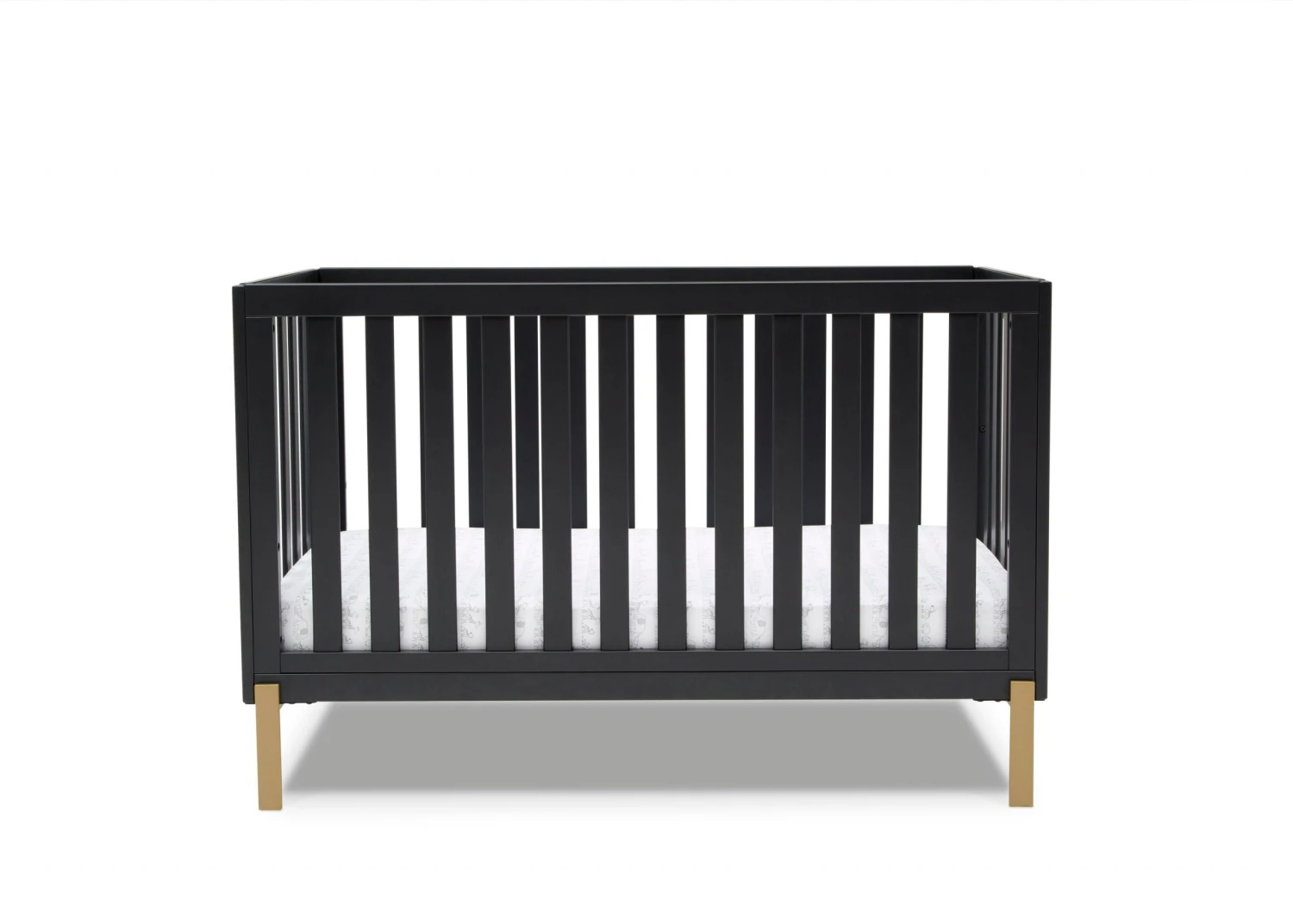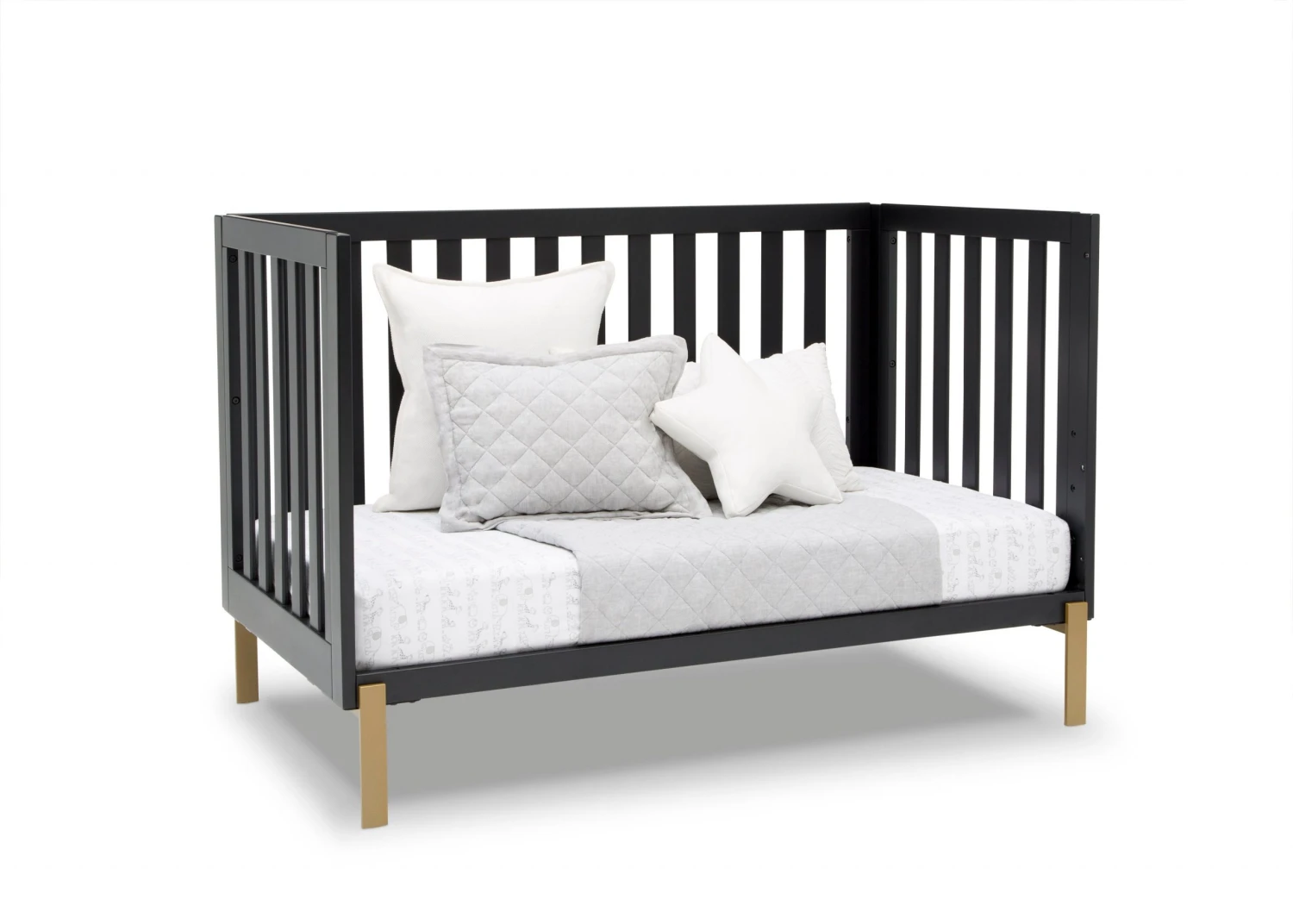 Shake things up in your nursery with the mixed material design of the Hendrix 4-in-1 Convertible Baby Crib by Delta Children. The pine wood construction brings warmth while the shiny bronze legs add a modern, rock and roll flair. Designed to accommodate your growing child, this crib features a three-position adjustable mattress support. Set the mattress at the highest height for your newborn baby, and lower when they begin to sit or stand. And thanks to an easy-to-use Toddler Guardrail #0094 (sold separately), this crib isn’t just a bronzed beauty, it’s the only bed your little one will need. Transform it into a toddler bed when the time is right, and then to a stylish daybed when they’re ready for a little more independence. Underneath the crib there’s enough space to fit the coordinating Under Crib Storage Drawer #W100950-130 (sold separately).