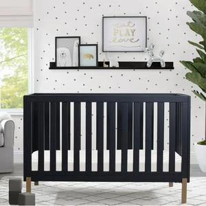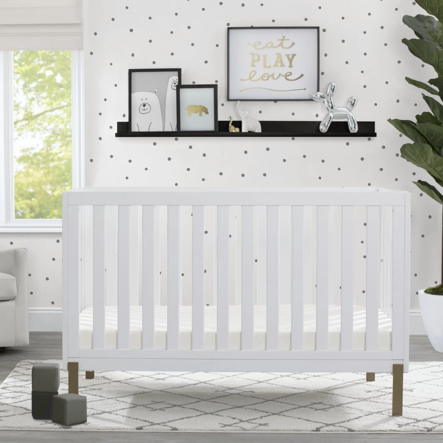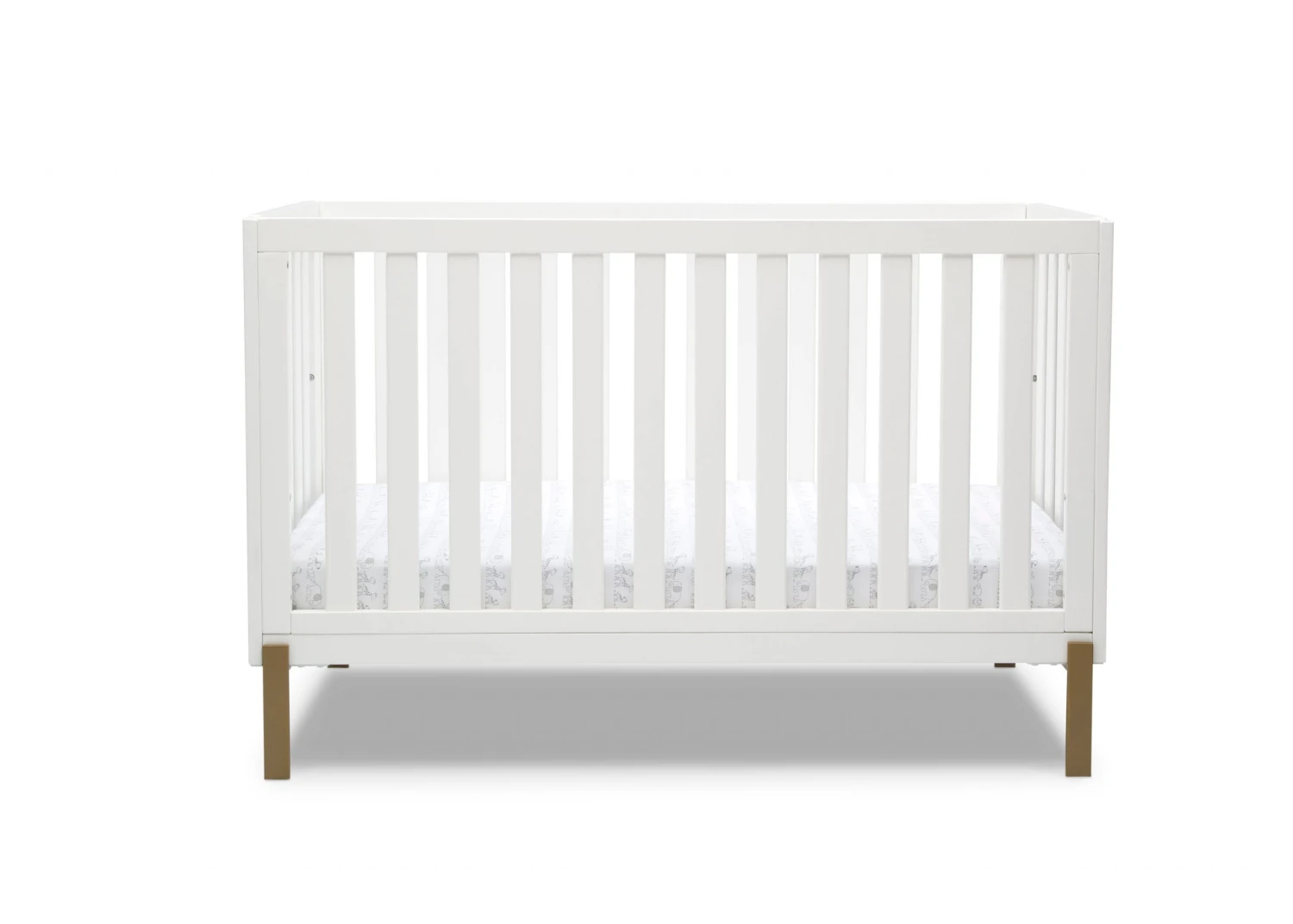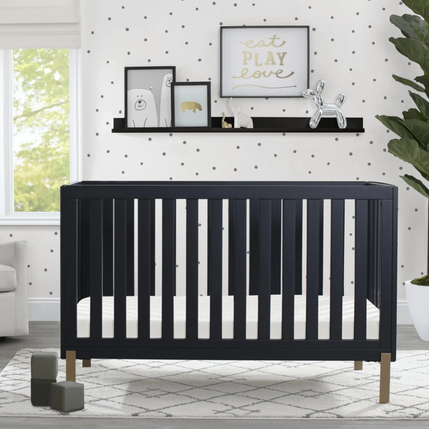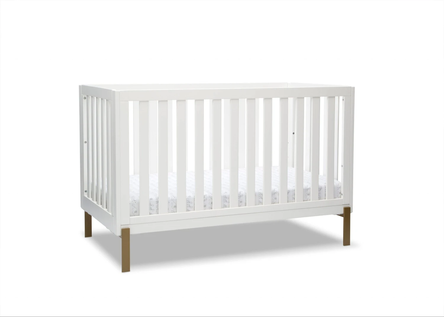 Shake things up in your nursery with the mixed material design of the Hendrix 4-in-1 Convertible Baby Crib by Delta Children. The pine wood construction brings warmth while the shiny bronze legs add a modern, rock and roll flair. Designed to accommodate your growing child, this crib features a three-position adjustable mattress support. Set the mattress at the highest height for your newborn baby, and lower when they begin to sit or stand. And thanks to an easy-to-use Toddler Guardrail #0094 (sold separately), this crib isn’t just a bronzed beauty, it’s the only bed your little one will need. Transform it into a toddler bed when the time is right, and then to a stylish daybed when they’re ready for a little more independence. Underneath the crib there’s enough space to fit the coordinating Under Crib Storage Drawer #W100950-130 (sold separately).