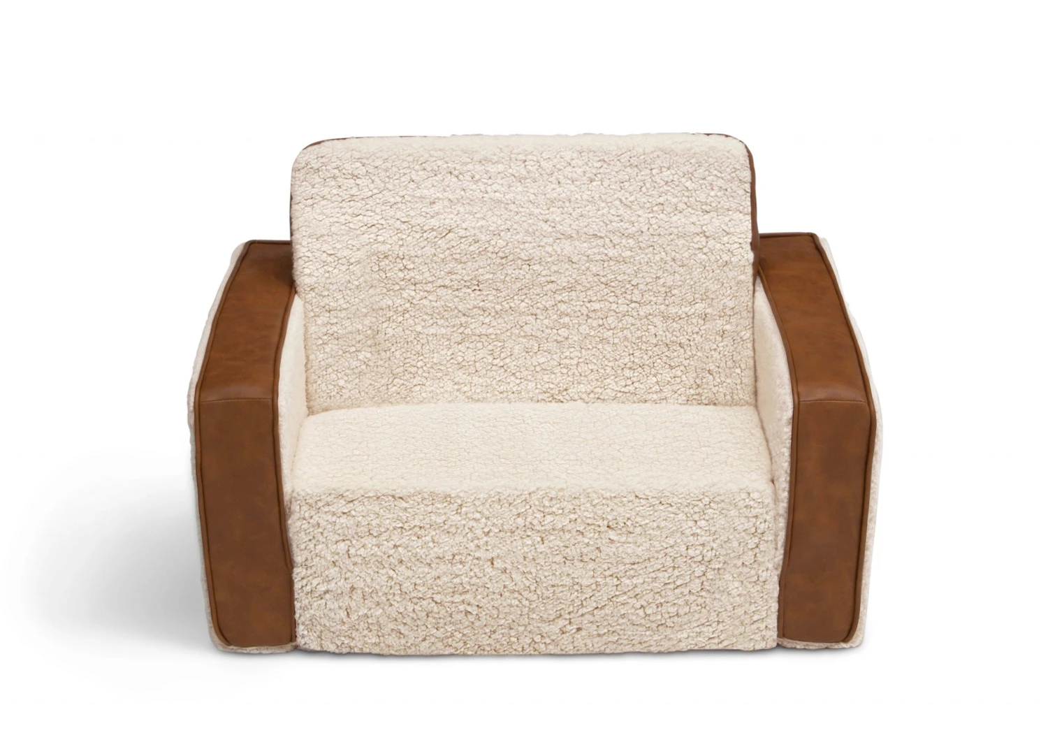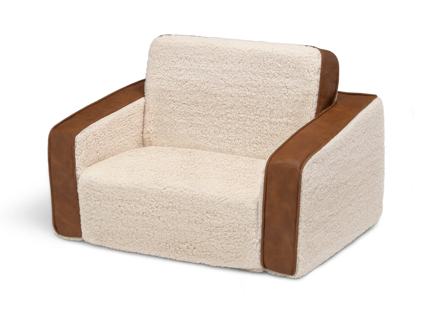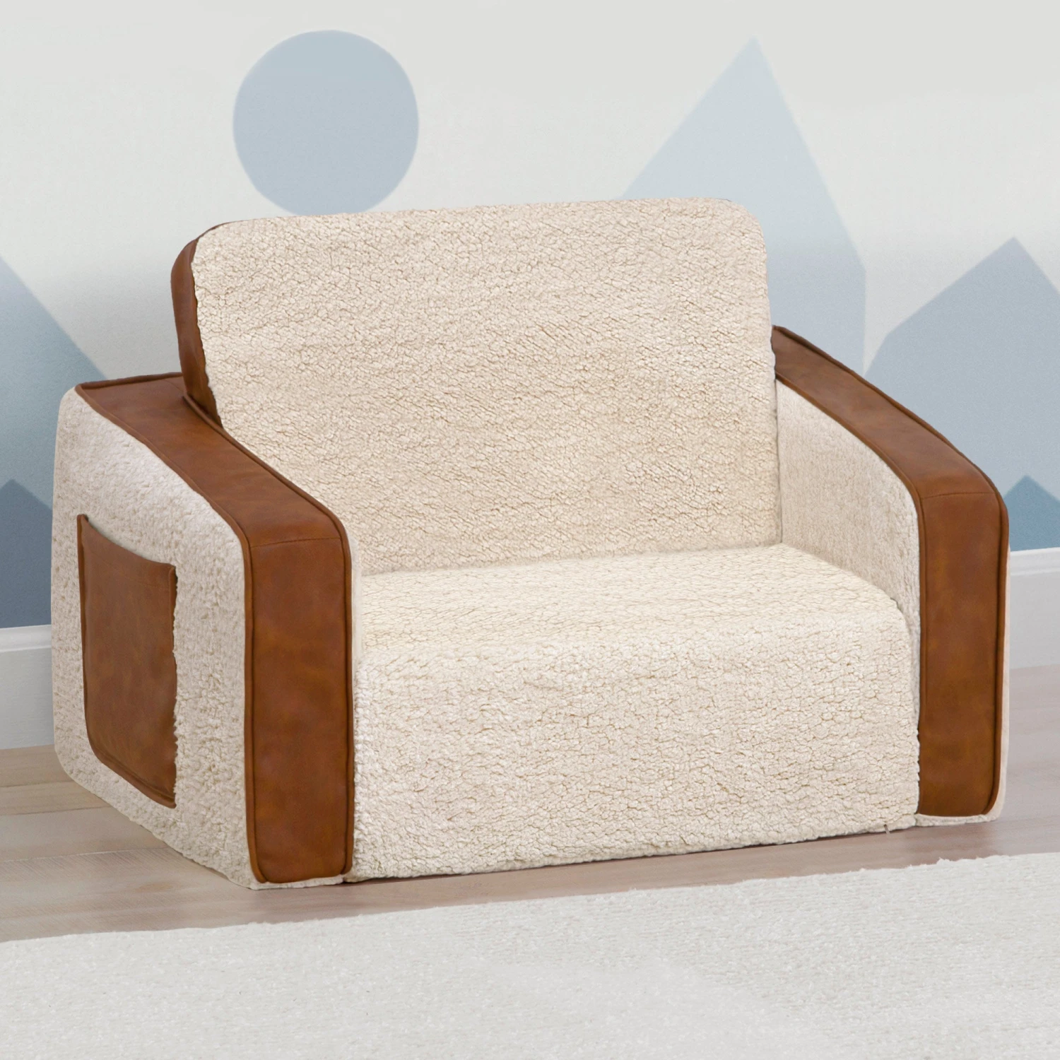 The Cozee Flip-Out Sherpa 2-in-1 Convertible Chair to Lounger by Delta Children is a cozy chair by day, laid-back lounger by night. This convertible seat easily flips open to reveal multiple ways for your child to relax–they’ll love to sit and read or watch their favorite movies on the chair but when it’s time for a nap, this seat folds out into a comfy sleeper bed. Big enough to fit two small kids comfortably in chair mode, it’s light enough to move around the house and is ideal for your children to share during playtime or sleepovers. The super-soft Sherpa and faux leather slipcover with easy-to-reach side pocket creates the ultimate retreat for your little one. The supportive foam construction will keep its shape and provides all-day comfort. Designed to ship in a super-small box, this lightweight foam kids’ chair and lounger may take up to 24 hours to fully expand once unboxed. Machine-washable slipcover zips off for easy cleaning. Recommended for ages 18 months+.