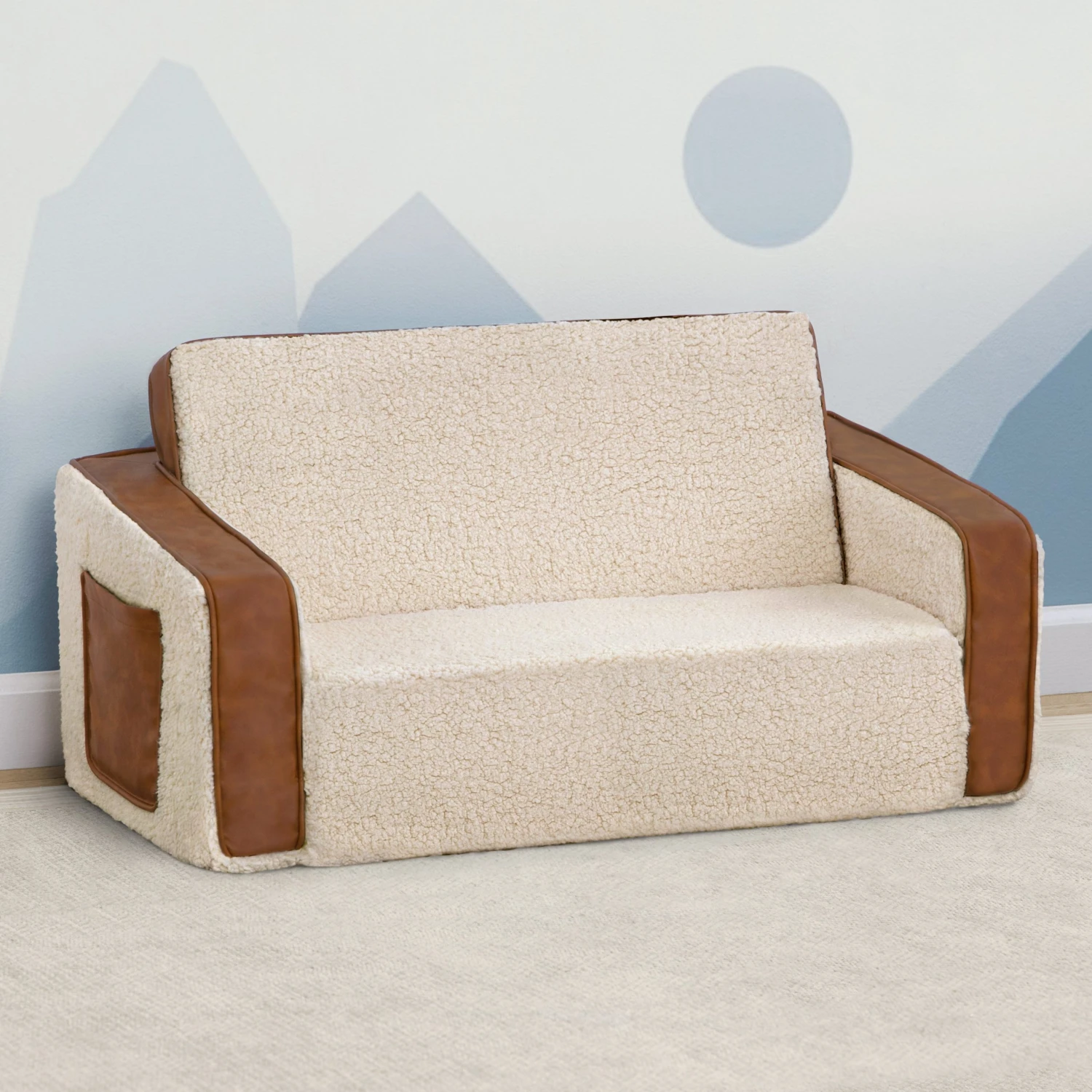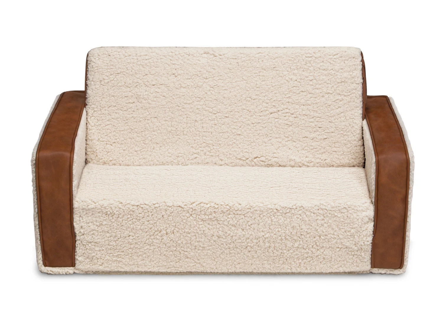 The Cozee Flip-Out Sherpa 2-in-1 Convertible Sofa to Lounger by Delta Children is a cozy couch by day, laid-back lounger by night. This convertible sofa easily flips open to reveal multiple ways for your child to relax–they’ll love to sit and read or watch their favorite movies on the sofa but when it’s time for a nap, this seat folds out into a comfy sleeper bed. Big enough to fit three small kids comfortably in sofa mode, it’s light enough to move around the house and is ideal for your children to share during playtime or sleepovers. The super-soft Sherpa and faux leather slipcover with easy-to-reach side pocket creates the ultimate retreat for your little one. The supportive foam construction will keep its shape and provides all-day comfort. Designed to ship in a super-small box, this lightweight foam kids’ sofa and lounger may take up to 24 hours to fully expand once unboxed. Machine-washable slipcover zips off for easy cleaning. Recommended for ages 18 months+.