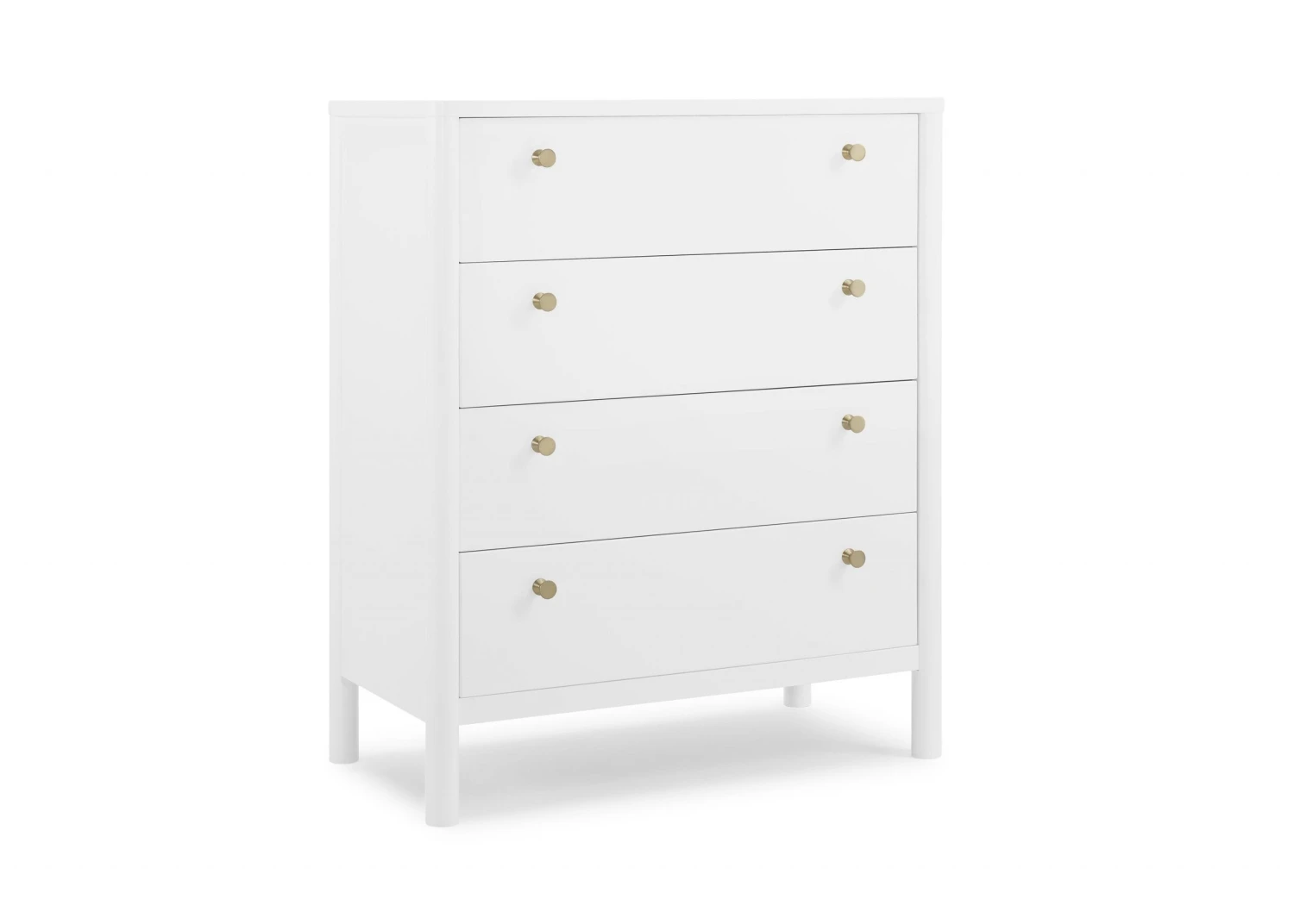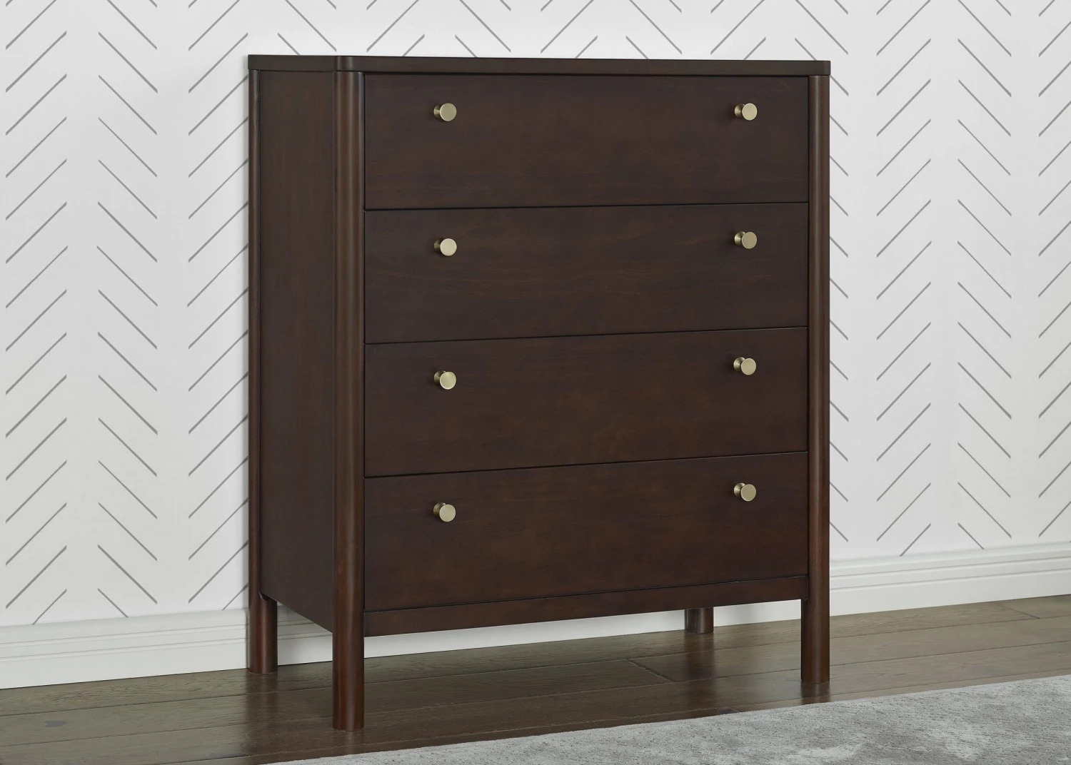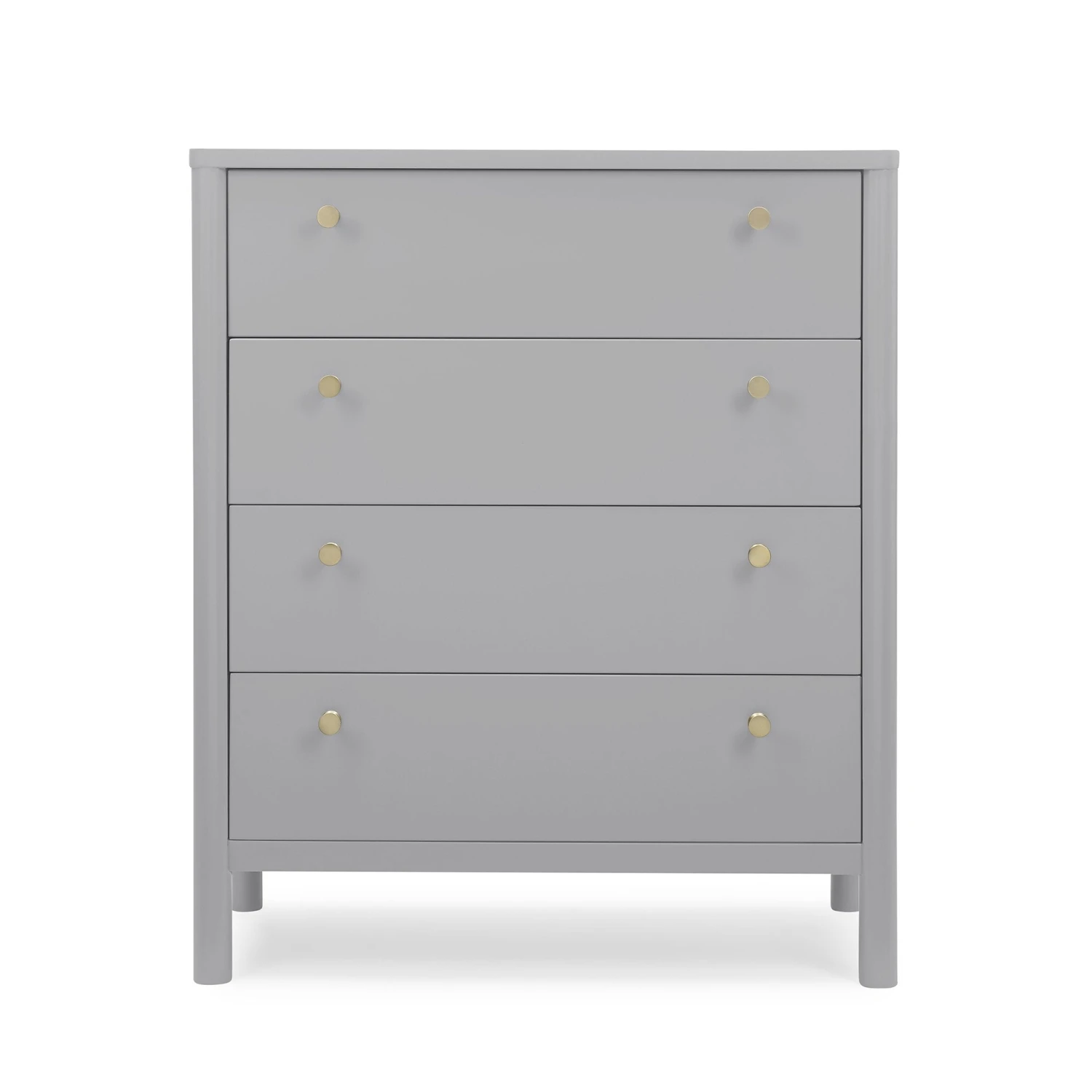 The Remy 4 Drawer Chest by Delta Children will instantly elevate your nursery with its mid-century modern style. Our updated take on retro features clean lines, brass knobs and four spacious soft-close drawers framed by cylindrical posts. Pair this tall chest with other pieces in the Remy Collection for a coordinated look.