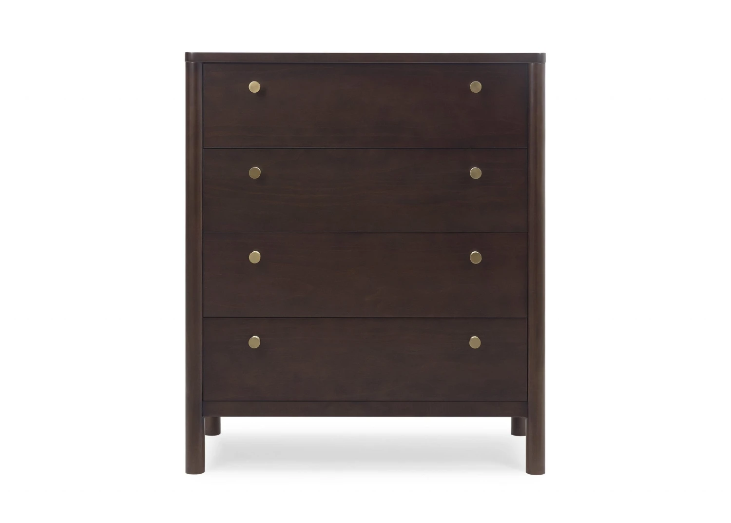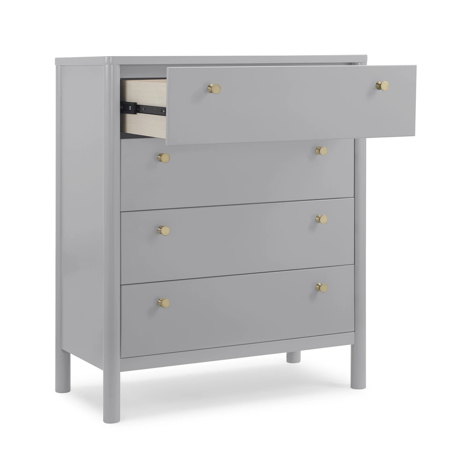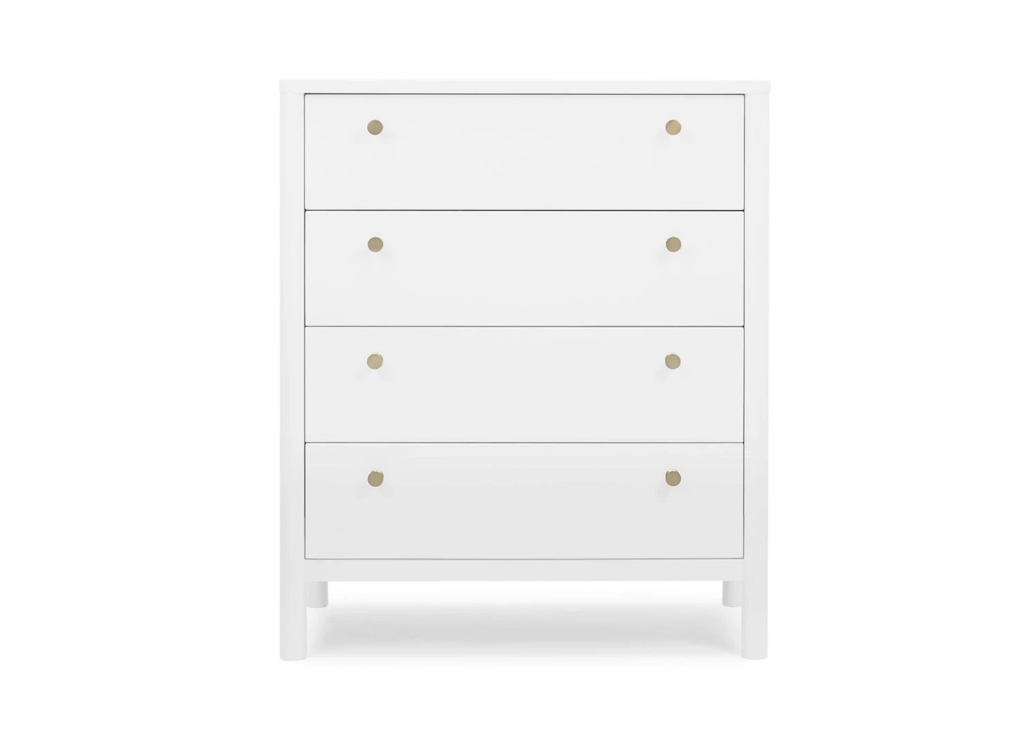 The Remy 4 Drawer Chest by Delta Children will instantly elevate your nursery with its mid-century modern style. Our updated take on retro features clean lines, brass knobs and four spacious soft-close drawers framed by cylindrical posts. Pair this tall chest with other pieces in the Remy Collection for a coordinated look.