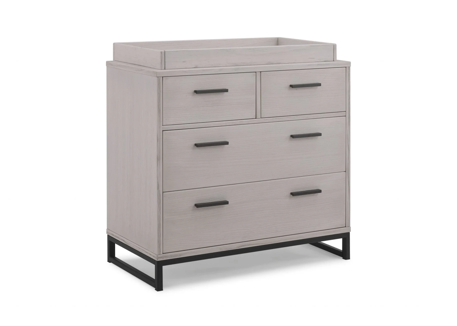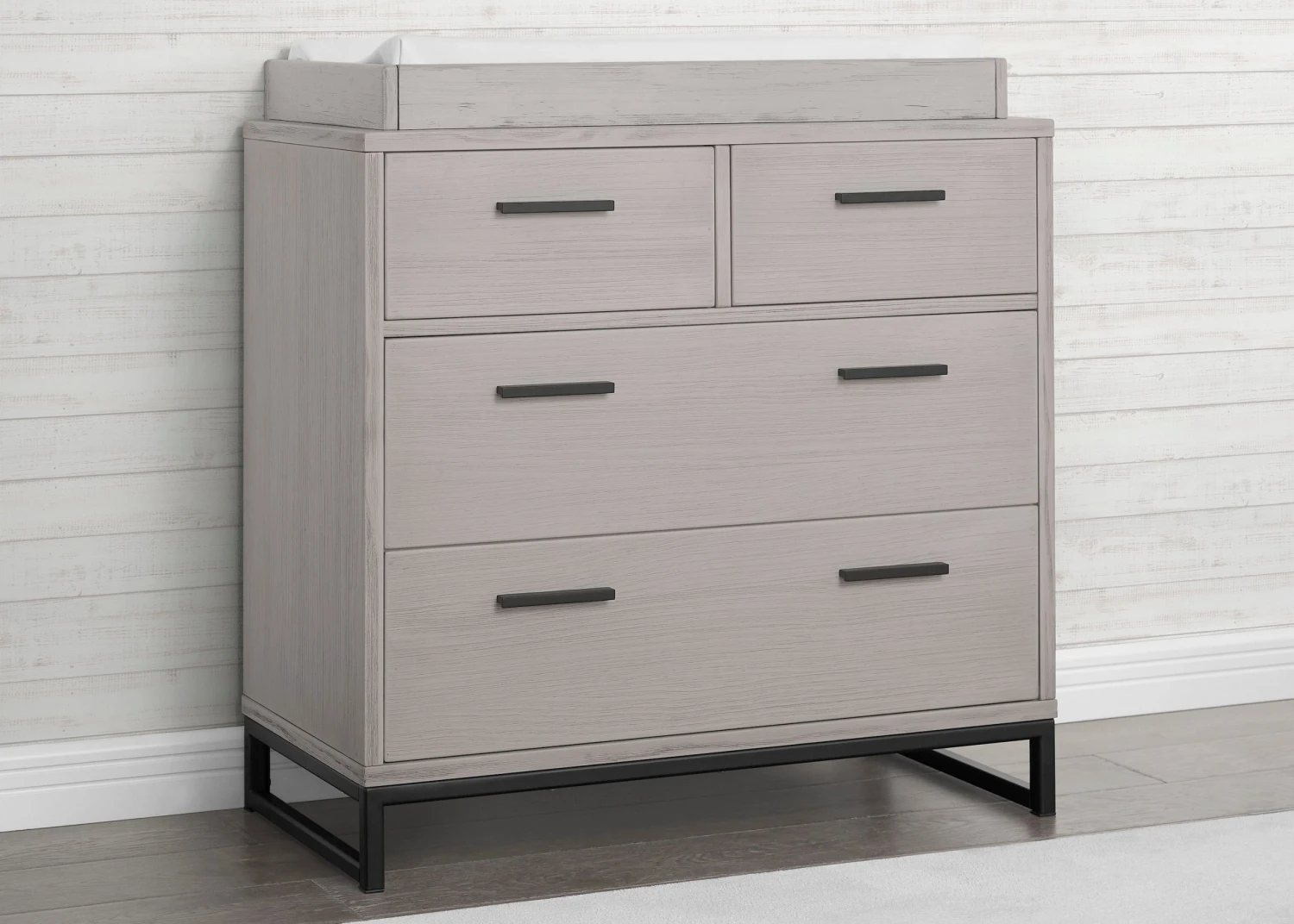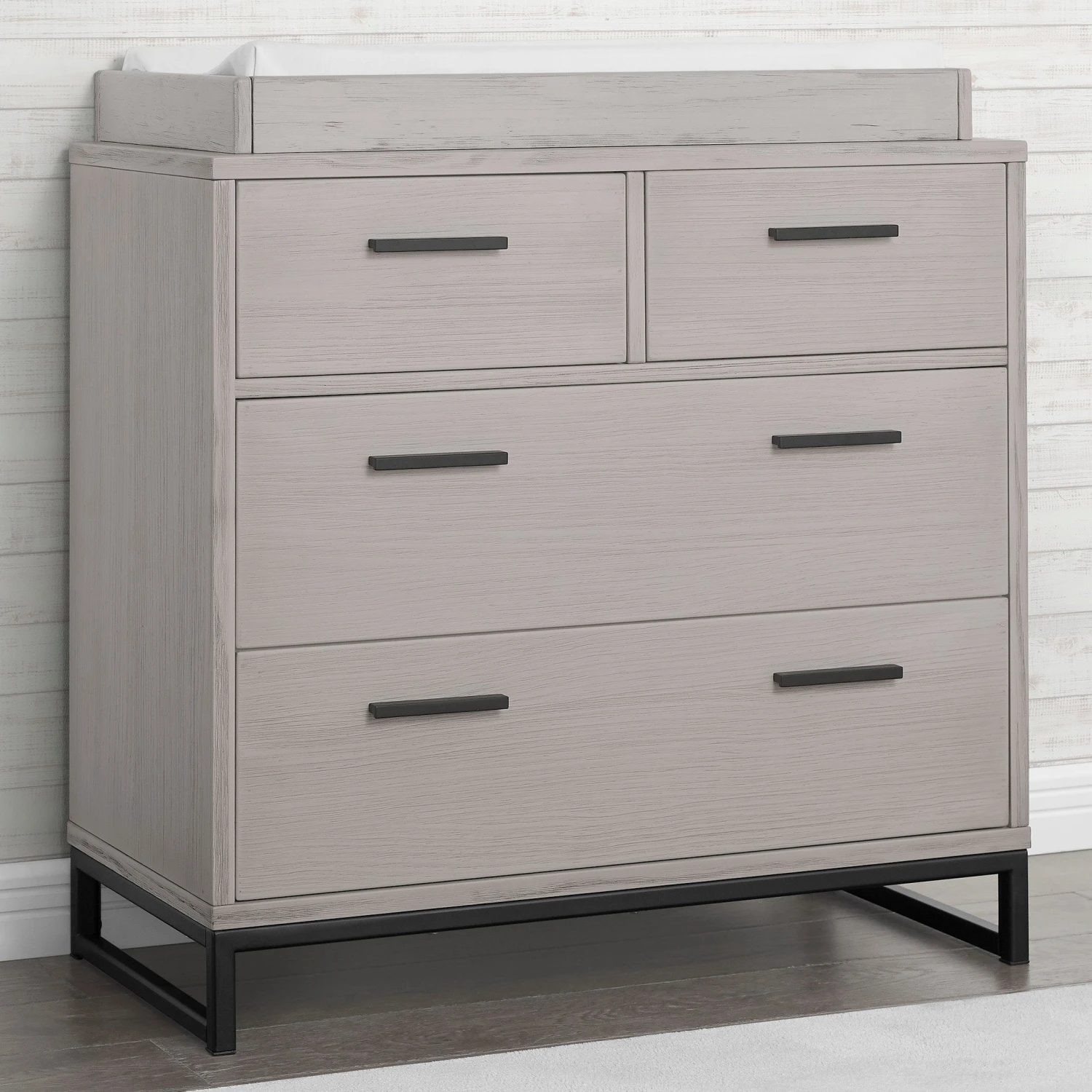 The Foundry 4 Drawer Dresser with Changing Top by Simmons Kids elevates the look of any nursery or kids’ bedroom. Fun and on-trend, the Foundry Dresser boasts a bold, contrasting look with its rustic, softy textured hand-applied finish and sleek matte black metal base and drawer pulls. The Foundry Dresser includes a removable changing top that creates the perfect space for diaper changing sessions now and is easily detachable, so you can create a more grown-up space later on. Pair this dresser with other pieces in the Simmons Kids Foundry Collection for a coordinated look. Given the hand applied nature of this baby crib’s finish, variations in the wood are to be expected and celebrated