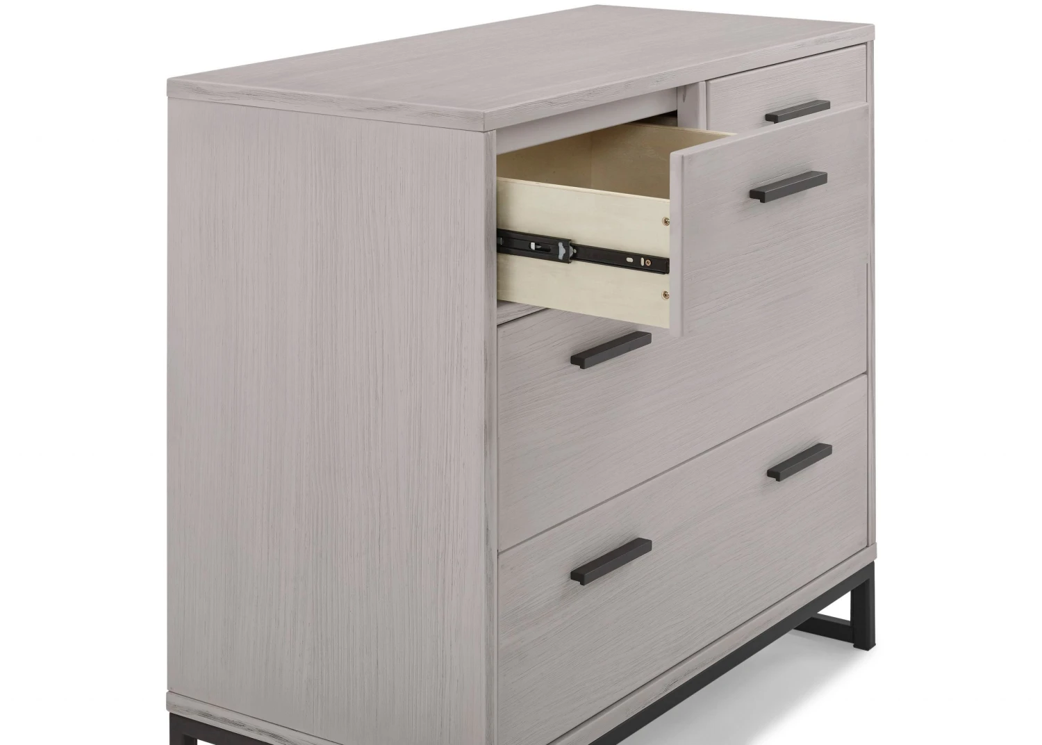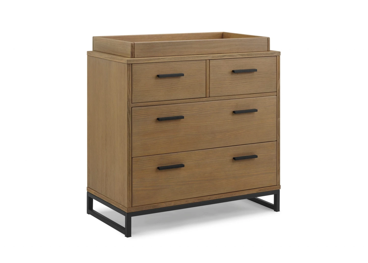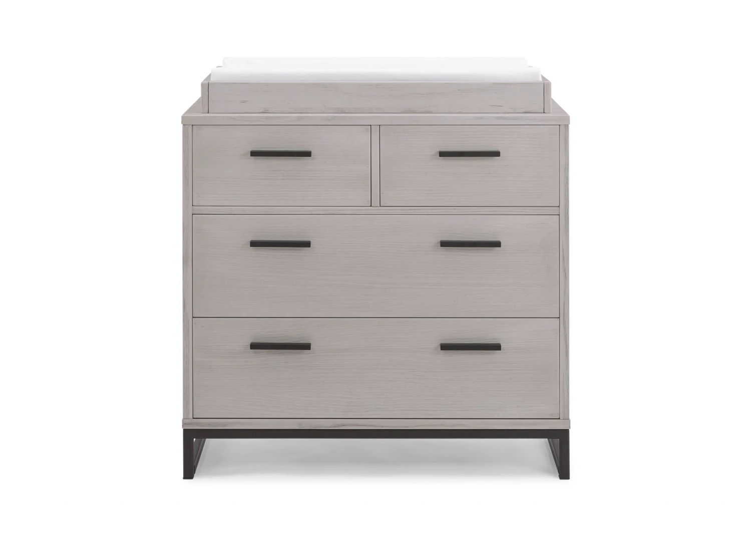 The Foundry 4 Drawer Dresser with Changing Top by Simmons Kids elevates the look of any nursery or kids’ bedroom. Fun and on-trend, the Foundry Dresser boasts a bold, contrasting look with its rustic, softy textured hand-applied finish and sleek matte black metal base and drawer pulls. The Foundry Dresser includes a removable changing top that creates the perfect space for diaper changing sessions now and is easily detachable, so you can create a more grown-up space later on. Pair this dresser with other pieces in the Simmons Kids Foundry Collection for a coordinated look. Given the hand applied nature of this baby crib’s finish, variations in the wood are to be expected and celebrated