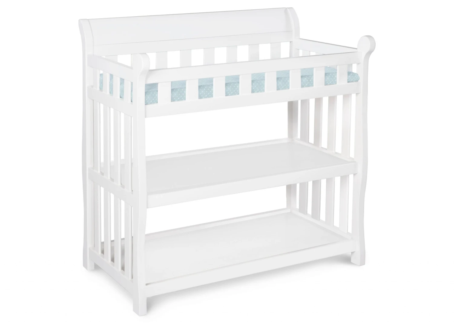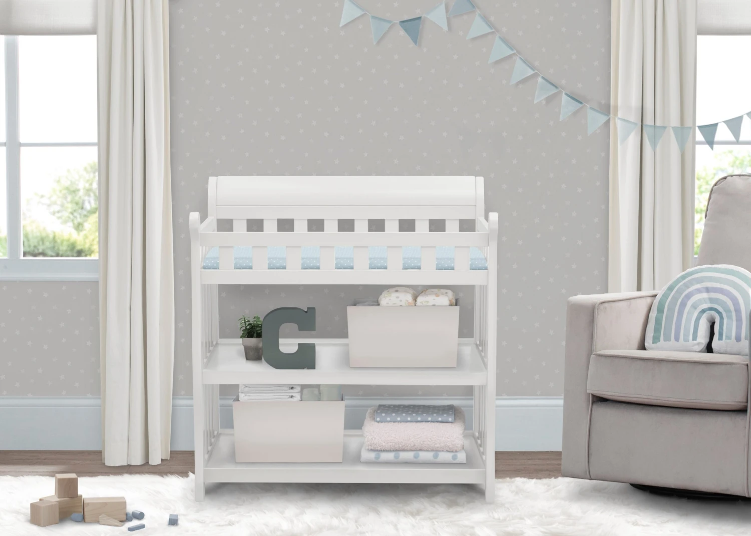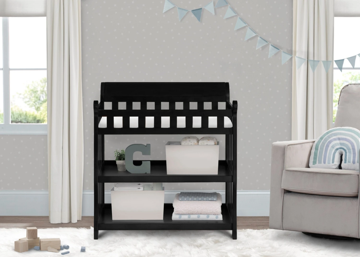 The Eclipse Changing Table with Pad from Delta Children is the perfect addition to your baby’s nursery. This beautiful and functional changing table offers generous open storage to keep necessities at your fingertips. Featuring four high sides for added security while changing or dressing your baby, this baby changing table is both functional and elegant. Water-resistant changing pad and safety strap is included. Coordinates with Delta Children cribs in the same finish.