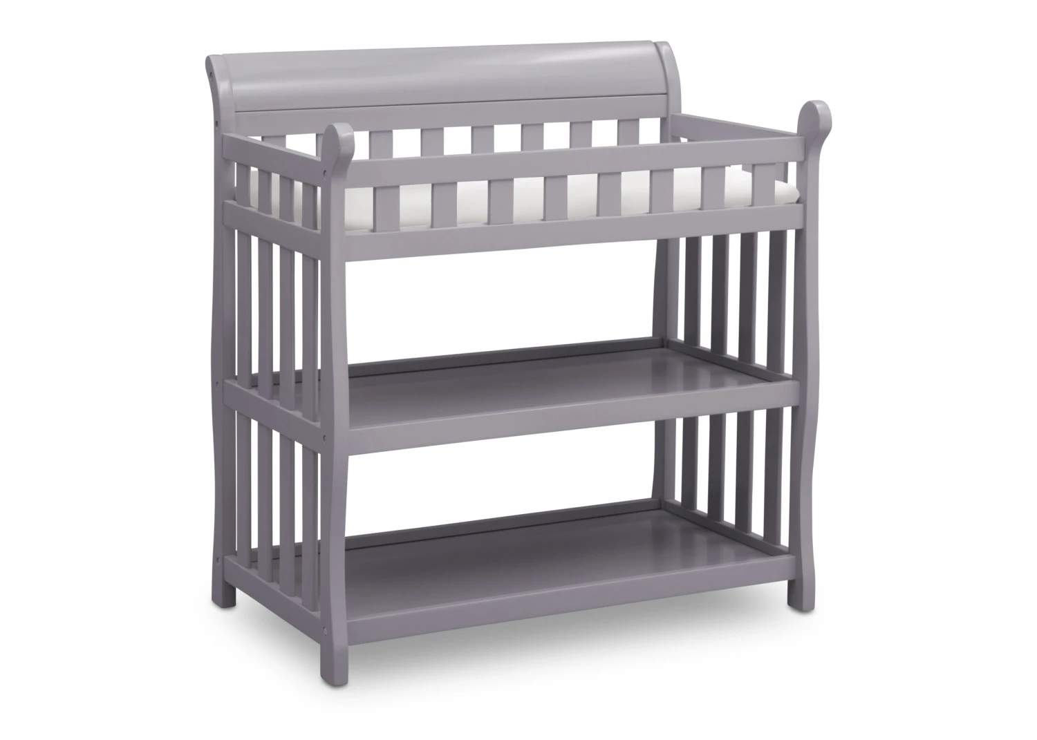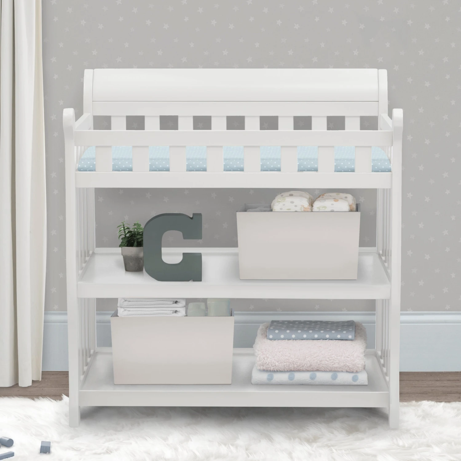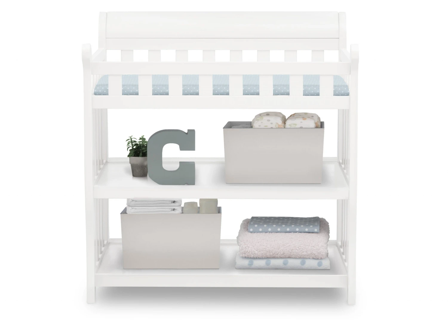 The Eclipse Changing Table with Pad from Delta Children is the perfect addition to your baby’s nursery. This beautiful and functional changing table offers generous open storage to keep necessities at your fingertips. Featuring four high sides for added security while changing or dressing your baby, this baby changing table is both functional and elegant. Water-resistant changing pad and safety strap is included. Coordinates with Delta Children cribs in the same finish.