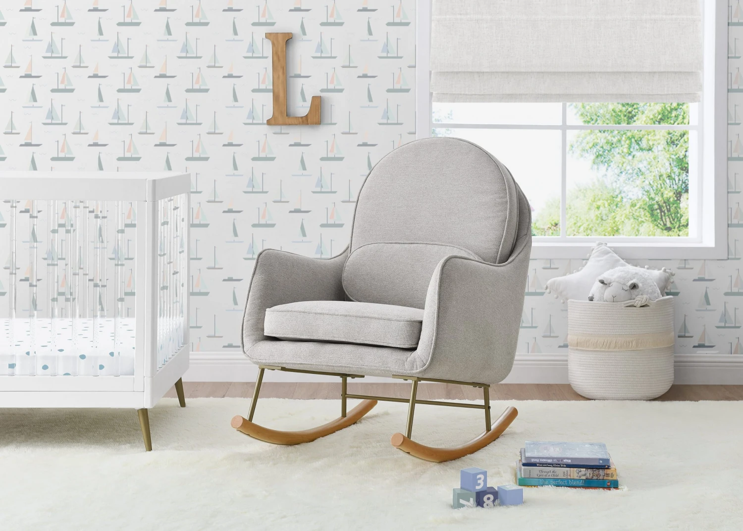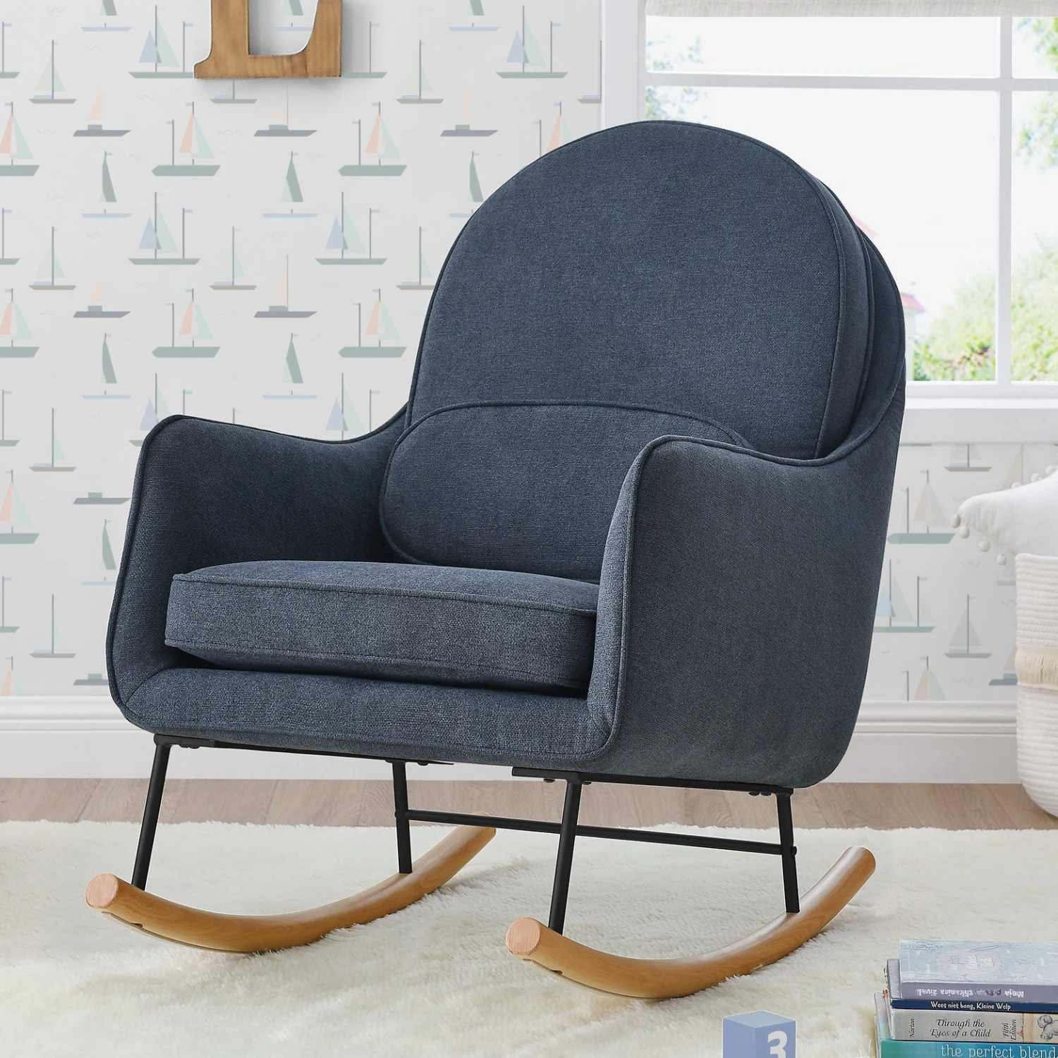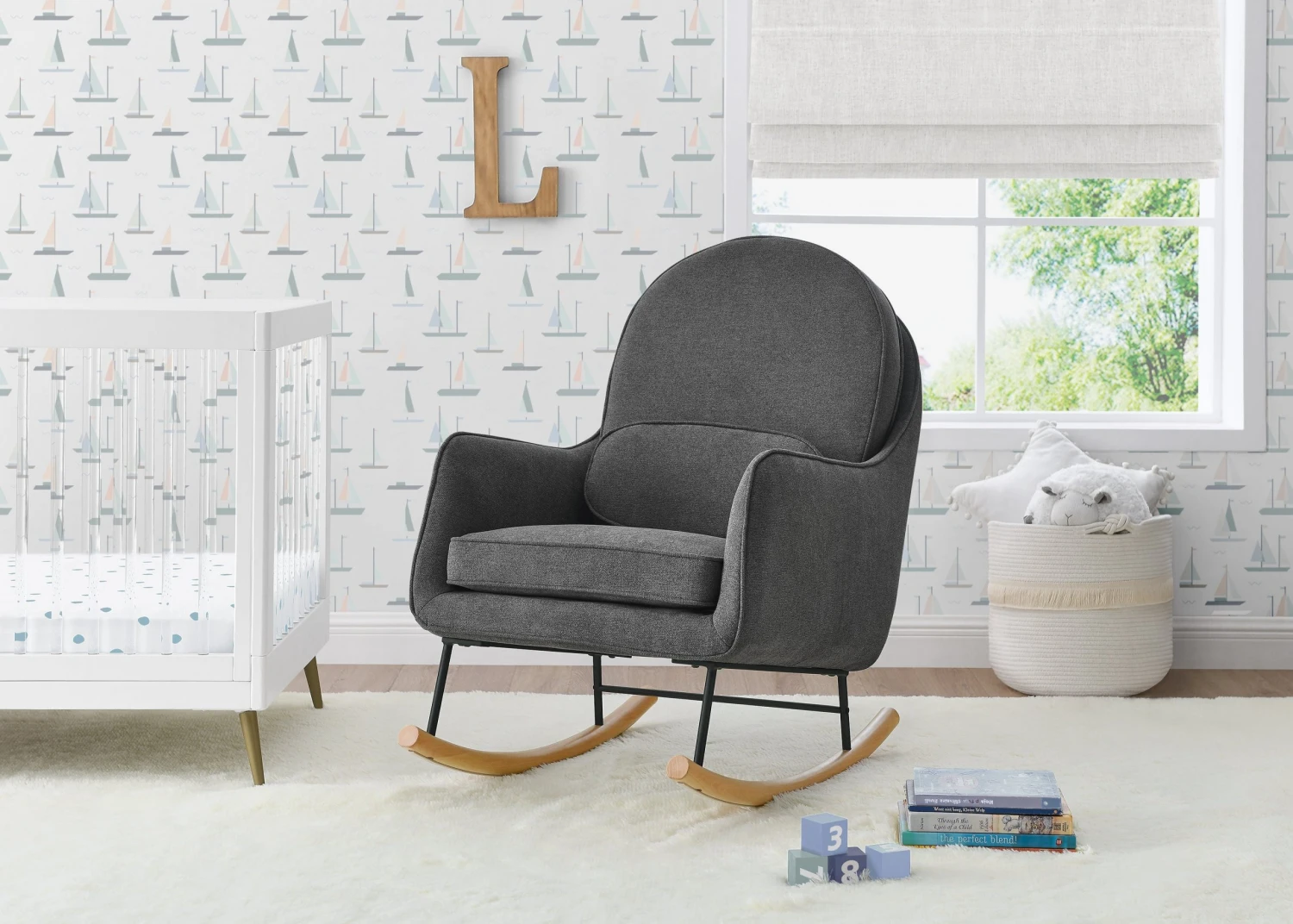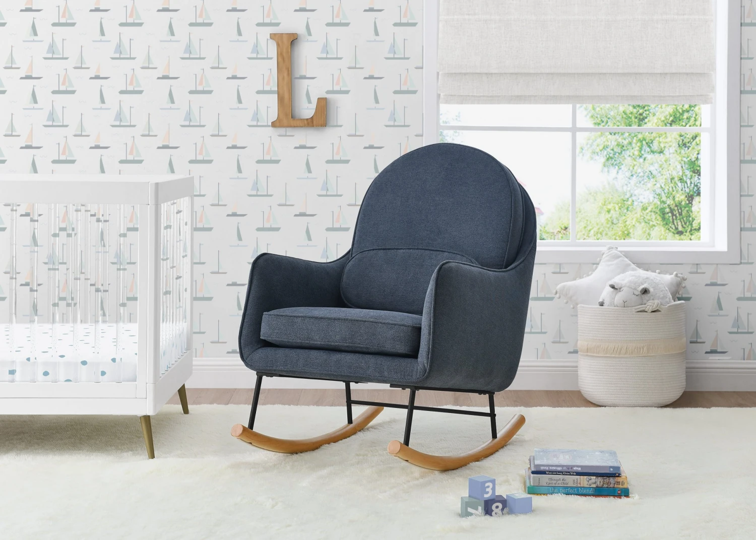 Add a stylish and sustainable seat to your nursery (or any other room in the house!) with this Ella Rocker by Delta Children. Upholstered in LiveSmart Evolve fabric, it brings together three incredible qualities to create a superior performance fabric: recycled fibers, water repellency, and stain resistance. Made with at least 30% of high-quality polyester yarn created from recycled post-consumer plastic bottles, this durable fabric helps divert plastics from landfills. Plus, it’s as comfy and beautiful as it is good for the environment. Designed with modern rounded curves, a metal base and solid wood feet, this rocking chair includes a movable lumbar cushion for additional support. The perfect choice for busy families, its stain-resistant and moisture repelling abilities make it the smart choice for high traffic areas like the nursery or living room. Now, you can live worry-free from stains or spills AND be a part of positive change! Pair with the coordinating Ella Ottoman to complete the look. Available in Limestone, Stone Grey and Slate Blue.