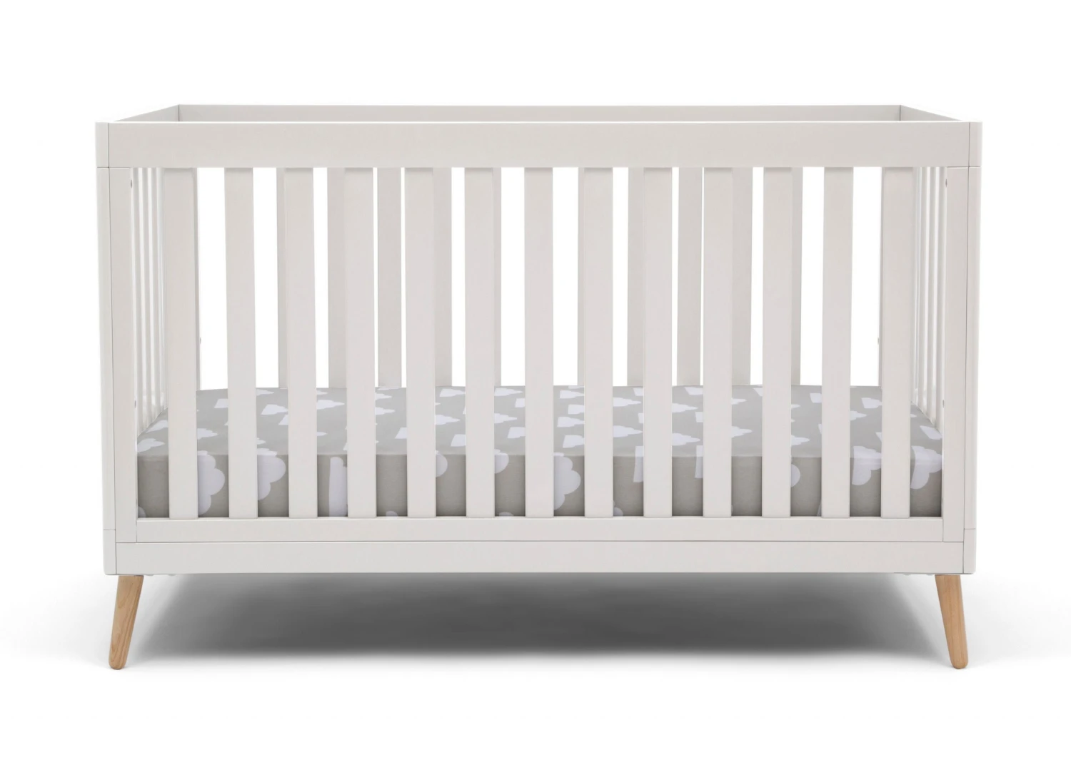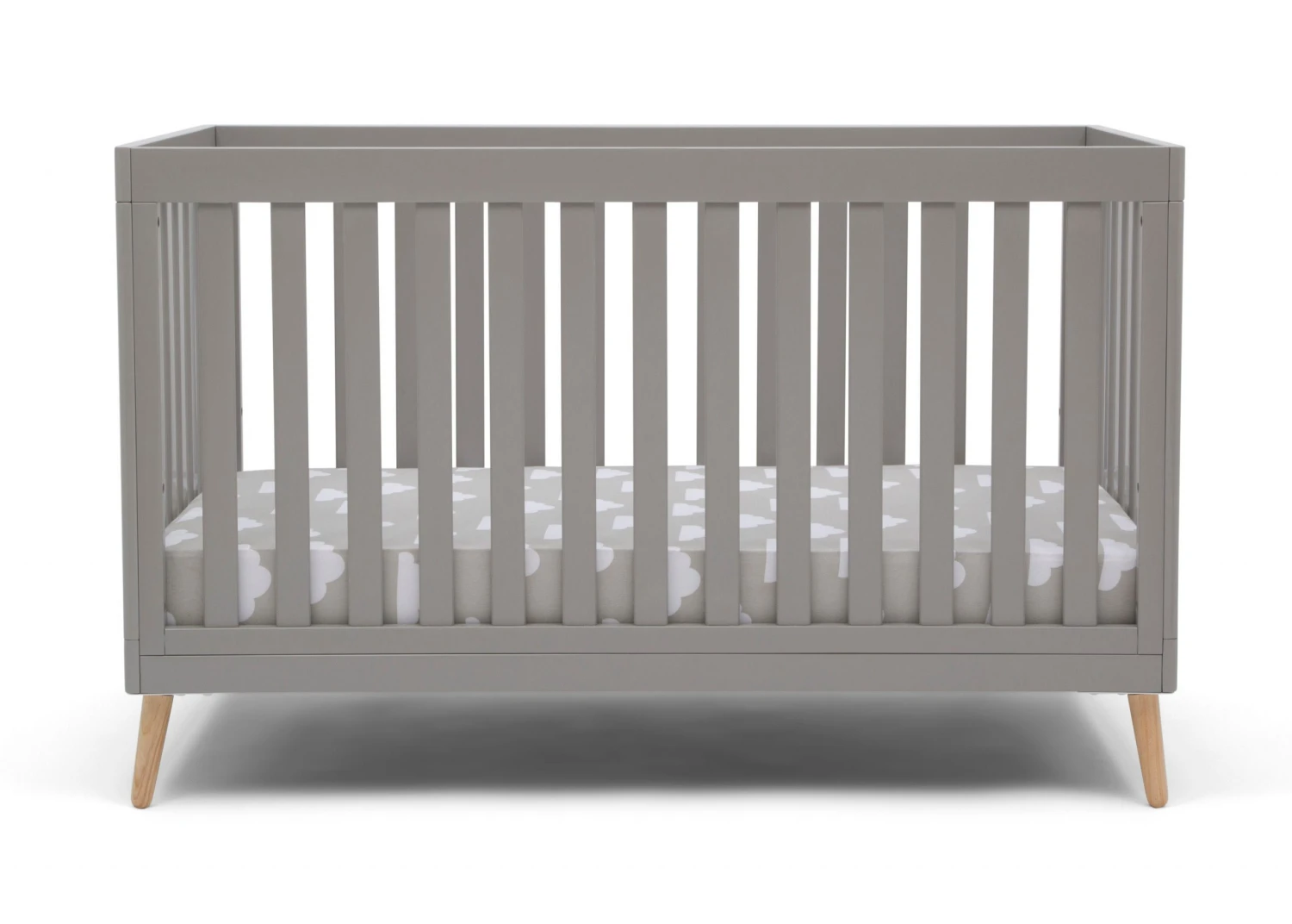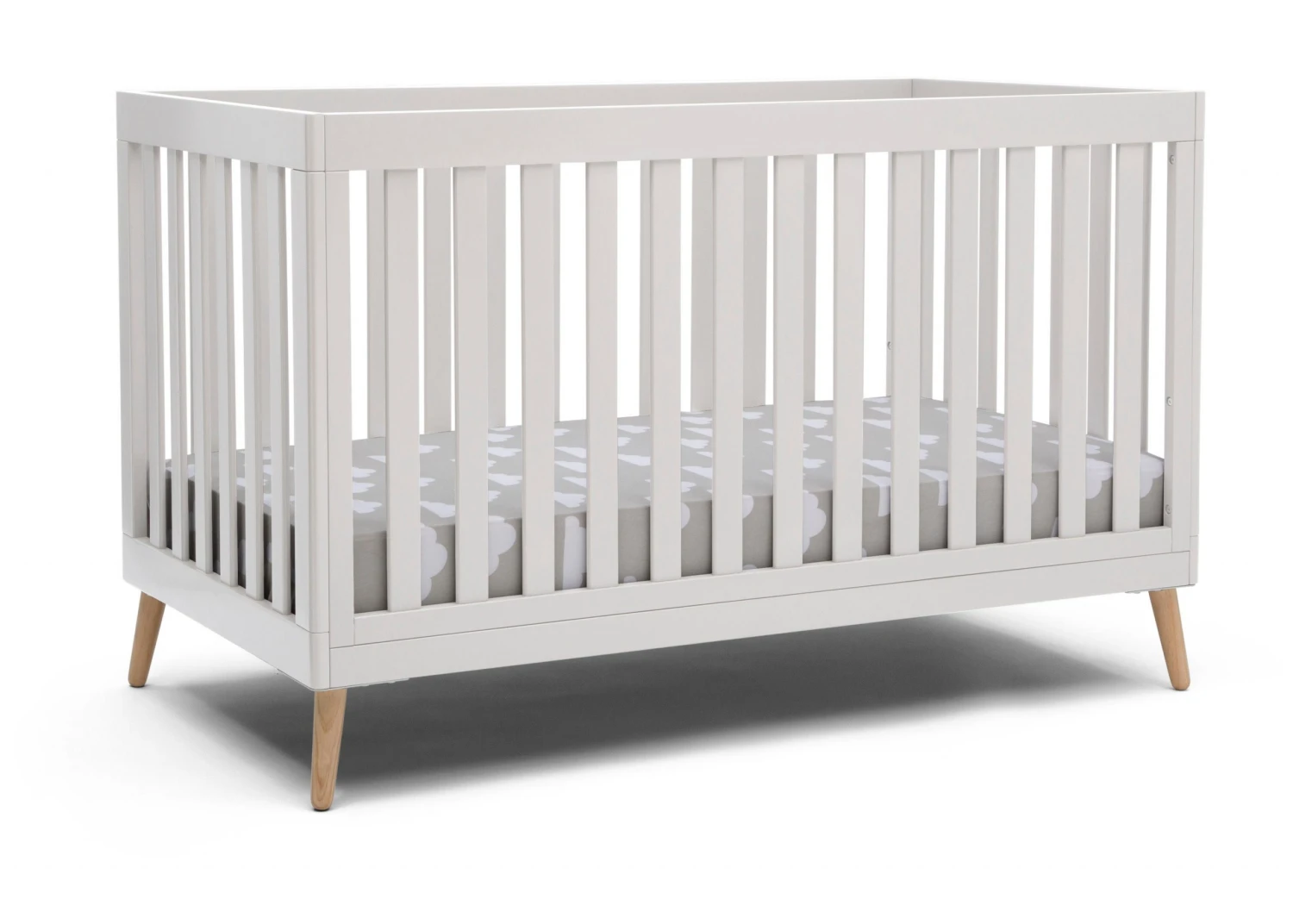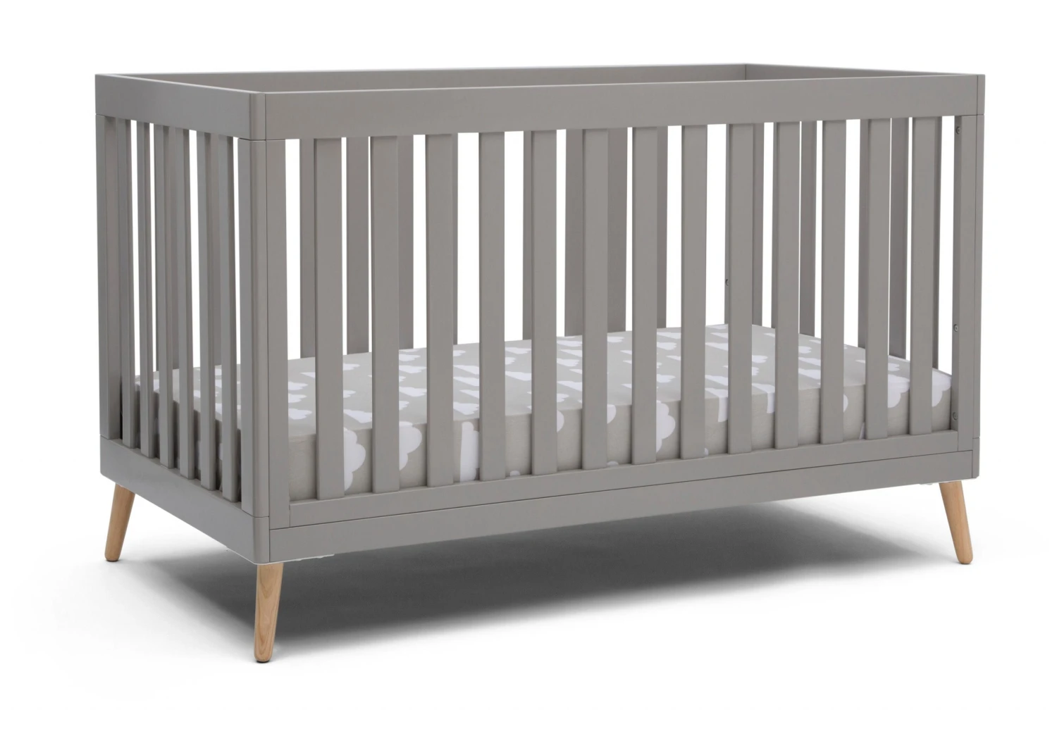 The Essex 4-in-1 Convertible Baby Crib by Delta Children is designed to elevate modern nurseries. It features gently curved corners and splayed feet in a natural finish for some retro cool contrast. The adjustable height mattress allows this crib to grow alongside your little one—start with the mattress at the highest level, then lower it as your baby begins to sit or stand. Once your child outgrows the crib, convert it to a toddler bed, daybed or sofa. To complete your mid-century modern nursery, pair the Essex 4-in-1 Crib with the Essex Changing Table/Bookcase by Delta Children.