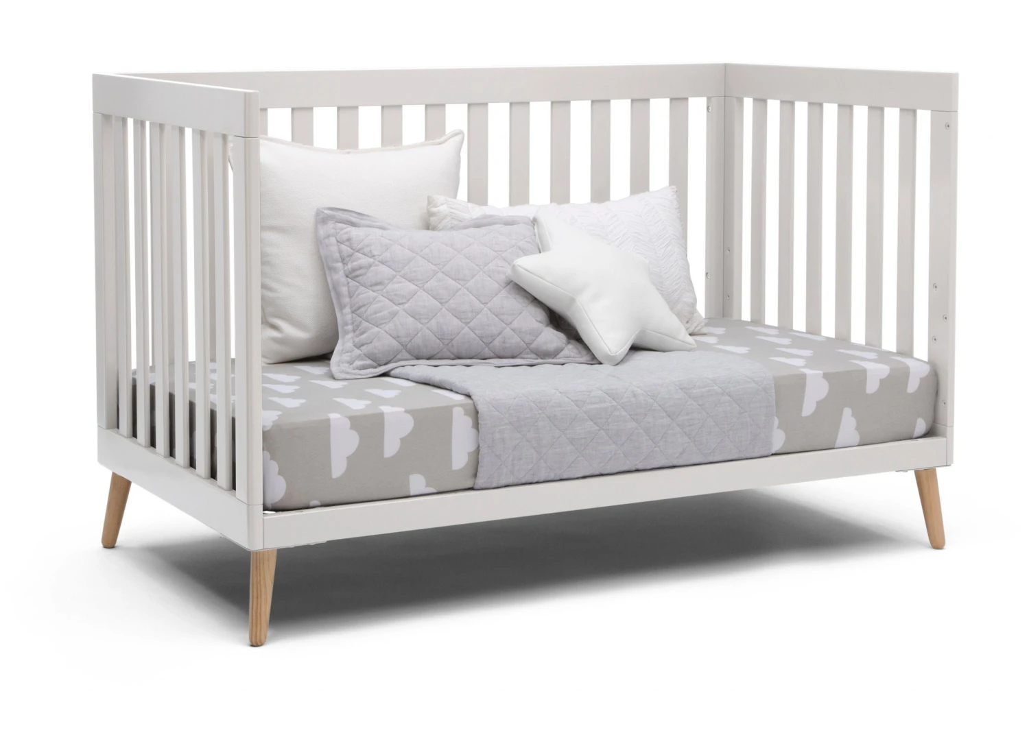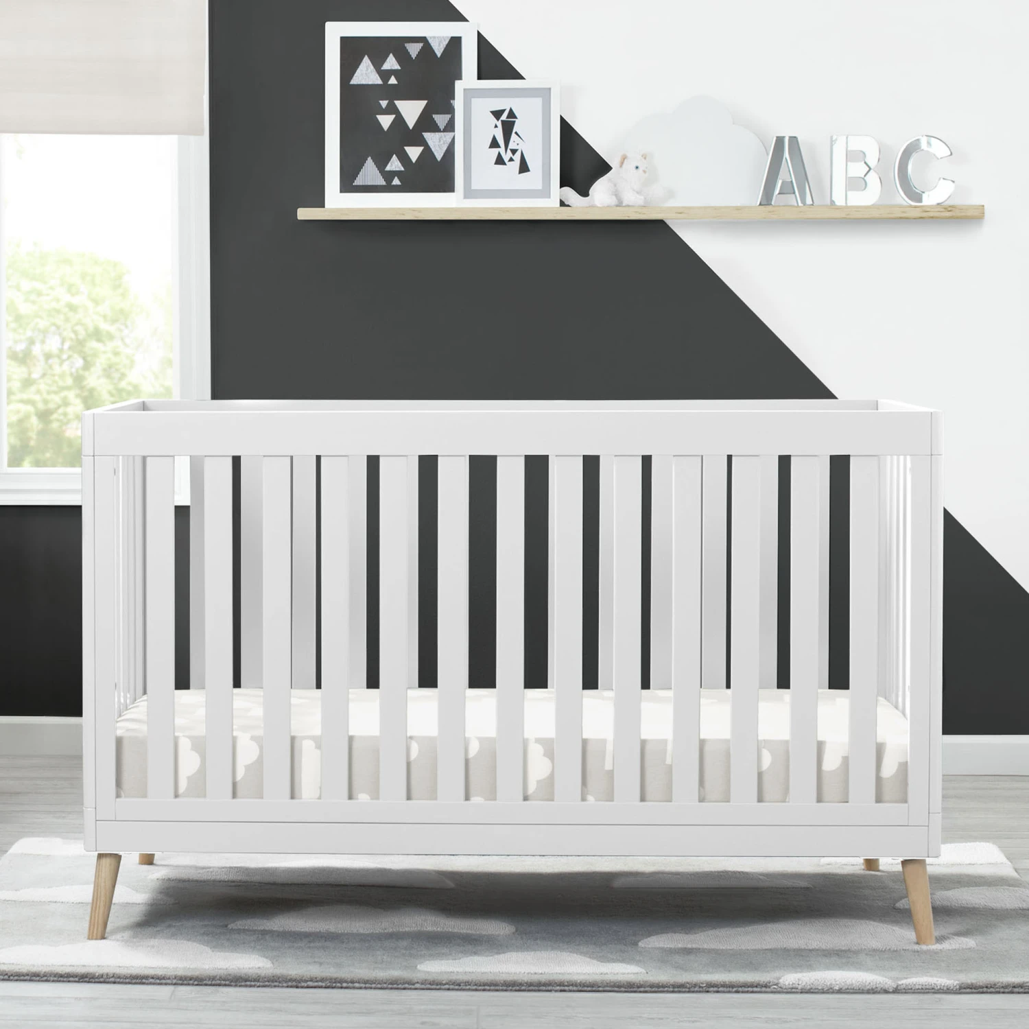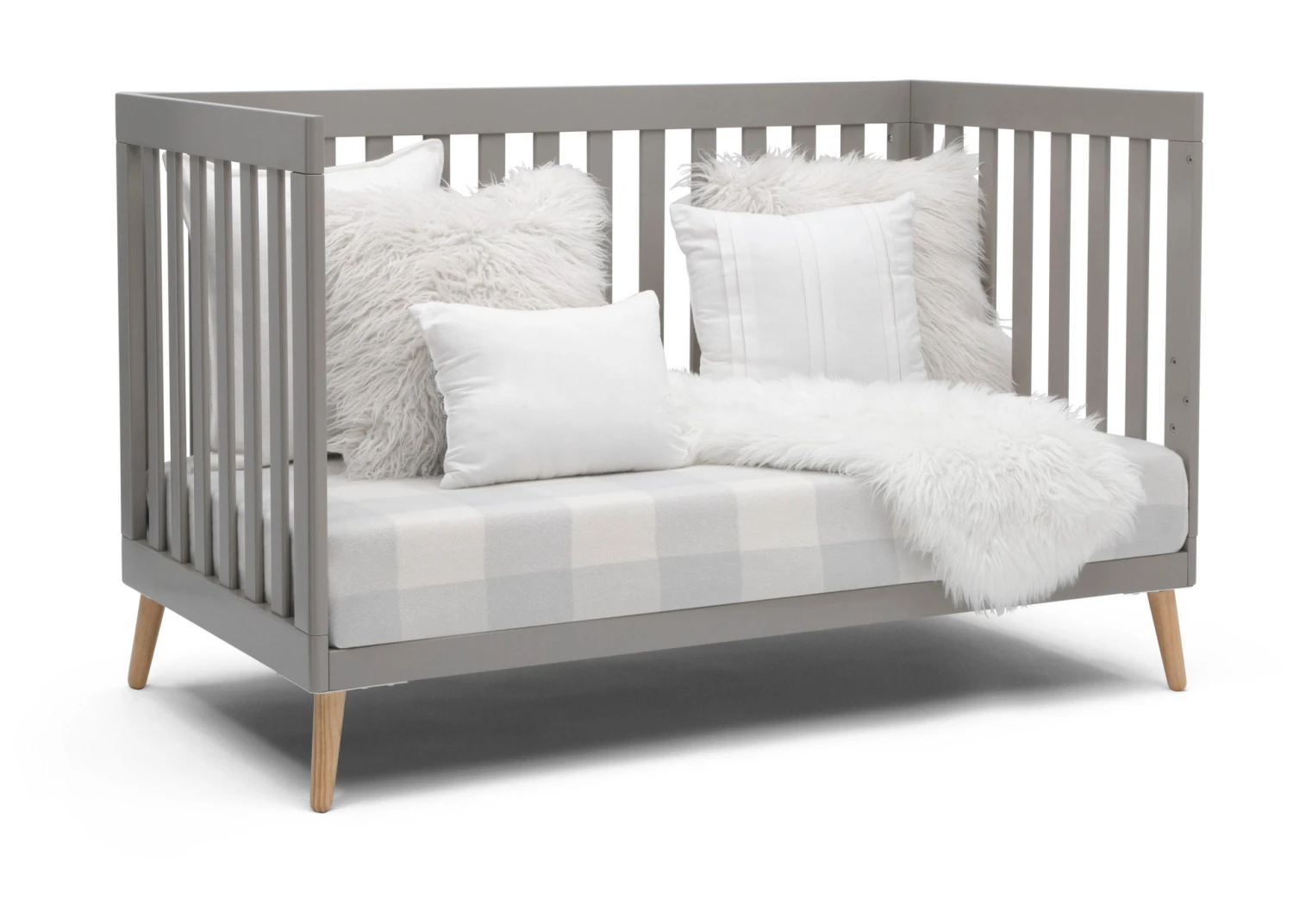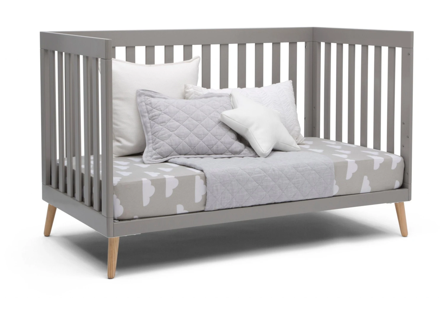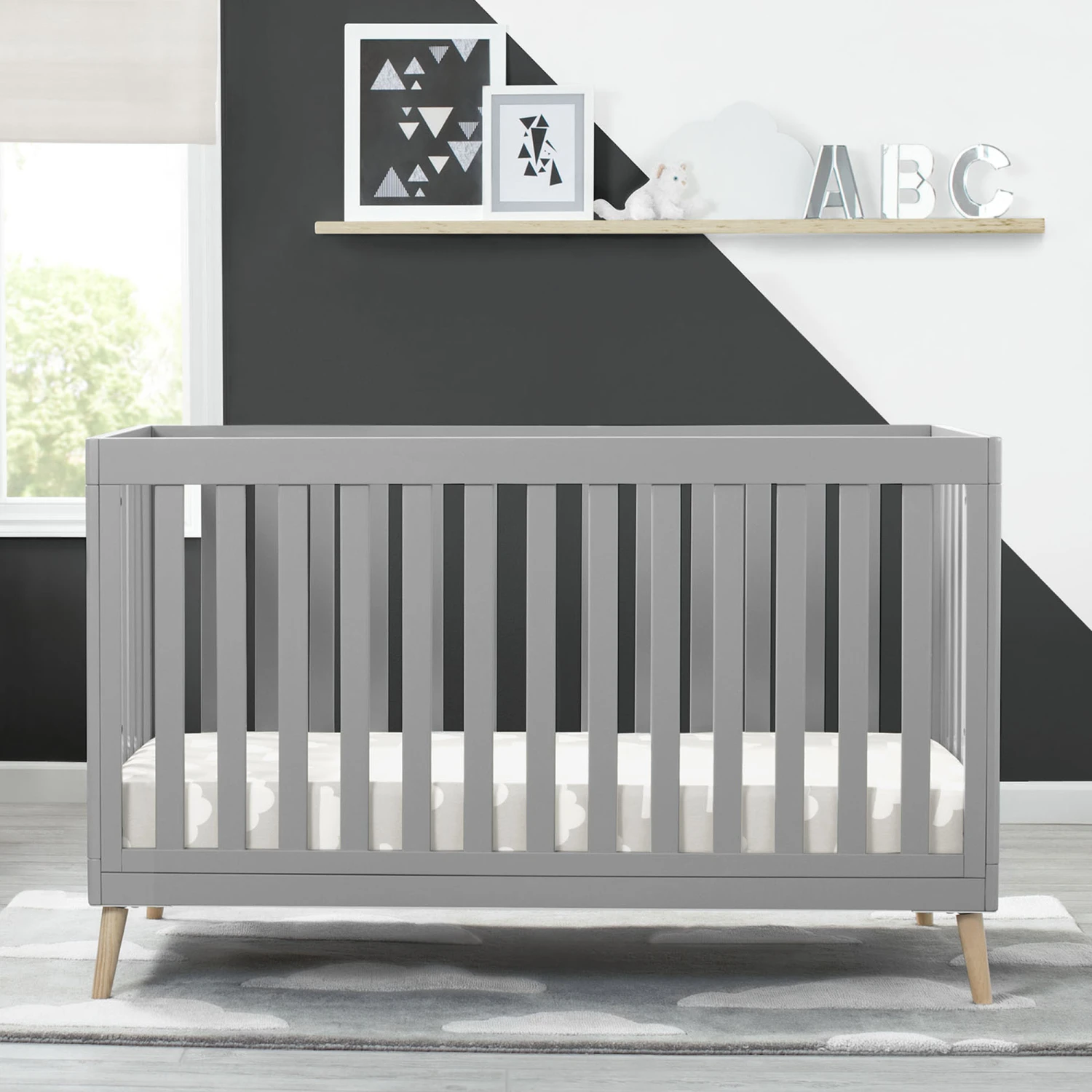 The Essex 4-in-1 Convertible Baby Crib by Delta Children is designed to elevate modern nurseries. It features gently curved corners and splayed feet in a natural finish for some retro cool contrast. The adjustable height mattress allows this crib to grow alongside your little one—start with the mattress at the highest level, then lower it as your baby begins to sit or stand. Once your child outgrows the crib, convert it to a toddler bed, daybed or sofa. To complete your mid-century modern nursery, pair the Essex 4-in-1 Crib with the Essex Changing Table/Bookcase by Delta Children.
