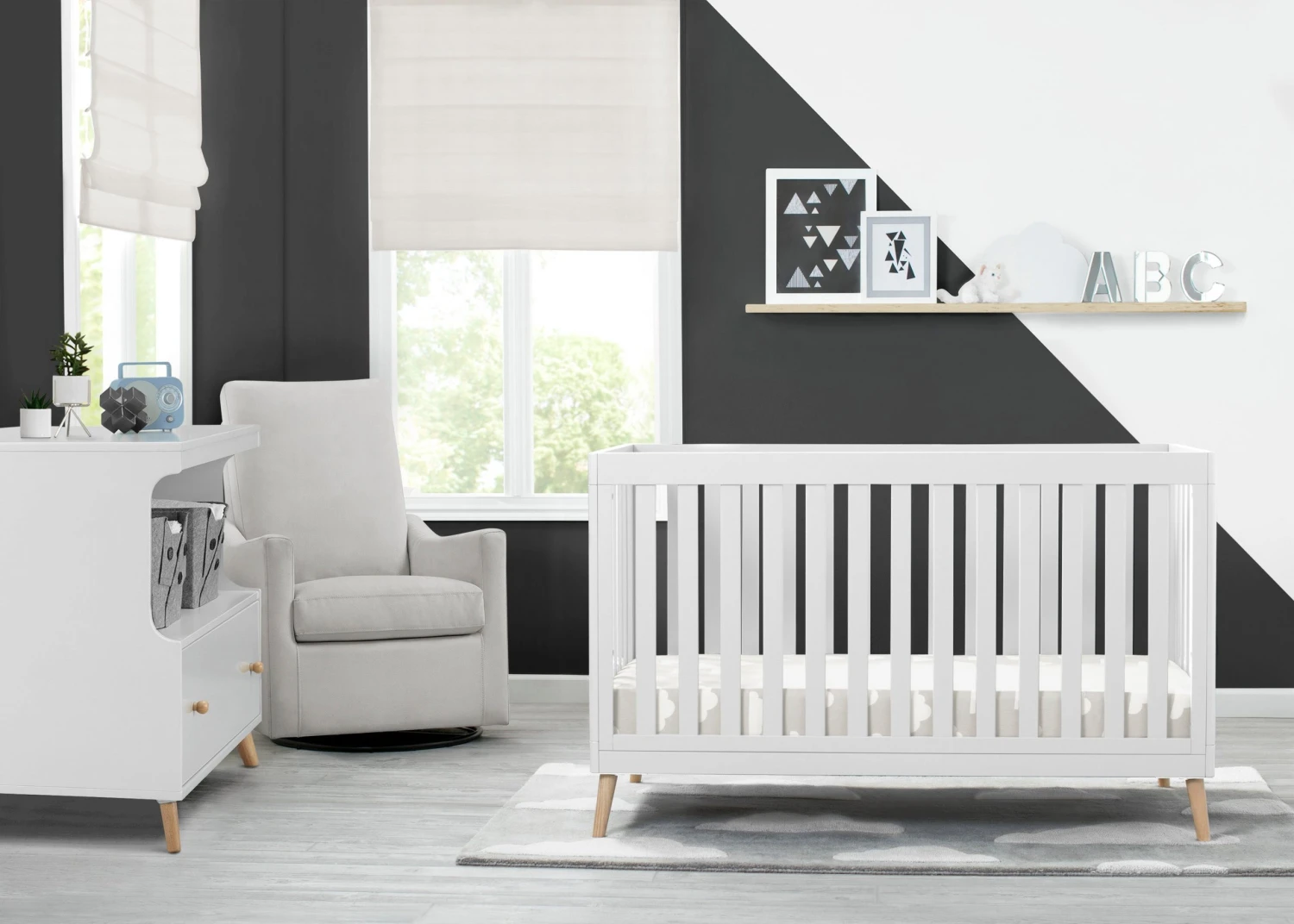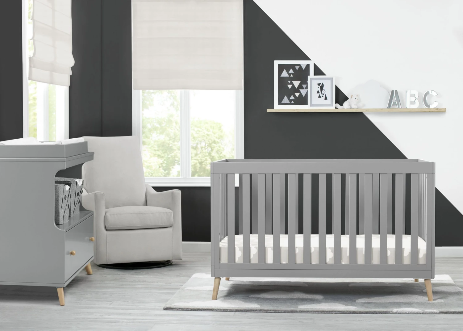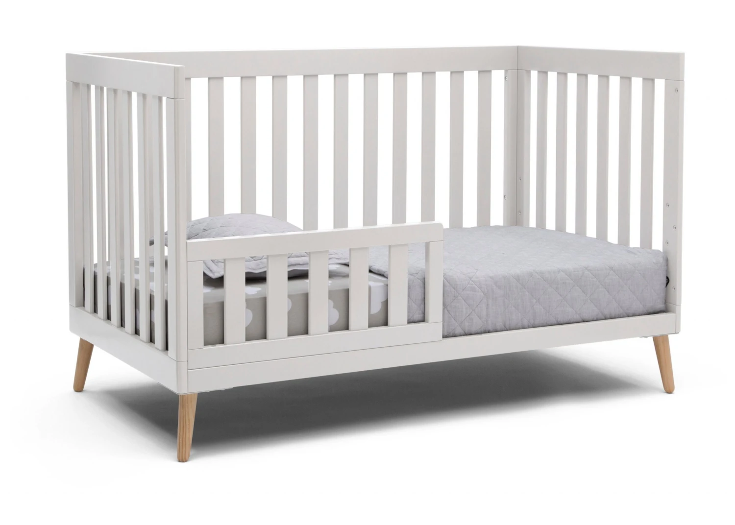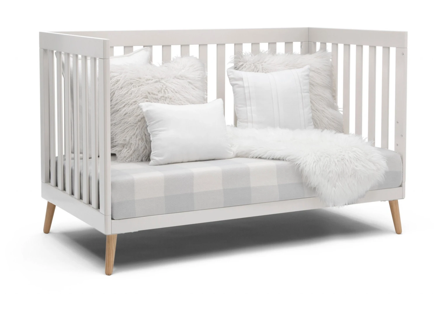 The Essex 4-in-1 Convertible Baby Crib by Delta Children is designed to elevate modern nurseries. It features gently curved corners and splayed feet in a natural finish for some retro cool contrast. The adjustable height mattress allows this crib to grow alongside your little one—start with the mattress at the highest level, then lower it as your baby begins to sit or stand. Once your child outgrows the crib, convert it to a toddler bed, daybed or sofa. To complete your mid-century modern nursery, pair the Essex 4-in-1 Crib with the Essex Changing Table/Bookcase by Delta Children.
