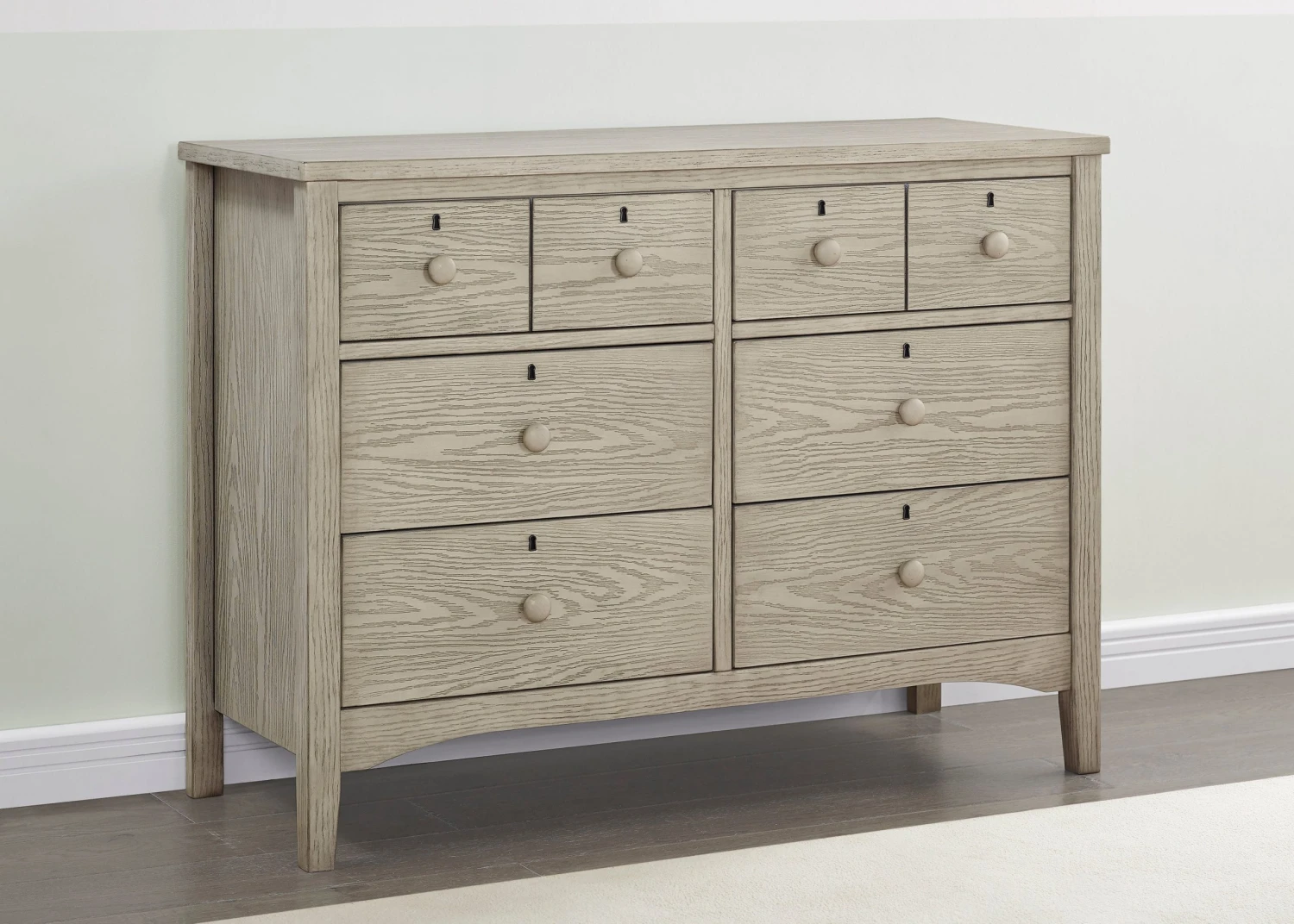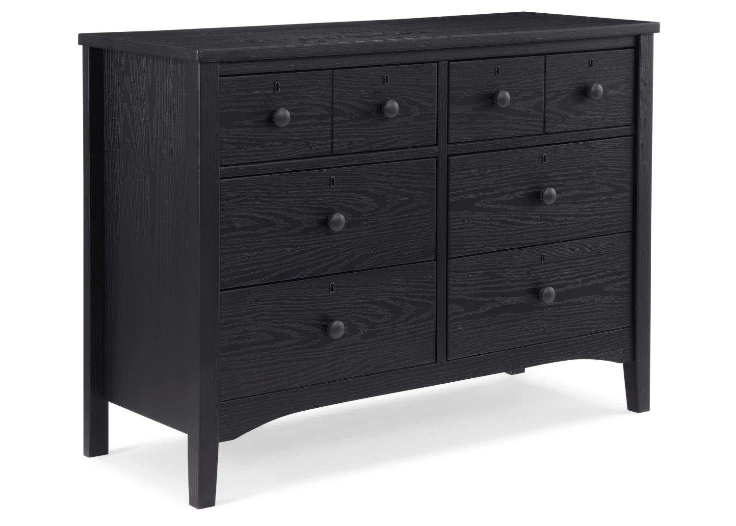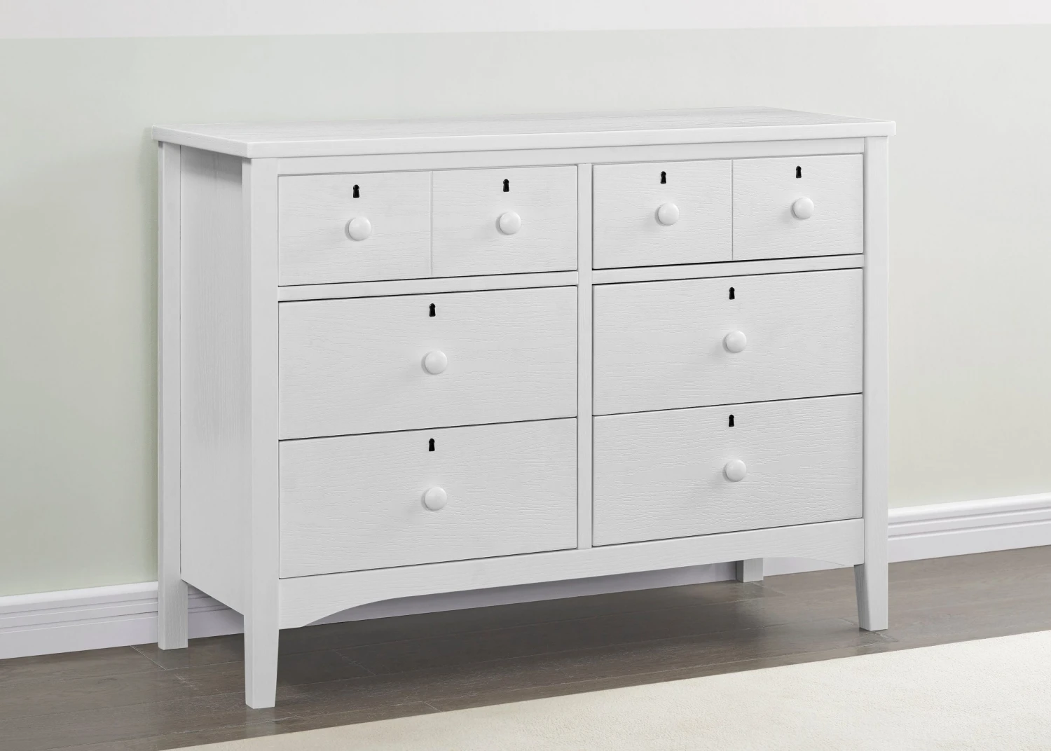 Inspired by rustic design, the Farmhouse 6 Drawer Dresser by Delta Children is set atop tapered legs, finished with a lightly textured technique, and accented with wood drawer pulls and keyholes. A great option for your baby’s nursery or kid’s bedroom, it features six large drawers that provide ample storage space. Available in Textured Limestone, Textured White, Textured Midnight Grey. This dresser coordinates with other items in the Delta Children Farmhouse Collection.