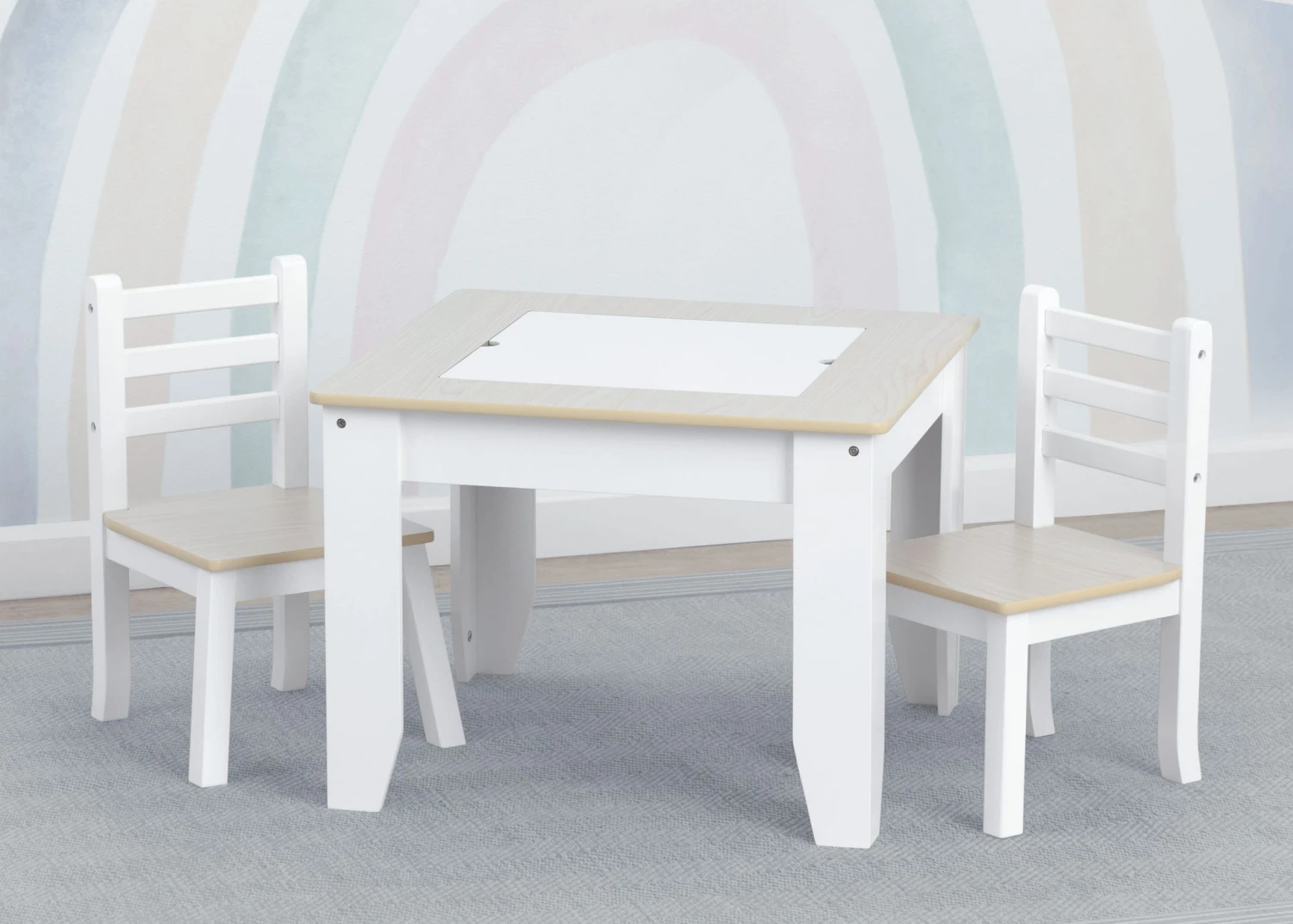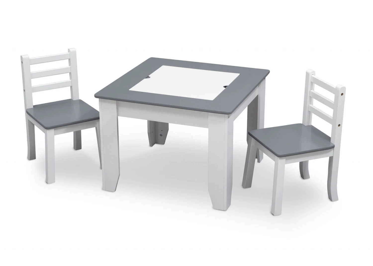 Kids will love getting crafty with the Chelsea Chair Set and Table from Delta Children! It has a double-sided art surface that features a dry erase board that flips into a chalkboard. Underneath the art surface an easy-access storage compartment for markers, paintbrushes, toys and other items. The perfect play table for art projects, tea parties, snacks and more, the Chelsea Chair Set and Table will make a great addition to any room. The table’s modern two-tone design in contemporary shades of grey and white ensures it will look equally cool in the playroom or living room. Table coordinates with other items in the Chelsea Collection from Delta Children.