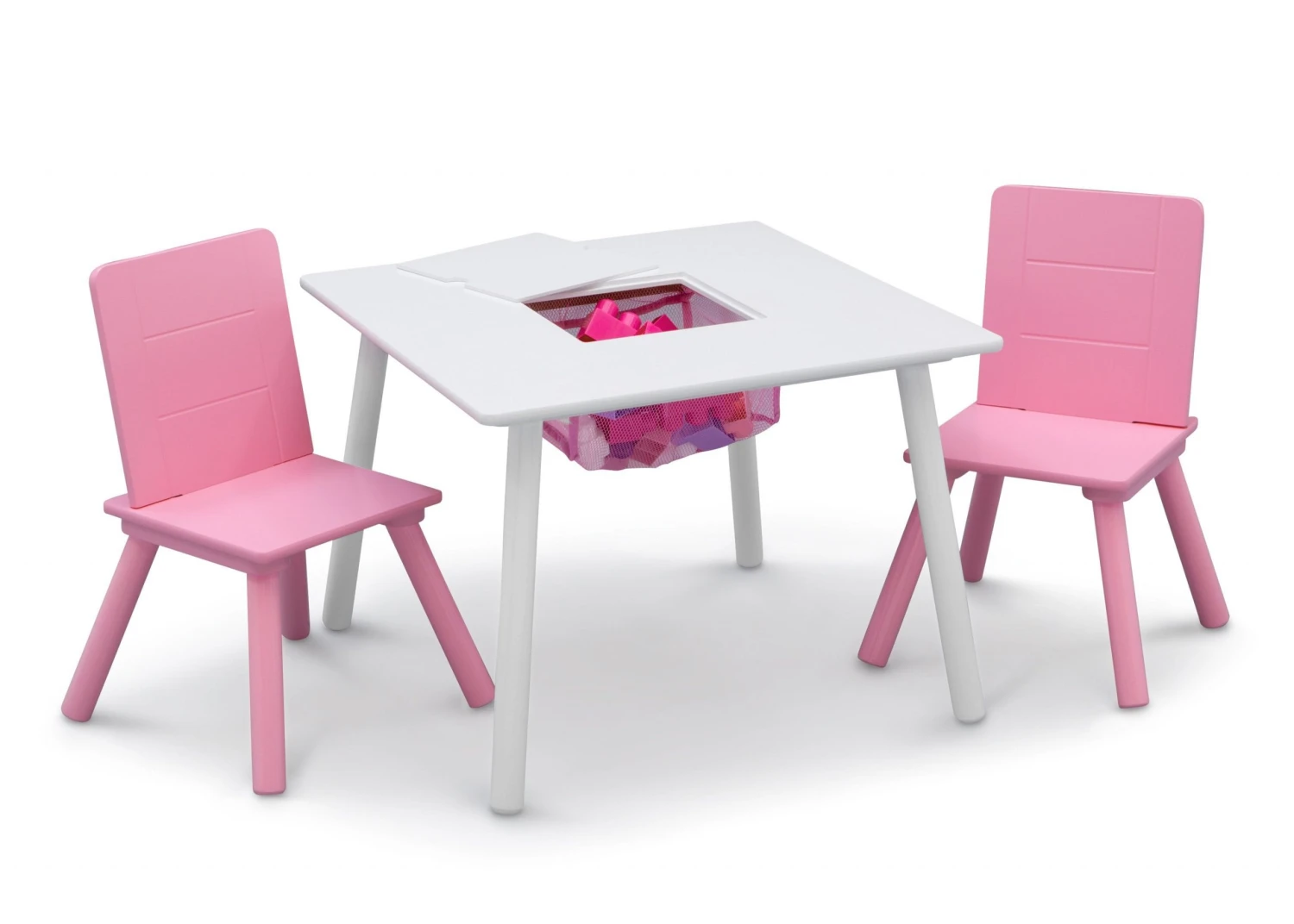Spark years of creative play and learning with this Table and Chair Set with Storage by Delta Children. Perfectly sized for your growing child, this set features a sturdy wood table in white and two boldly colored chairs with grooved detailing. As functional as it is stylish, this set also features a built-in storage compartment at the center of the tabletop, perfect for stowing away toys, books or art supplies. Beautifully crafted, this set proves that play tables can be as tasteful, charming and multi-functional as the rest of your home décor—use it in your child’s bedroom, playroom or any living space.