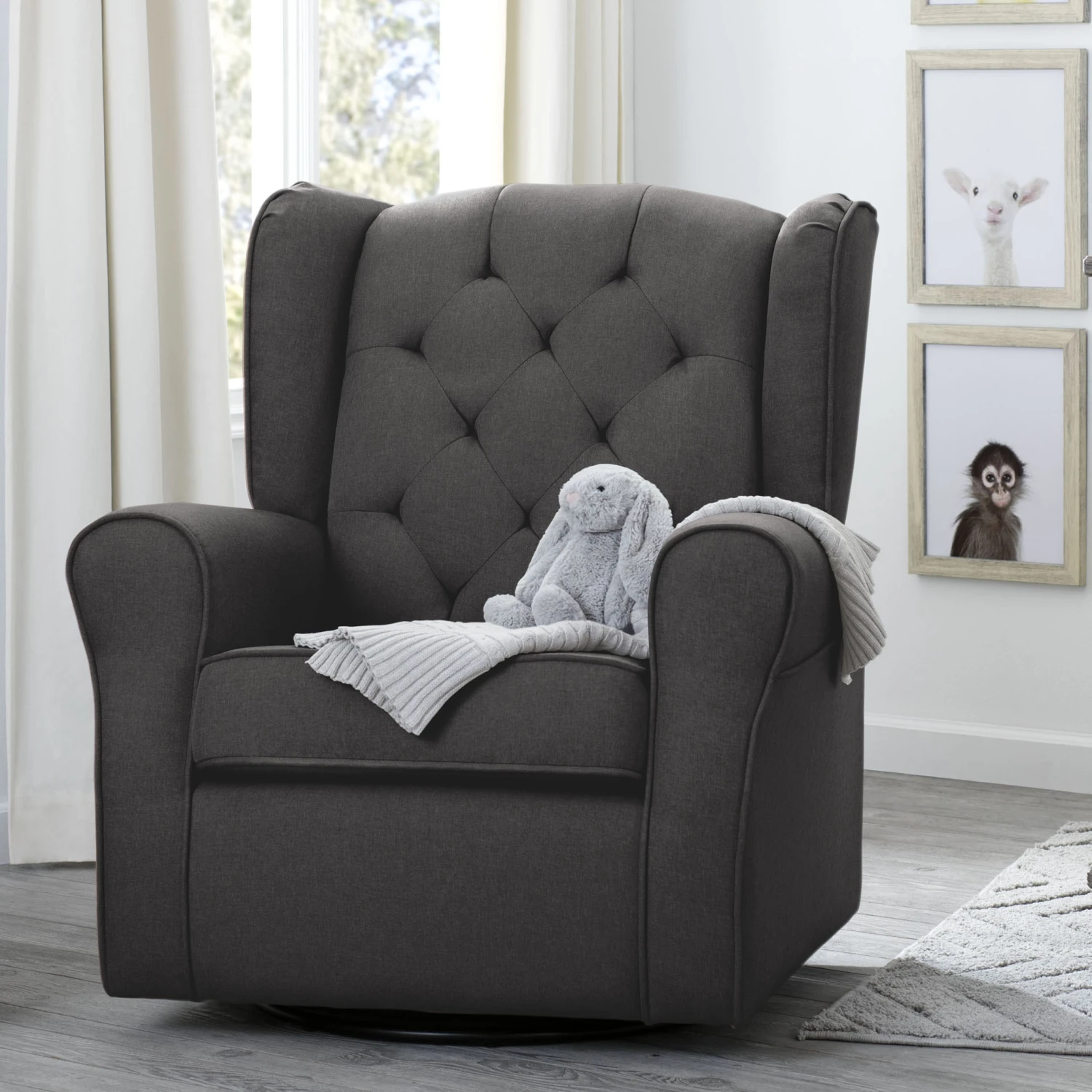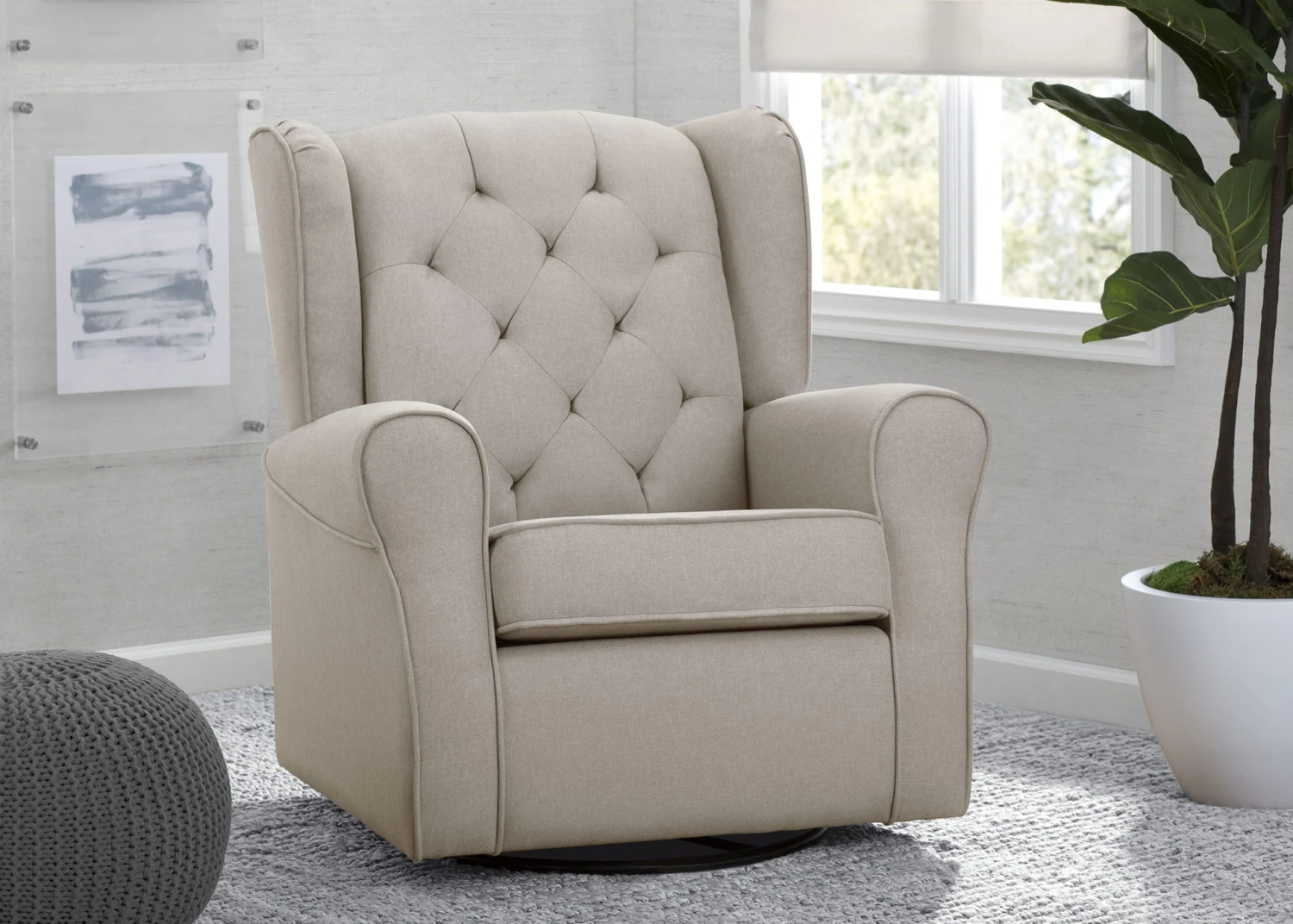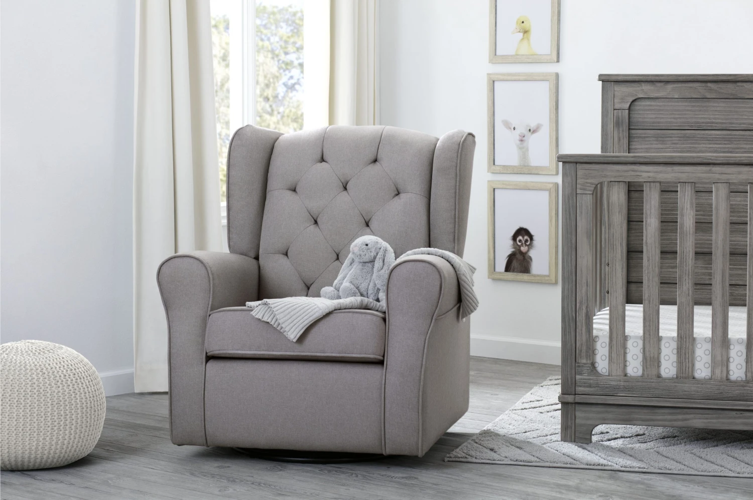 No nursery is complete without a plush glider, and the Emma Nursery Glider is the perfect addition to your baby’s space. Crafted with parents and baby in mind, it features a sweet, traditional design complete with thick cushions and steel gliding and swivel mechanisms to quietly rock baby to sleep