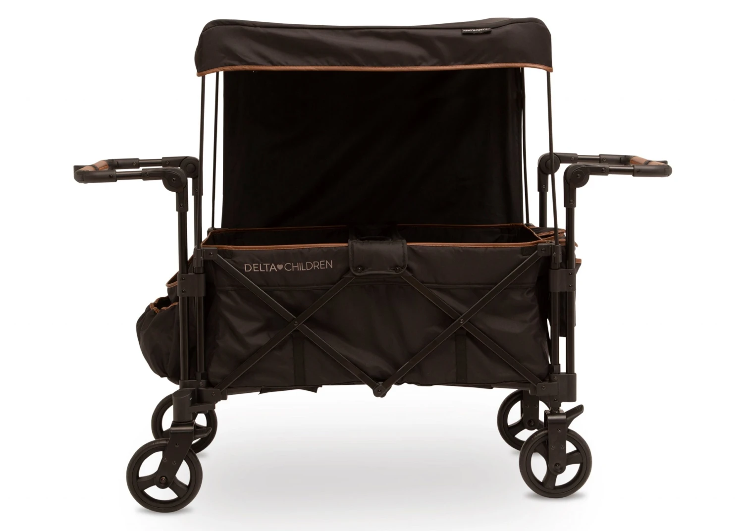 The Hercules Stroller Wagon by Delta Children is specifically designed to grow and flow with your family. Packed with more features than a standard double stroller, this convenient wagon is perfect for indoor or outdoor activities. A comfy option for siblings or friends, this stroller wagon features two cushioned seats with 3-point safety harnesses for security while the removable center console with two cup holders and storage pocket allows kids to share snacks, toys and drinks. An additional cup holder for parents and side pockets ensure you can bring everything you need along for the adventure. The removable, UV blocking canopy and roll-down shades offer privacy and protection from the sun or rain. Easy to drive, it features swivel front wheels that allow you to effortlessly turn and pivot, as well as push and pull handles with adjustable heights. The wagon’s compact fold makes it easy to store or transport. And when your children outgrow the need for a wagon, use it to haul your own gear at the farmers market, while gardening or the grocery store. Holds up to 110 lbs. (55 lbs. per seat). Weighs 36.3 lbs. Recommended for ages 9 months up to 55 lbs.