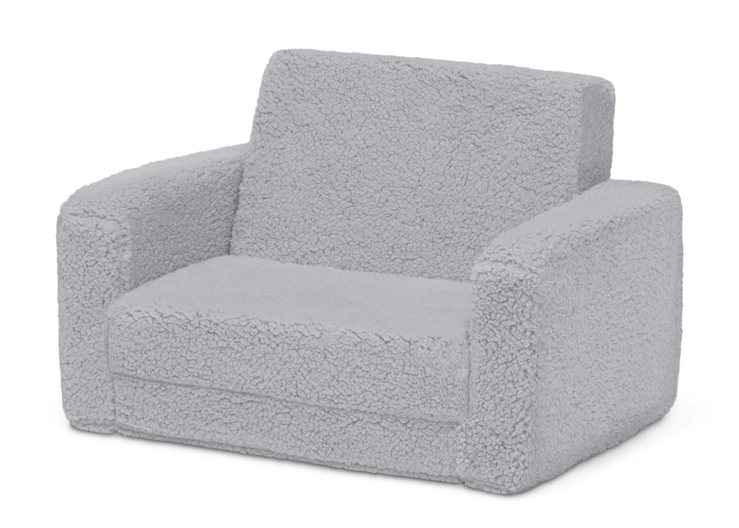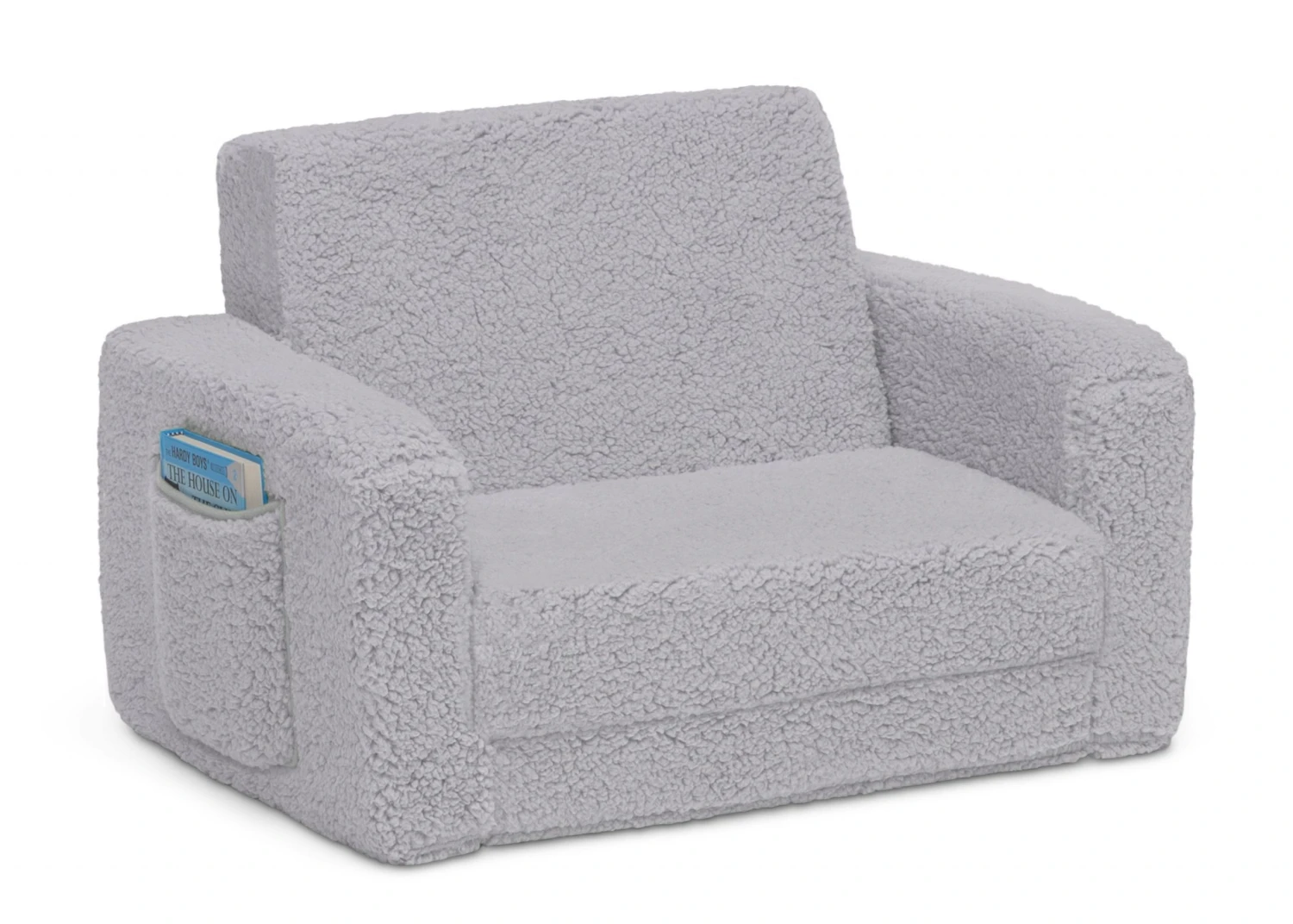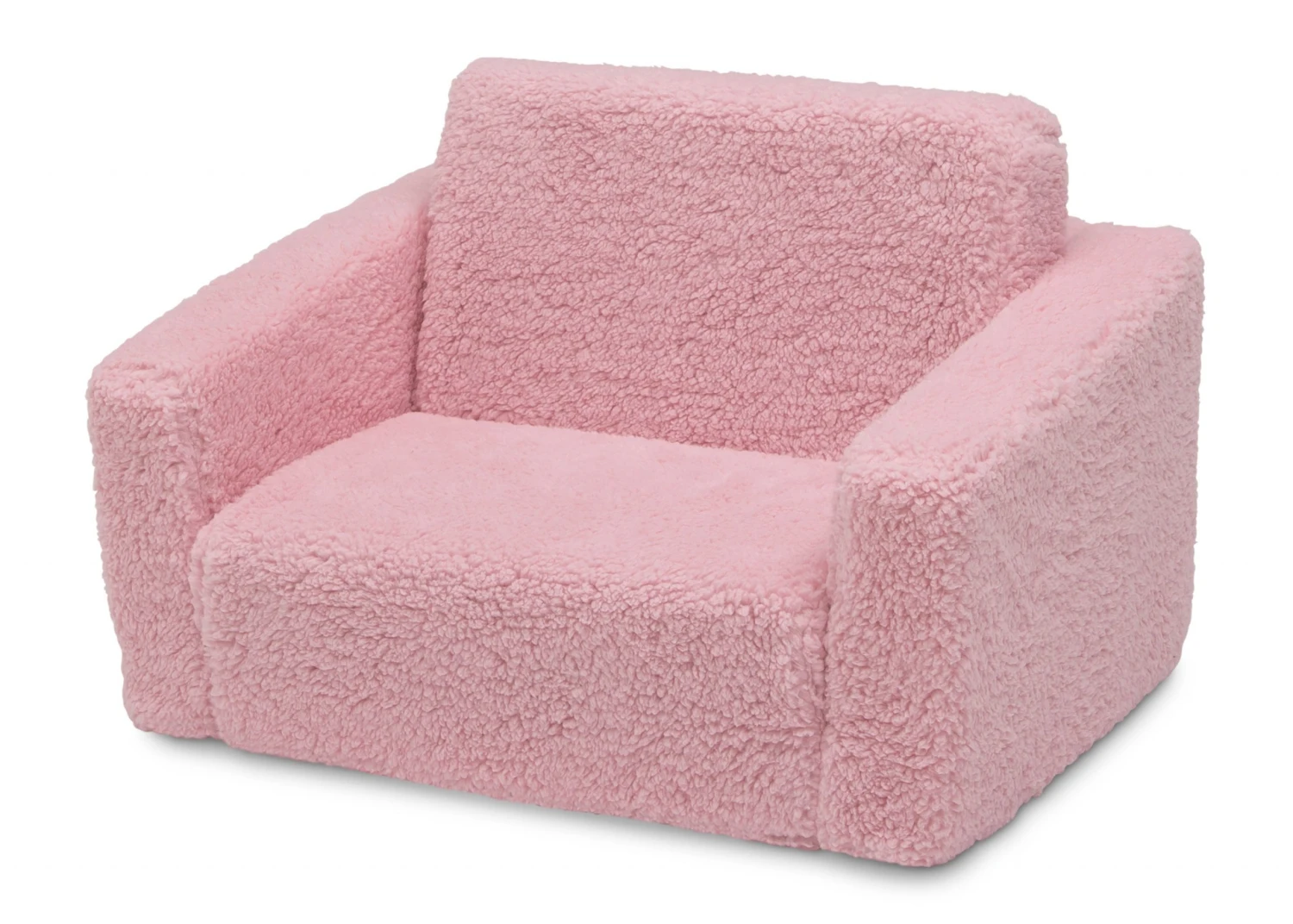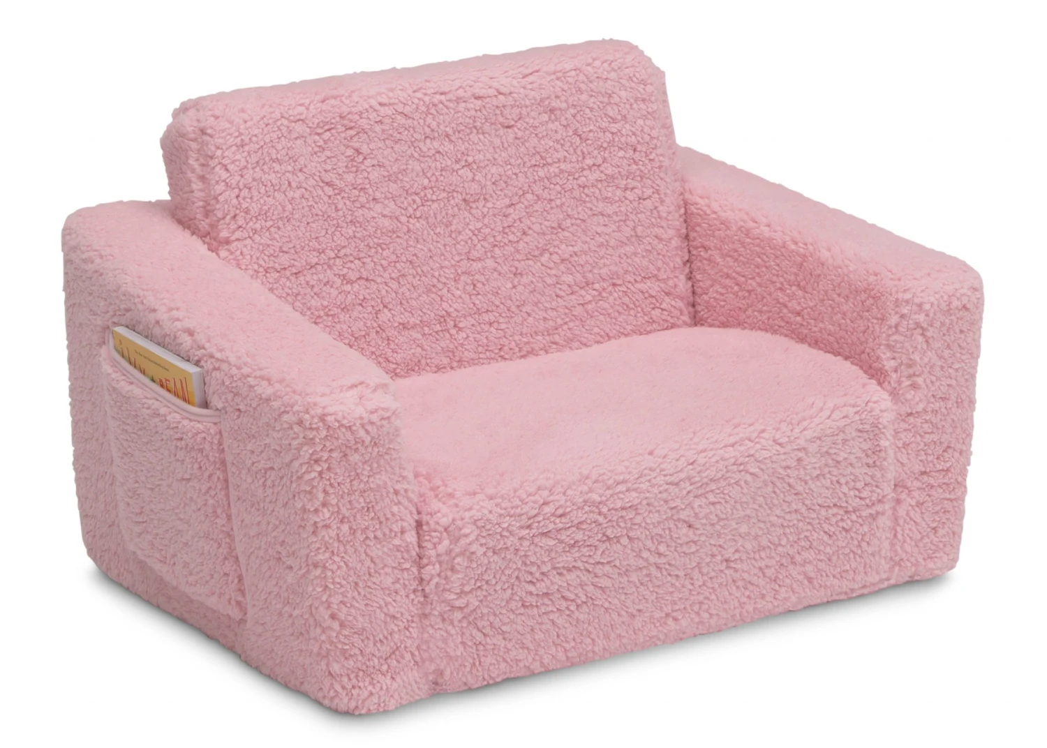 The Cozee Flip-Out Sherpa 2-in-1 Convertible Chair to Lounger by Delta Children is a cozy chair by day, laid-back lounger by night. This convertible seat easily flips open to reveal multiple ways for your child to relax–they’ll love to sit and read or watch their favorite movies on the chair but when it’s time for a nap, this seat folds out into a comfy sleeper bed. Big enough to fit two small kids comfortably in chair mode, it’s light enough to move around the house and is ideal for your children to share during playtime or sleepovers. The super-soft Sherpa slipcover with easy-to-reach side pocket creates the ultimate retreat for your little one. The supportive foam construction will keep its shape and provides all-day comfort. Designed to ship in a super-small box, this lightweight foam kids’ chair and lounger may take up to 24 hours to fully expand once unboxed. Machine-washable slipcover zips off for easy cleaning. Recommended for ages 18 months+.