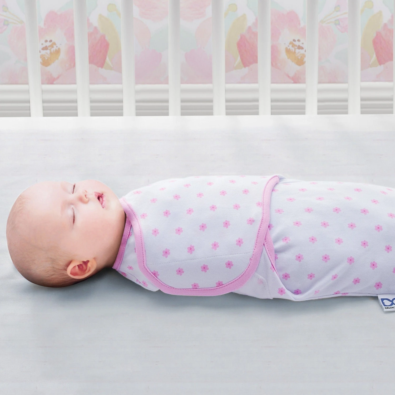 The 3 Pack of Little Lambs Adjustable Swaddle Wraps by Delta Children mimics the safety and comfort of mom’s womb and helps prevent startle reflex, promoting a safer, sounder sleep for your newborn. An easy option that allows parents to quickly achieve a snug fit, these super-soft swaddles feature an adjustable design that fasten with hook and loop attachments to create the perfect fit. Made of 100% natural cotton, theses Little Lambs Adjustable Swaddle Wraps are gentle on baby’s skin, but durable and machine washable for everyday use. The perfect option, these swaddles will keep your little one comfy through the night–and when your baby sleeps well, so will you. Size Extra Small fits ages 0-3 months, 4-7 pounds.