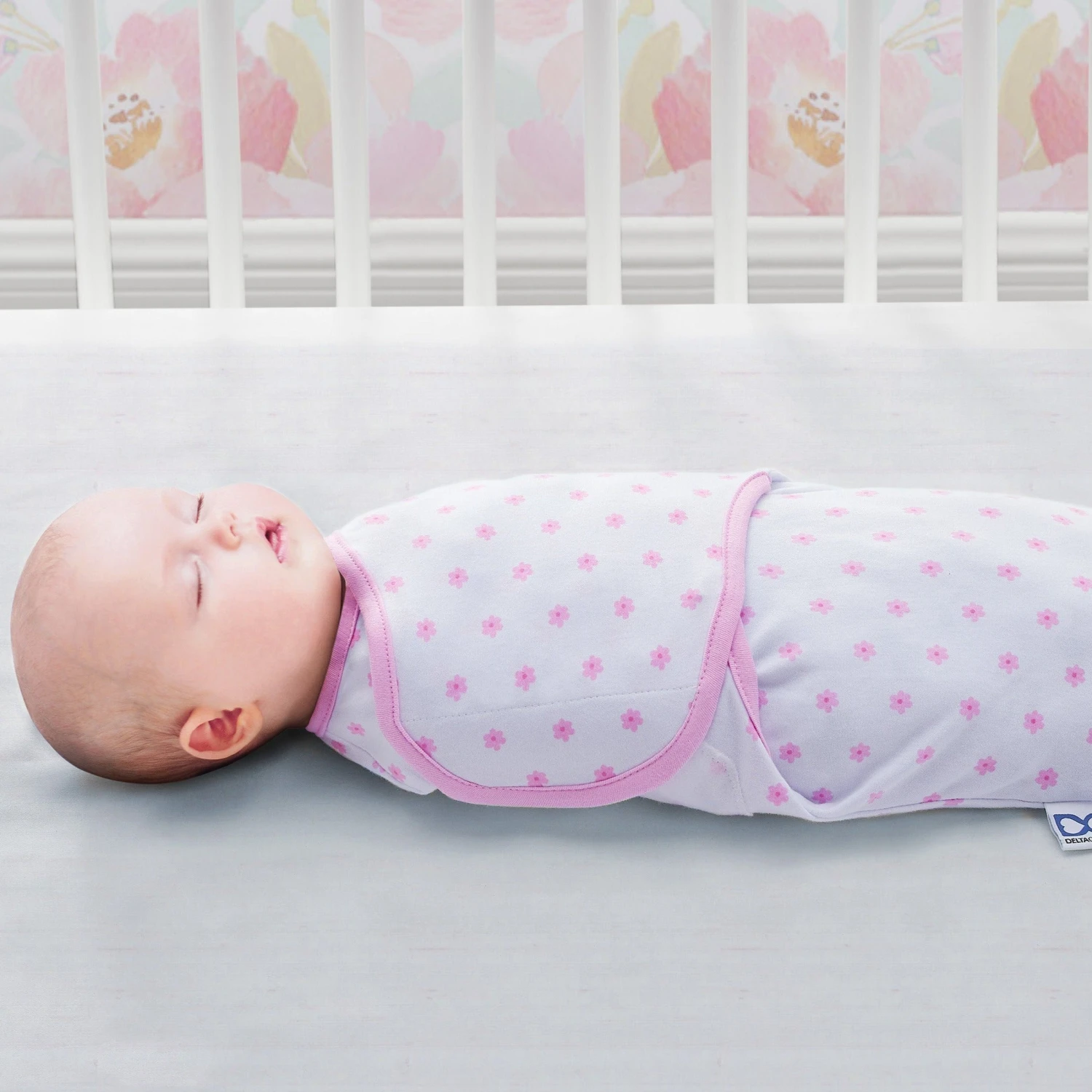 The 3 Pack of Little Lambs Adjustable Swaddle Wraps by Delta Children mimics the safety and comfort of mom’s womb and helps prevent startle reflex, promoting a safer, sounder sleep for your newborn. An easy option that allows parents to quickly achieve a snug fit, these super-soft swaddles feature an adjustable design that fasten with hook and loop attachments to create the perfect fit. Made of 100% natural cotton, theses Little Lambs Adjustable Swaddle Wraps are gentle on baby’s skin, but durable and machine washable for everyday use. The perfect option, these swaddles will keep your little one comfy through the night–and when your baby sleeps well, so will you. Size Large fits ages 3-6 months, 14-18 pounds.
