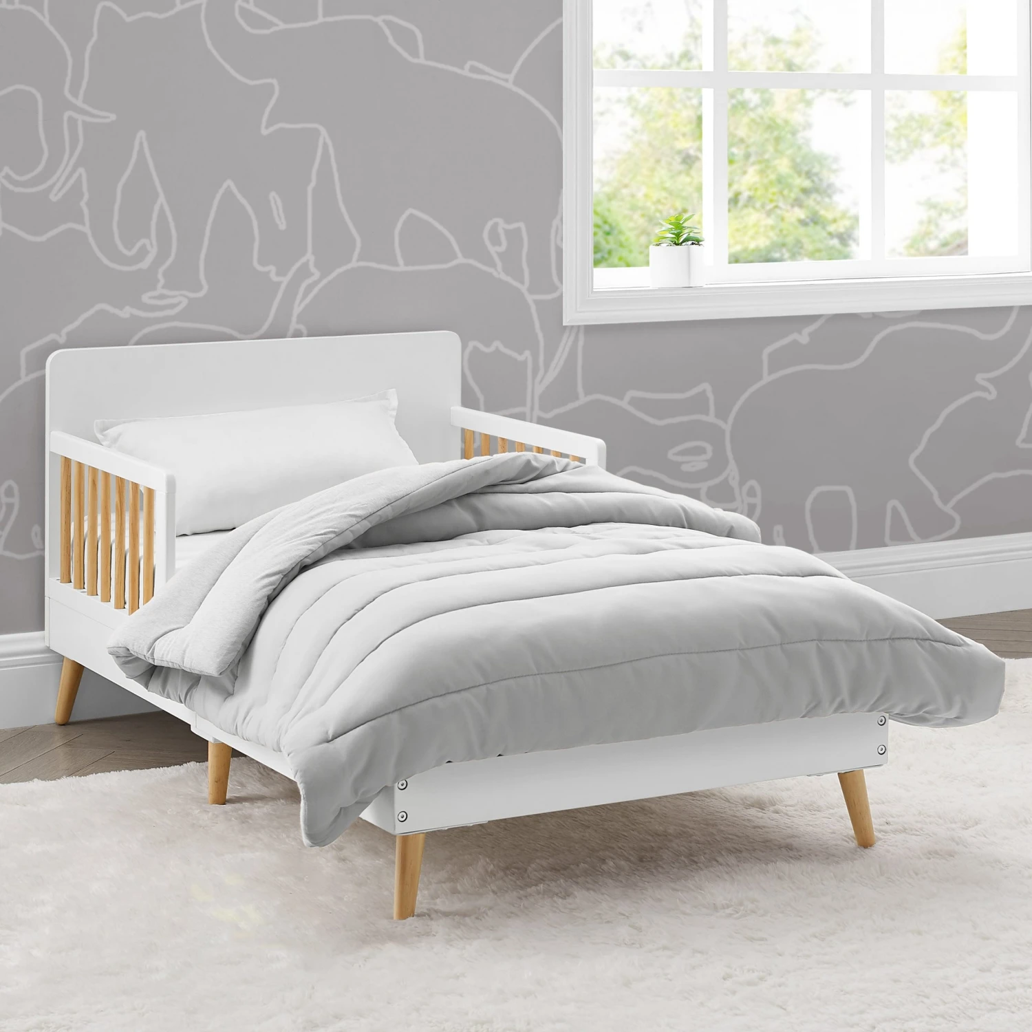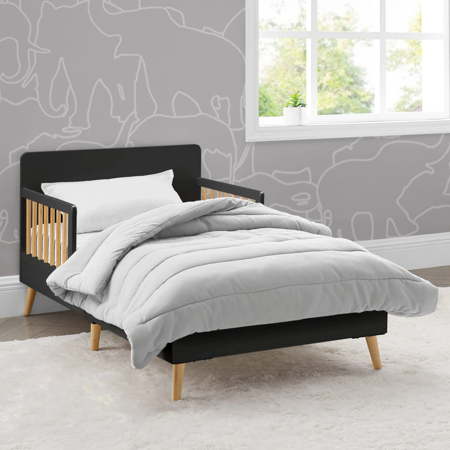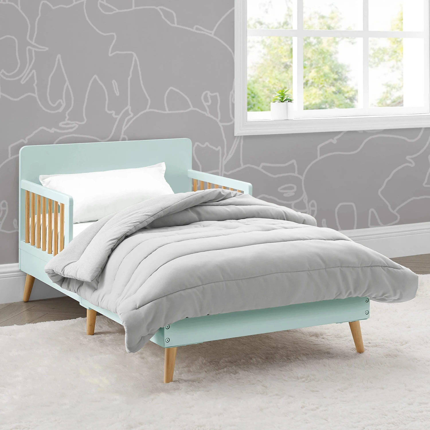 The Logan Wood Toddler Bed by Delta Children is a must-have bed for stylish parents and kids! Designed to elevate big-kid bedrooms, it features rounded spindles and angled feet in a natural finish for a modern look. More than just a good-looking option, this toddler bed is extremely safe with its two attached guardrails and a low height that makes it easy for kids to get in and out on their own. Mattresses not included.