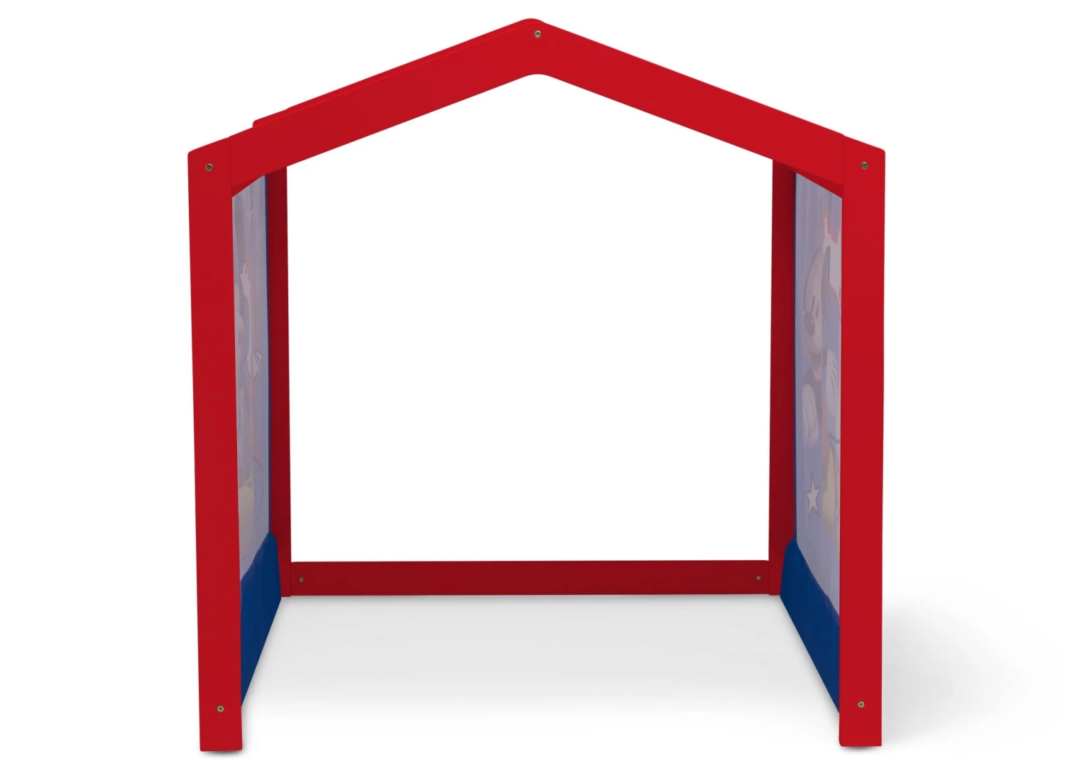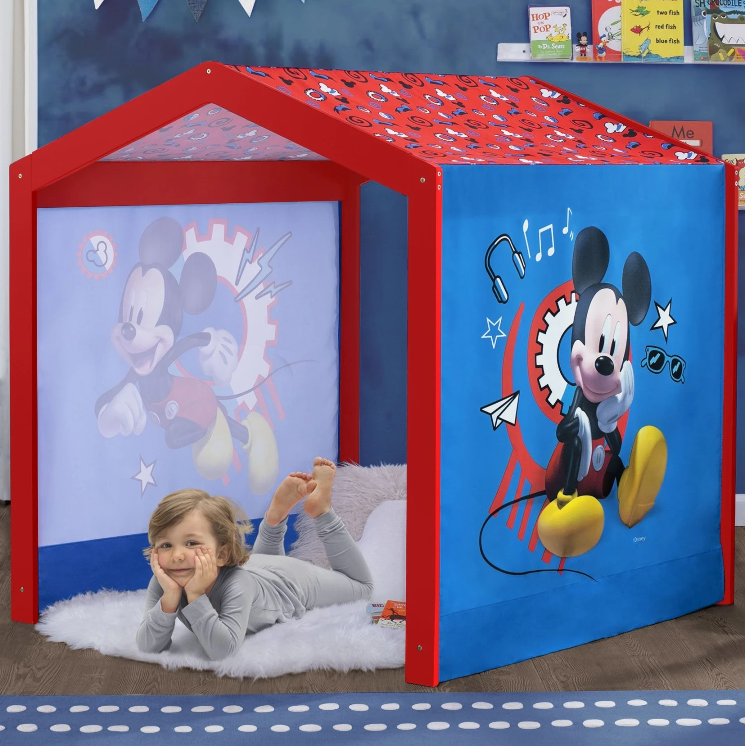 Oh boy! Kids can create their very own Clubhouse with this Disney Mickey Mouse Indoor Playhouse with Fabric Tent by Delta Children. The durable wood frame is draped in colorful tent fabric that features bold graphics of everyone’s favorite mouse, Mickey. A magical fort for boys and girls to play or read, it’s designed to enrich imaginations and encourage kids to create a whole make-believe world inside–decorate the inside of the playhouse with a table, stuffed animals, throw pillows, blankets and more! This large wood playhouse stands just under 4 feet tall, and its sturdy construction ensures your child will make this a special place for creative play for years to come! Roomy enough for multiple children. Designed for indoor use only.