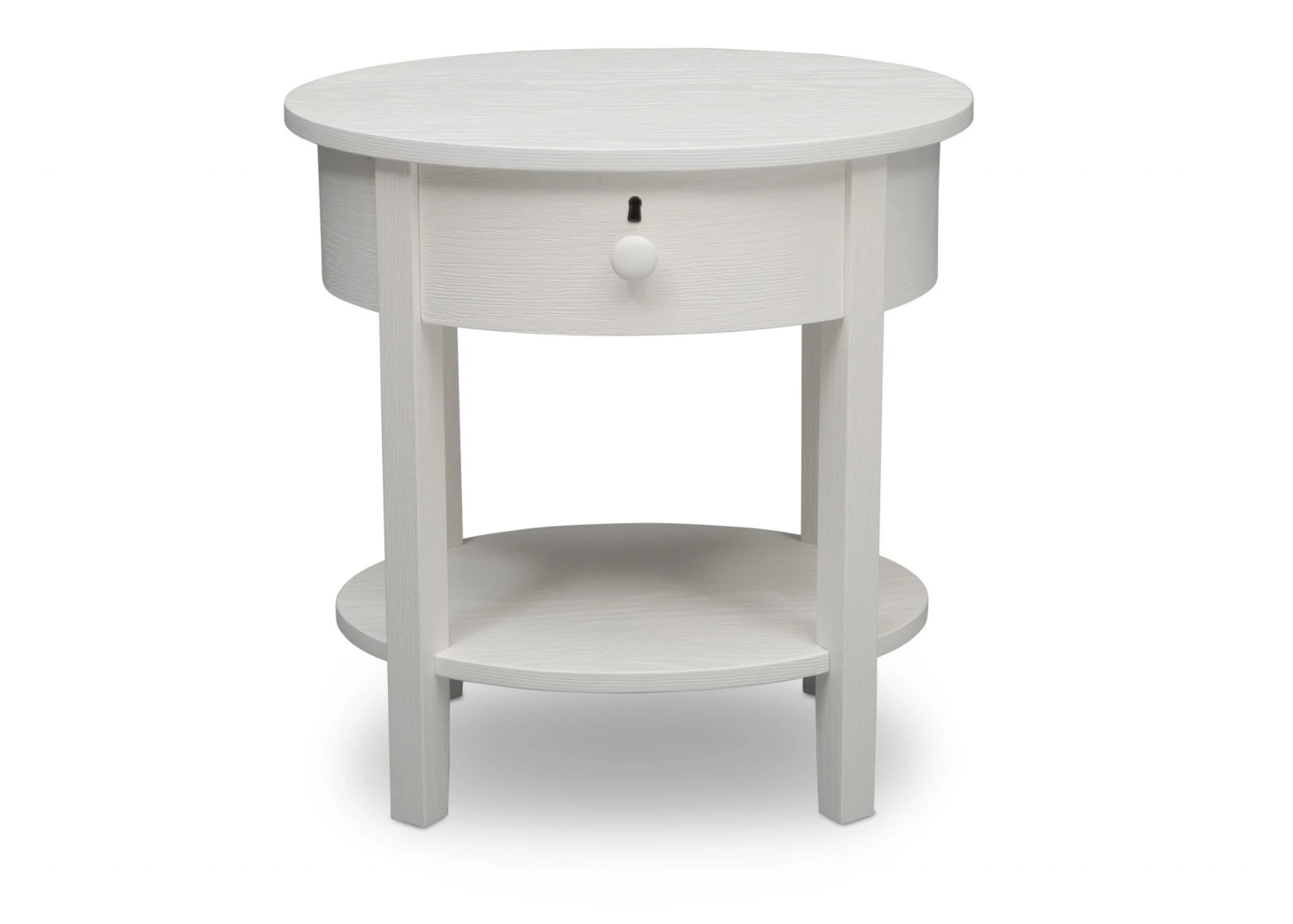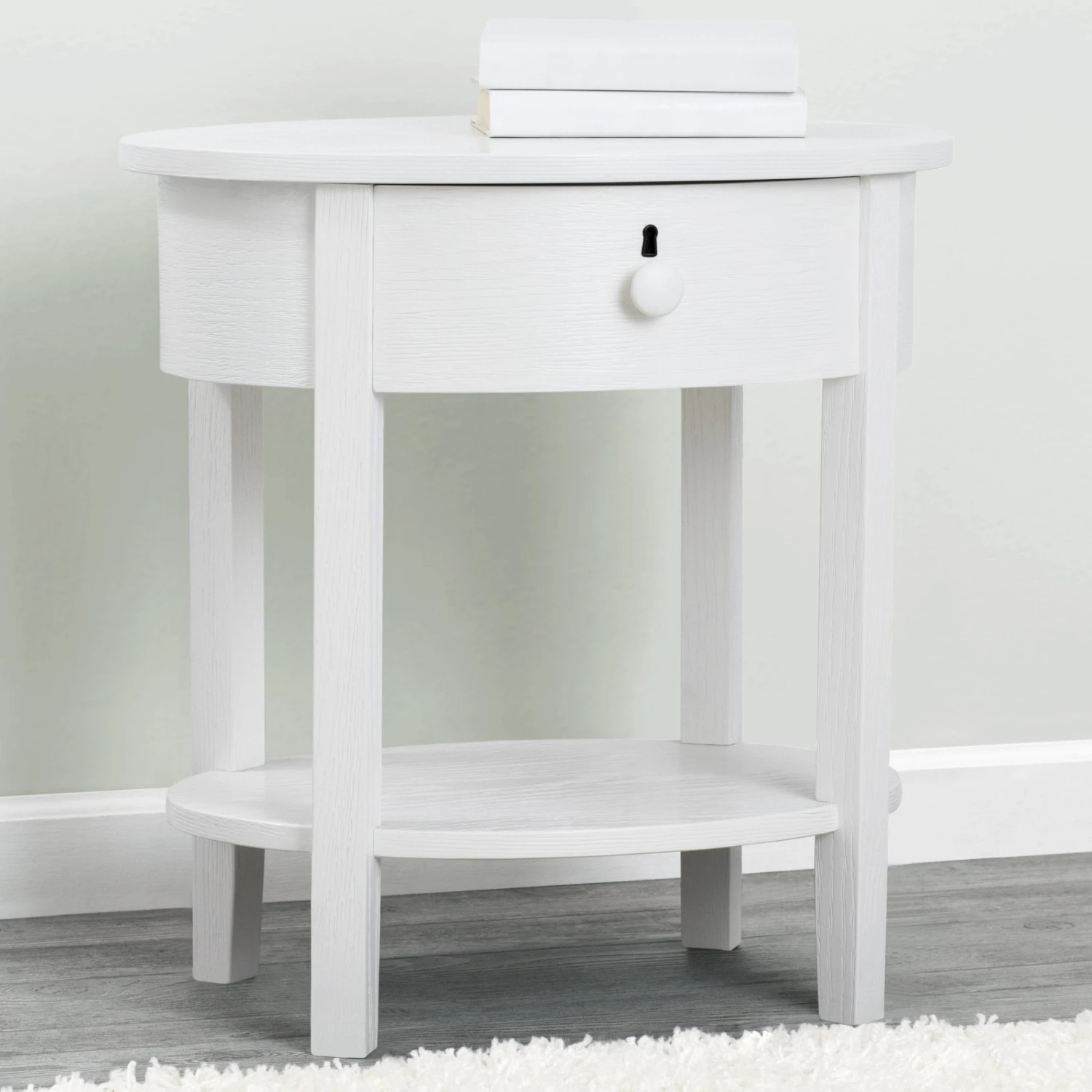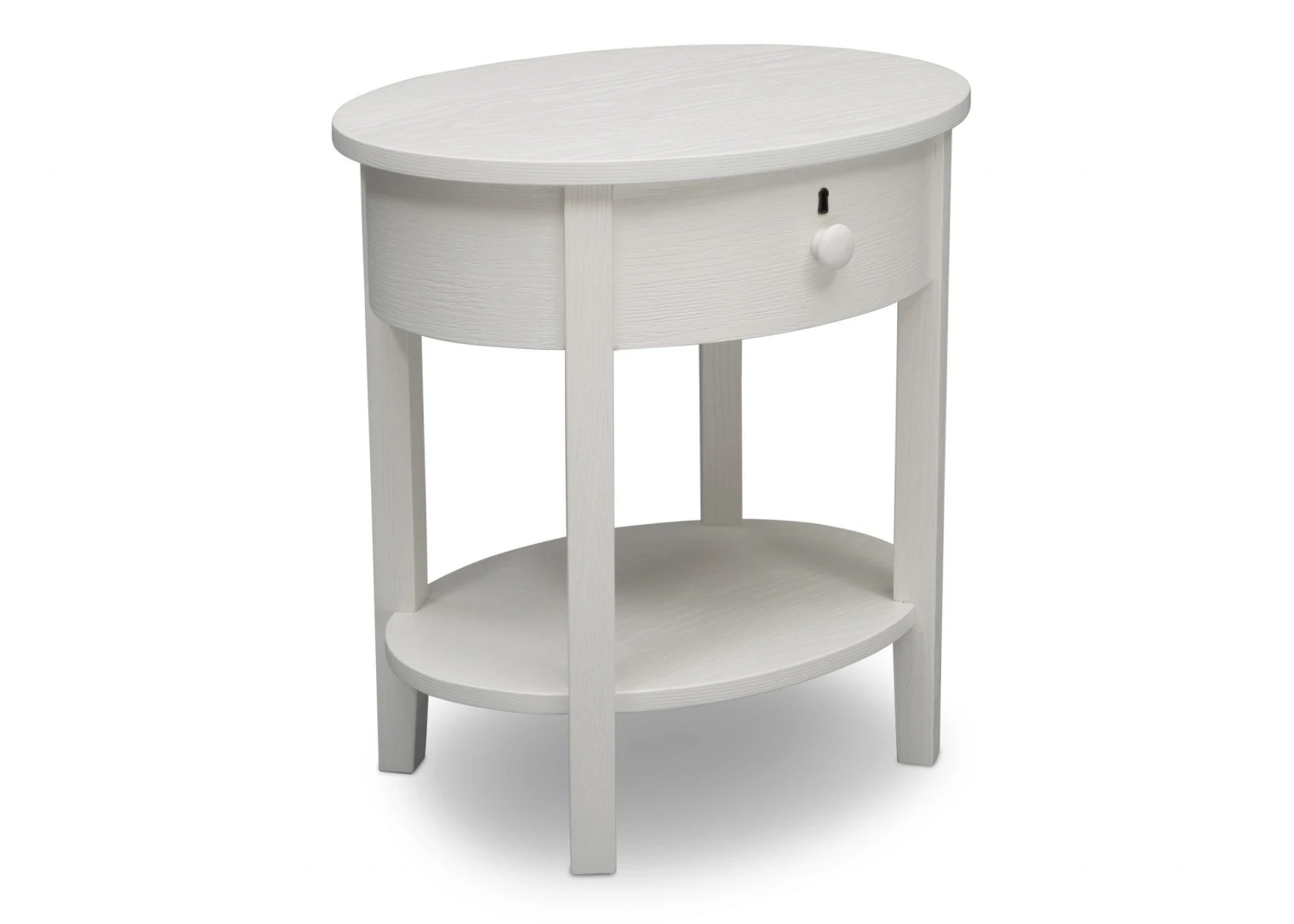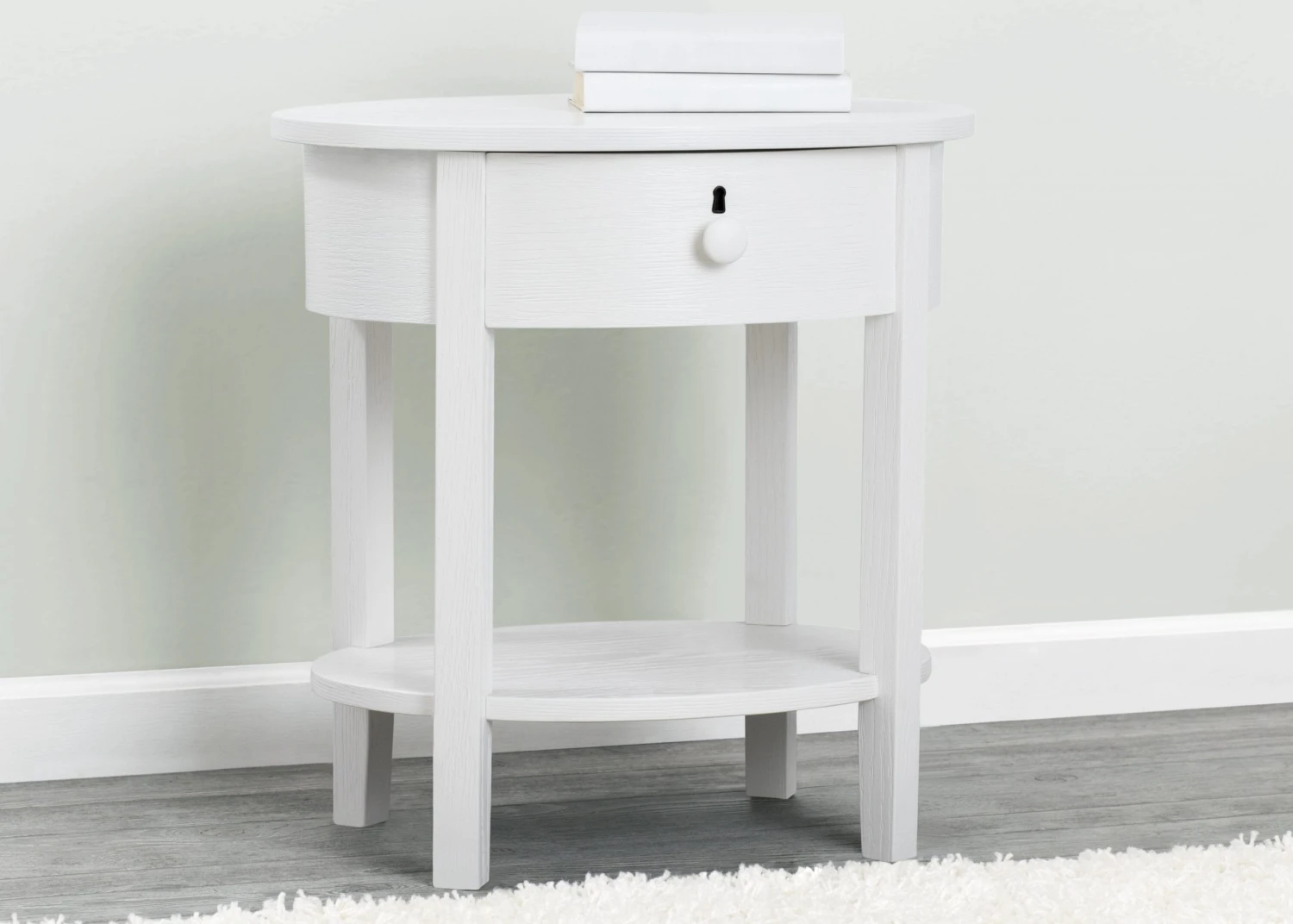 Designed with a playful oval silhouette and textured finish, the Farmhouse Nightstand will stay in style as your child grows. Both open and closed storage creates a functional display space for essentials, while tapered legs and keyhole detailing complete the look.