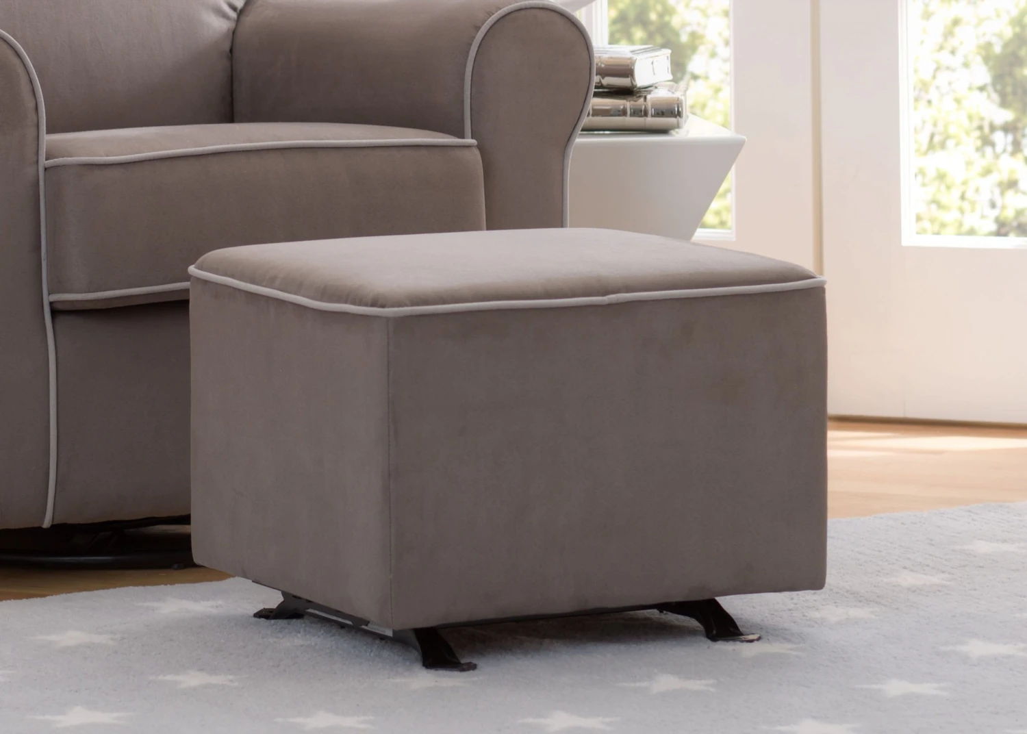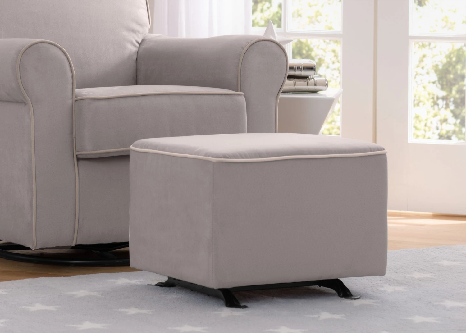 Plushly padded and with a modern square design, this Nursery Gliding Ottoman from Delta Children is the perfect place to rest your feet while bonding with Baby. A generous foam fill ensures long-lasting comfort and leg support while the ottoman’s smooth, rocking motion soothes tired parents and babies alike. Coordinates with other nursery glider swivel rocker chairs from Delta Children in the same microfiber upholstery or you can repurpose it in other rooms as extra seating.
