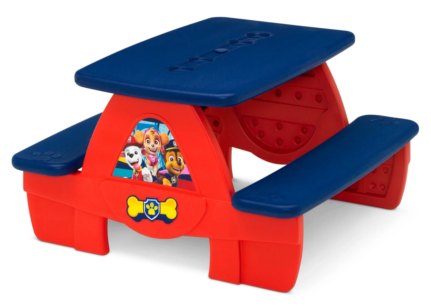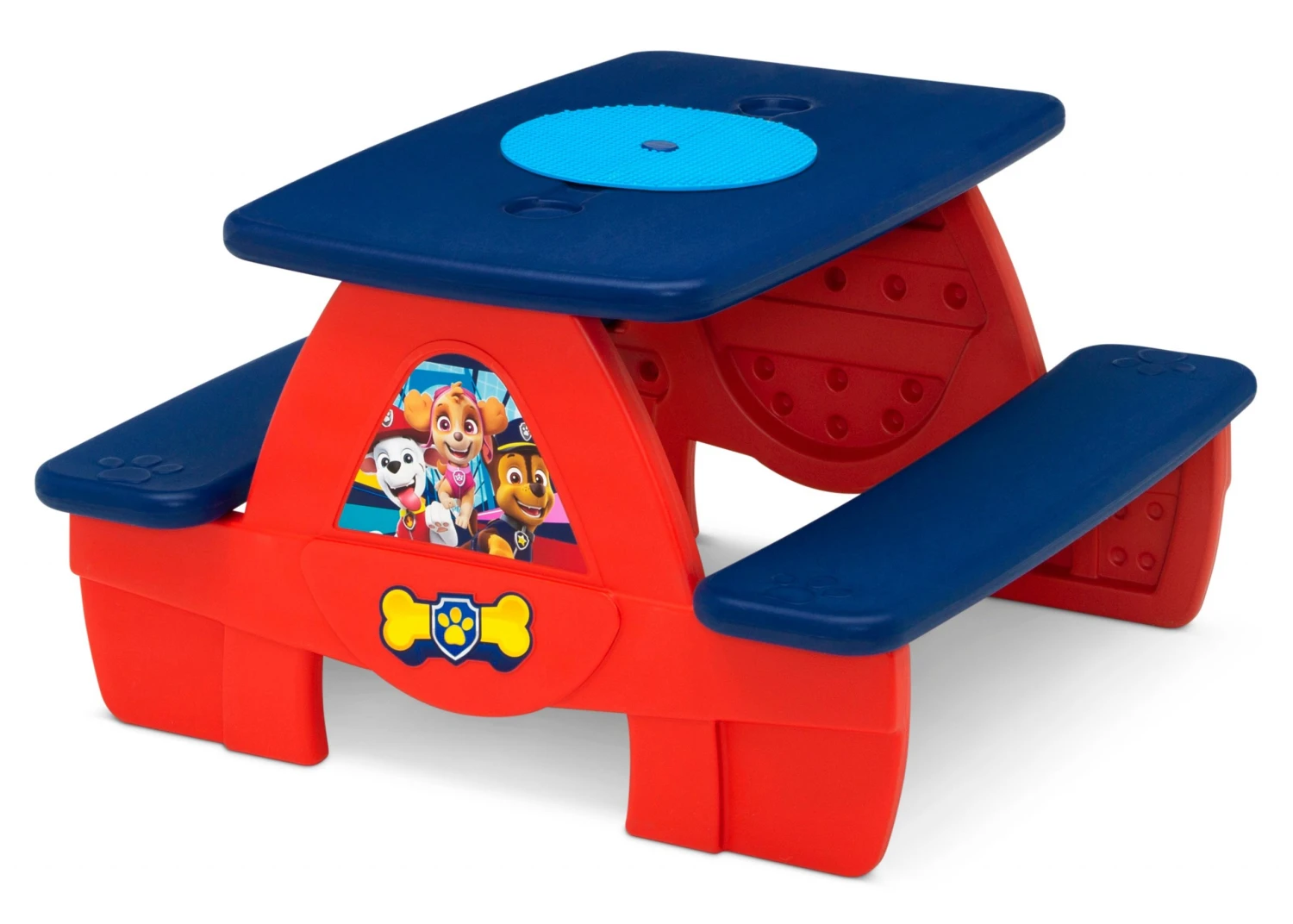 Be prepared for backyard barbecues and playdates with the PAW Patrol 4 Seat Activity Picnic Table with Board for Building Blocks and Built-In Cupholders by Delta Children. Made from weather-resistant plastic, this durable picnic table sits four kids comfortably, and can be used outdoors or indoors for eating, playing, art activities or games–there are so many ways to use this sturdy picnic table! Colorful graphics of Chase, Marshall and Skye and three-dimensional paw prints add playful style while four built-in cupholders keep drinks securely in place. Designed to boast and encourage your child’s imagination the table also features a removable building block board that is compatible the most popular budling blocks (blocks not included). Easy to assemble, the table snaps together in minutes, so you’ll be ready for fun in no time!