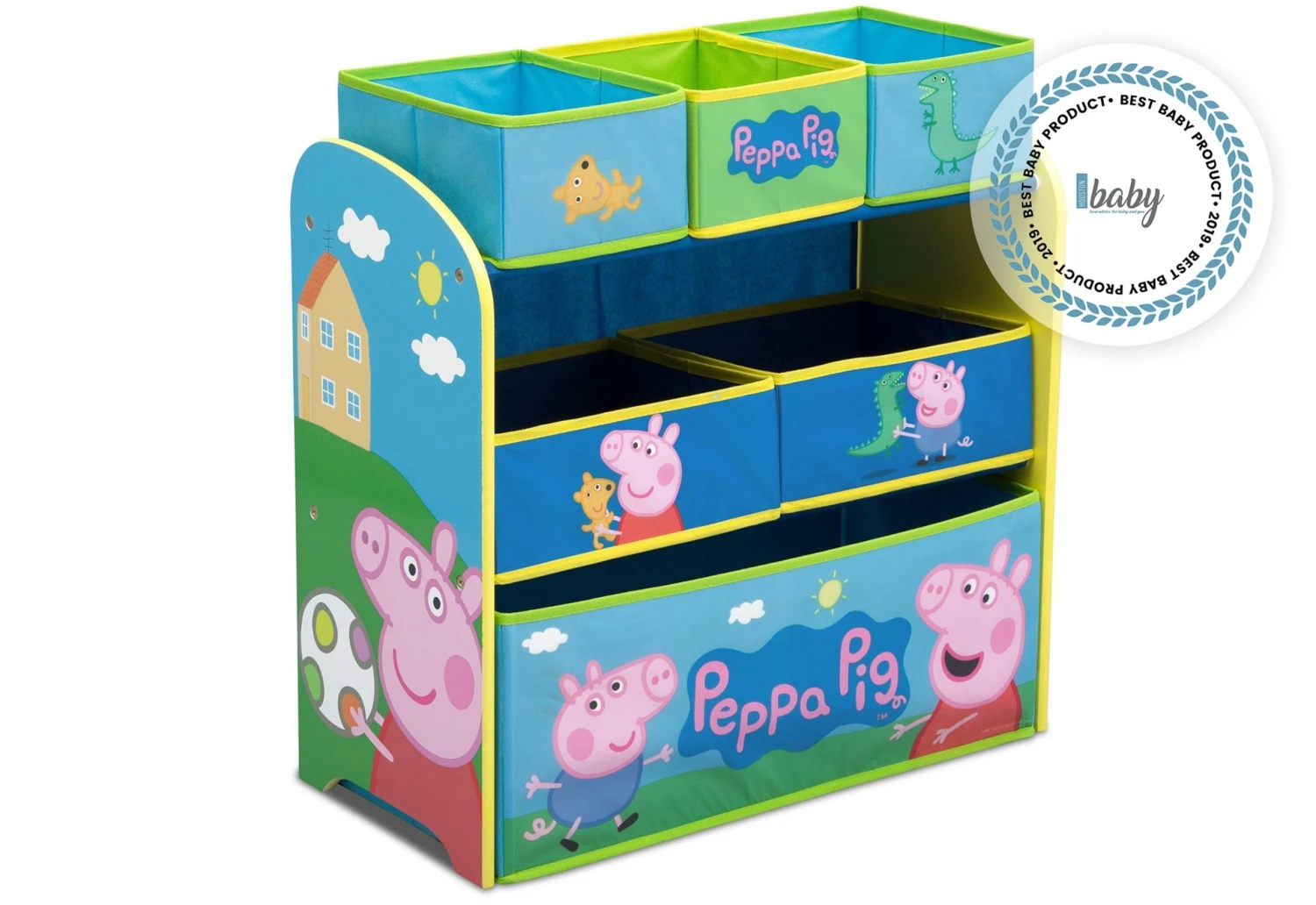 Don’t let your playroom become a sty—the Peppa Pig Multi-Bin Toy Organizer from Delta Children will help make cleaning up fun and easy! Covered in colorful graphics of Peppa, Mummy Pig, Daddy Pig and George, this practical storage solution is supported by a sturdy frame and features six uniquely sized fabric bins to fit toys of all shapes and sizes.