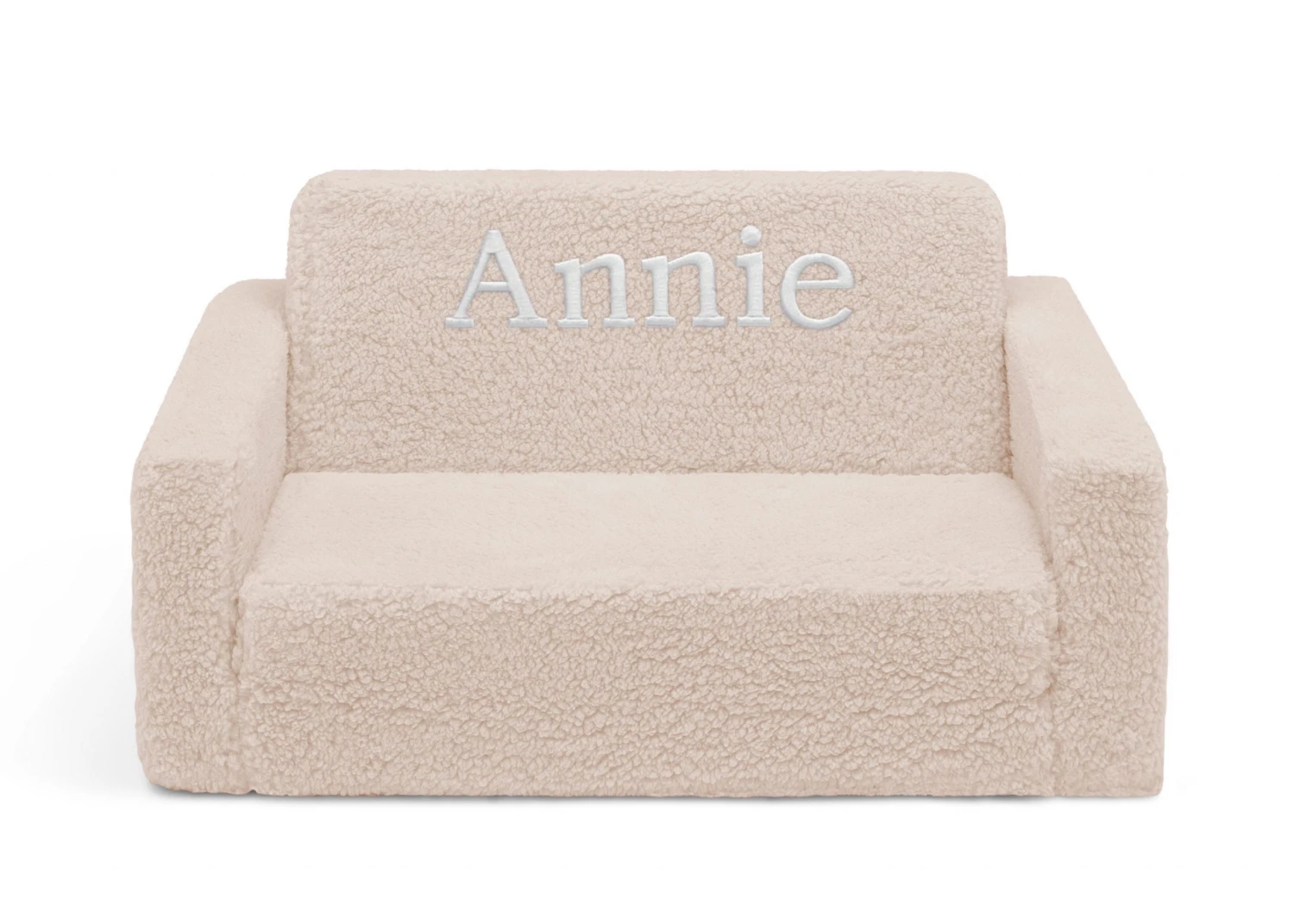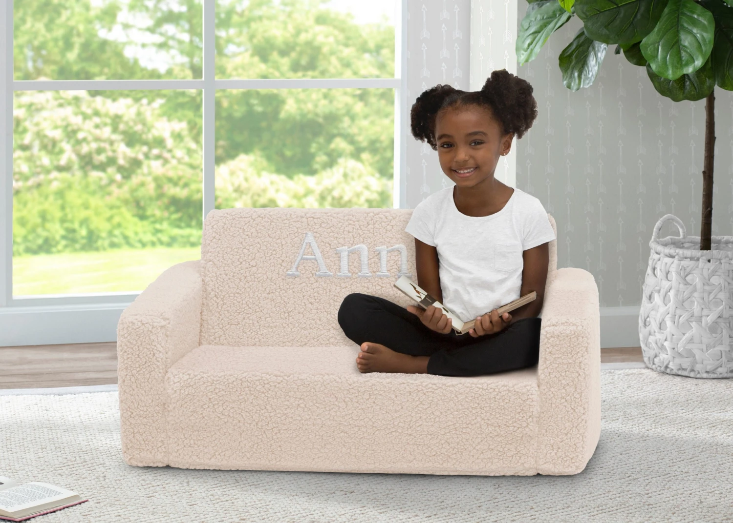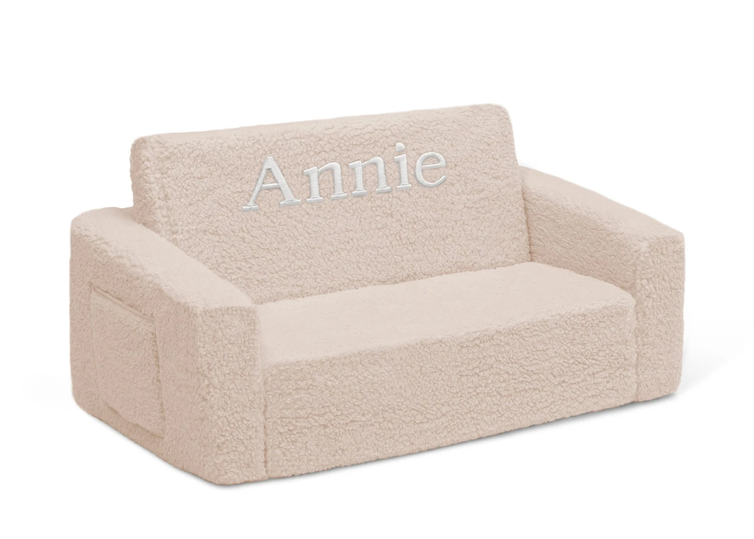 The Cozee Flip-Out Sherpa 2-in-1 Convertible Sofa to Lounger by Delta Children is a cozy couch by day, laid-back lounger by night. This convertible sofa easily flips open to reveal multiple ways for your child to relax–they’ll love to sit and read or watch their favorite movies on the sofa but when it’s time for a nap, this seat folds out into a comfy sleeper bed. Big enough to fit three small kids comfortably in sofa mode, it’s light enough to move around the house and is ideal for your children to share during playtime or sleepovers. The super-soft Sherpa slipcover with easy-to-reach side pocket creates the ultimate retreat for your little one. The supportive foam construction will keep its shape and provides all-day comfort. Designed to ship in a super-small box, this lightweight foam kids’ sofa and lounger may take up to 24 hours to fully expand once unboxed. Machine-washable slipcover zips off for easy cleaning. Personalize it with a name for the perfect finishing touch. Recommended for ages 18 months+.