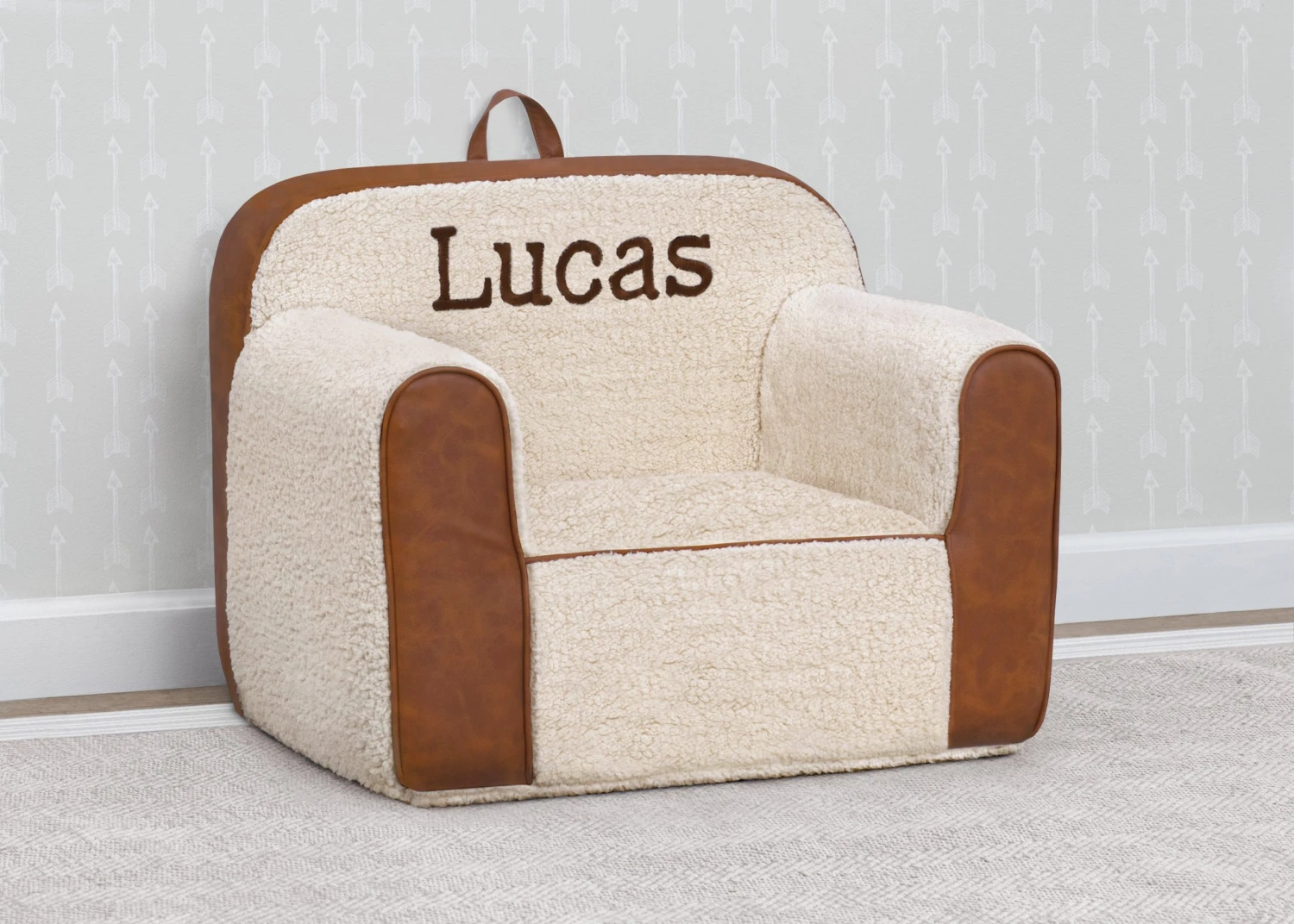 Cozy up to the Cozee Sherpa Chair for Kids by Delta Children. A snuggly spot for reading, watching TV or just hanging out, this supremely comfy chair features a Sherpa and faux leather slipcover that adds texture and comfort, plus it’s removable and machine washable for easy cleaning. Perfect for the playroom, living room or your child’s bedroom, this kids’ foam chair goes anywhere they do–the lightweight design with handle on top is easy to move from room to room. Personalize it with a name for the perfect finishing touch. Recommended for ages 18 months+ – 6 years.