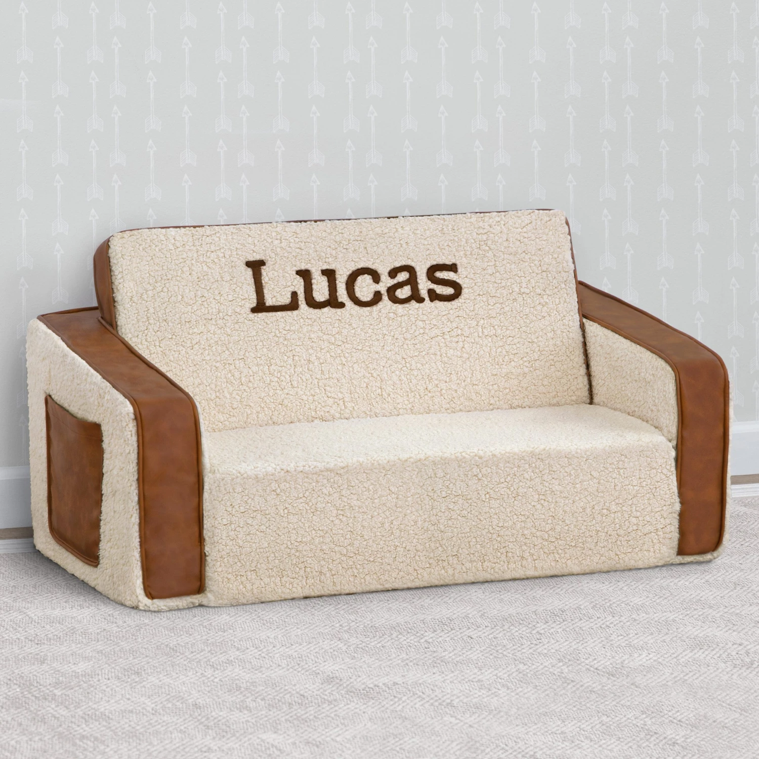 The Cozee Flip-Out Sherpa 2-in-1 Convertible Sofa to Lounger by Delta Children is a cozy couch by day, laid-back lounger by night. This convertible sofa easily flips open to reveal multiple ways for your child to relax–they’ll love to sit and read or watch their favorite movies on the sofa but when it’s time for a nap, this seat folds out into a comfy sleeper bed. Big enough to fit three small kids comfortably in sofa mode, it’s light enough to move around the house and is ideal for your children to share during playtime or sleepovers. The super-soft Sherpa and faux leather slipcover with easy-to-reach side pocket creates the ultimate retreat for your little one. The supportive foam construction will keep its shape and provides all-day comfort. Designed to ship in a super-small box, this lightweight foam kids’ sofa and lounger may take up to 24 hours to fully expand once unboxed. Machine-washable slipcover zips off for easy cleaning. Personalize it with a name for the perfect finishing touch. Recommended for ages 18 months+.
