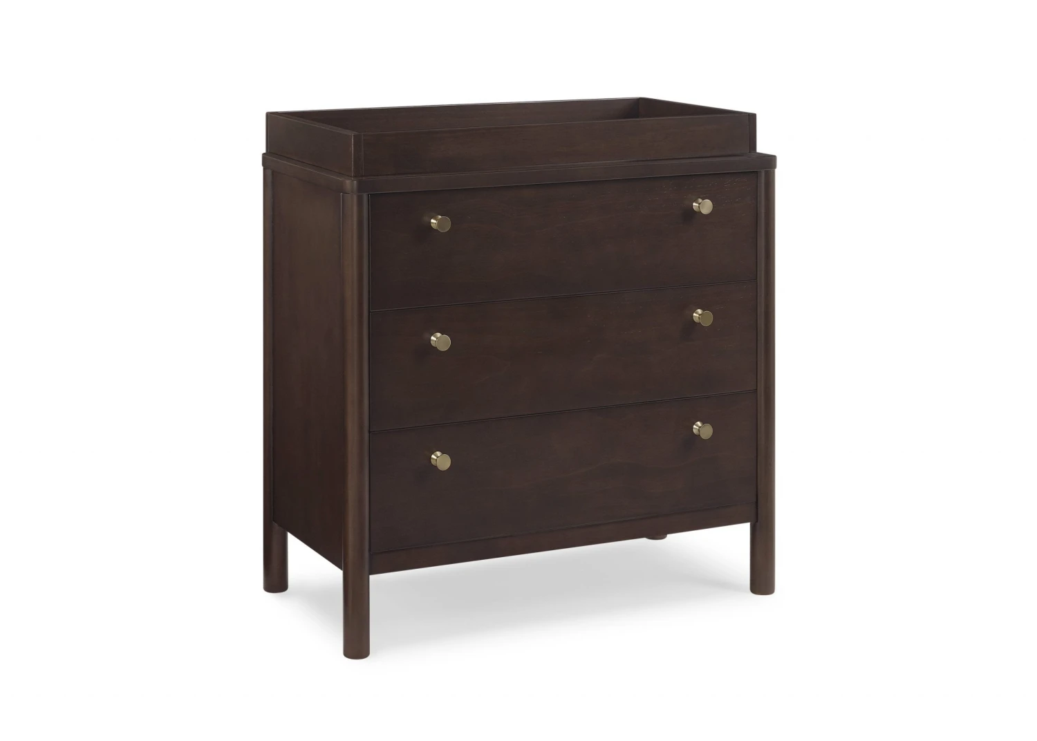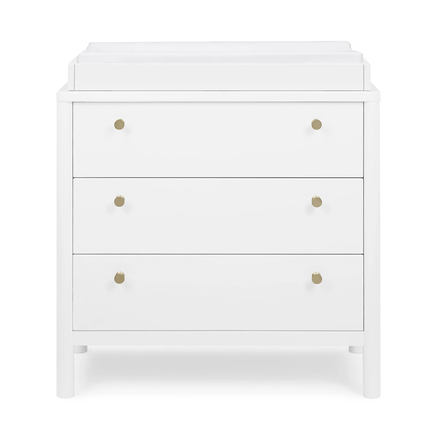 The Remy 3 Drawer Dresser with Changing Top by Delta Children will instantly elevate your nursery with its mid-century modern style. Our updated take on retro features clean lines, brass knobs and three spacious soft-close drawers framed by cylindrical posts. Built to grow with your child, the Remy includes a removable changing top that creates the perfect space for diaper changing sessions now and is easily detachable, so you can create a more grown-up space later on. Pair this dresser with other pieces in the Remy Collection for a coordinated look.
