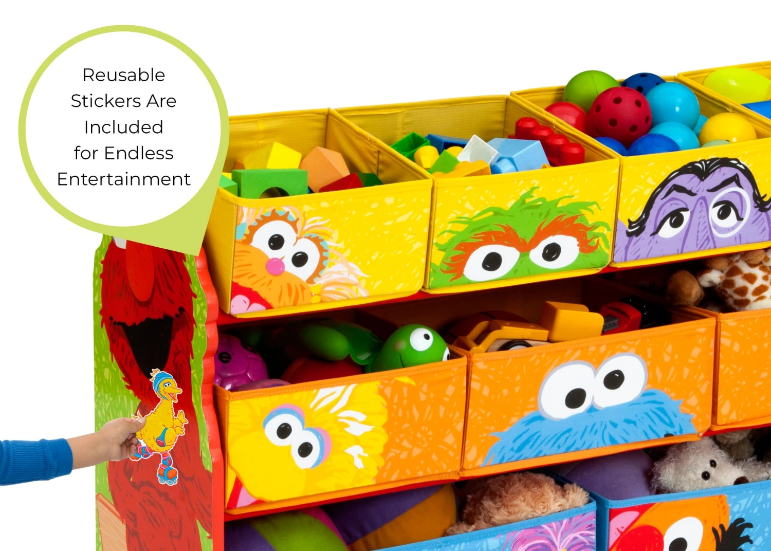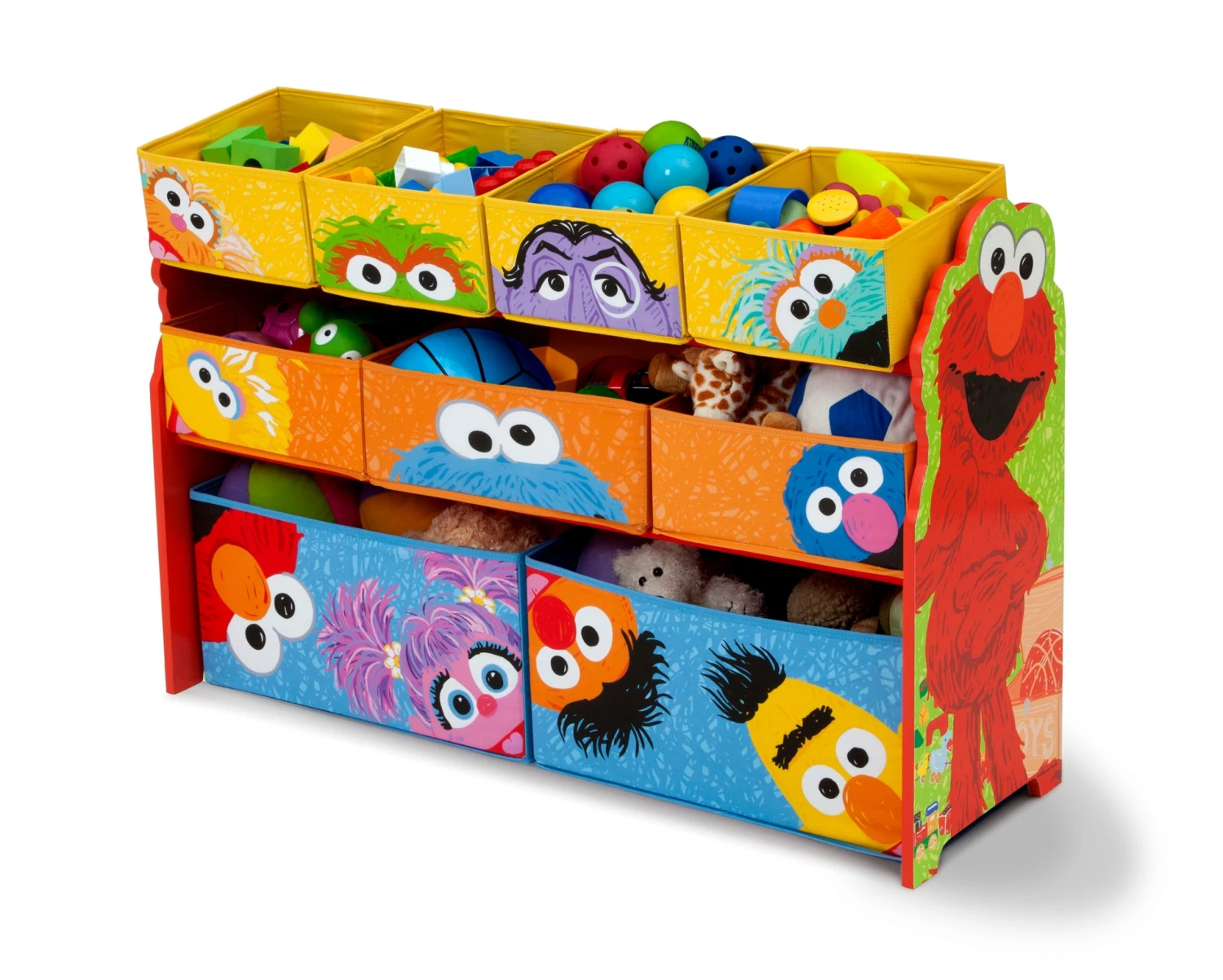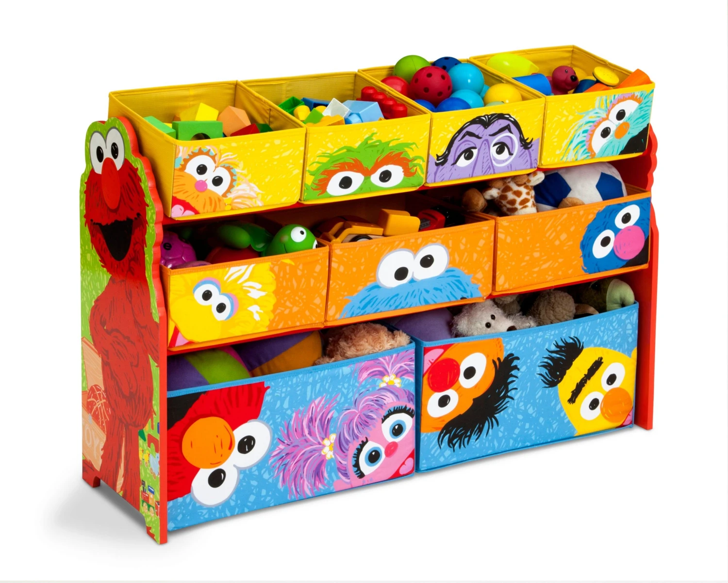 Can you tell me how to get…the kids to clean their room? With this Sesame Street Deluxe Multi-Bin Toy Organizer, of course! Supported by sturdy wooden frame, it features nine fabric bins and colorful images of the whole Sesame Street gang. A fun option for easy organization of toys large and small, it encourages kids to clean up in record time.