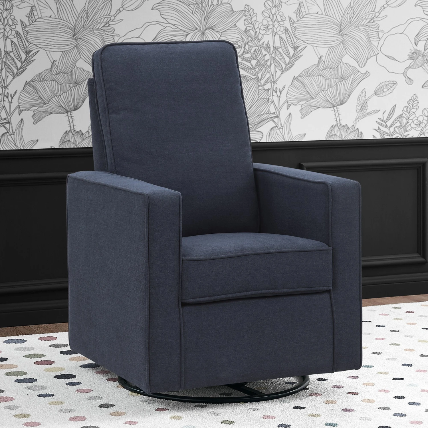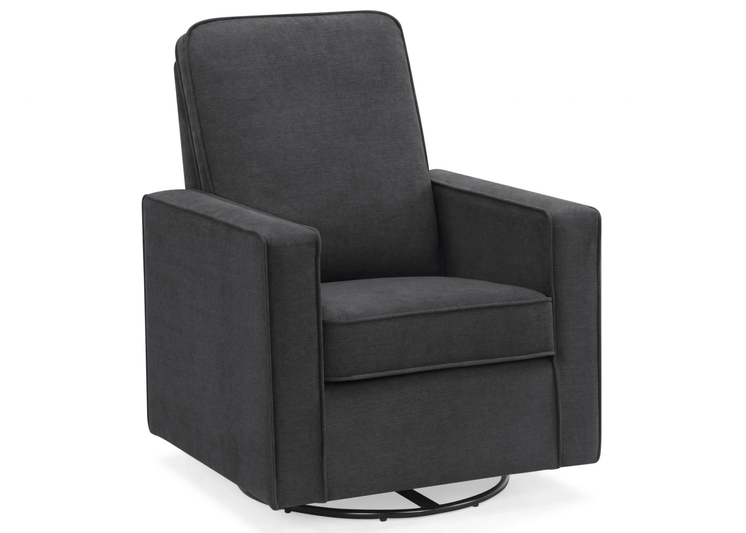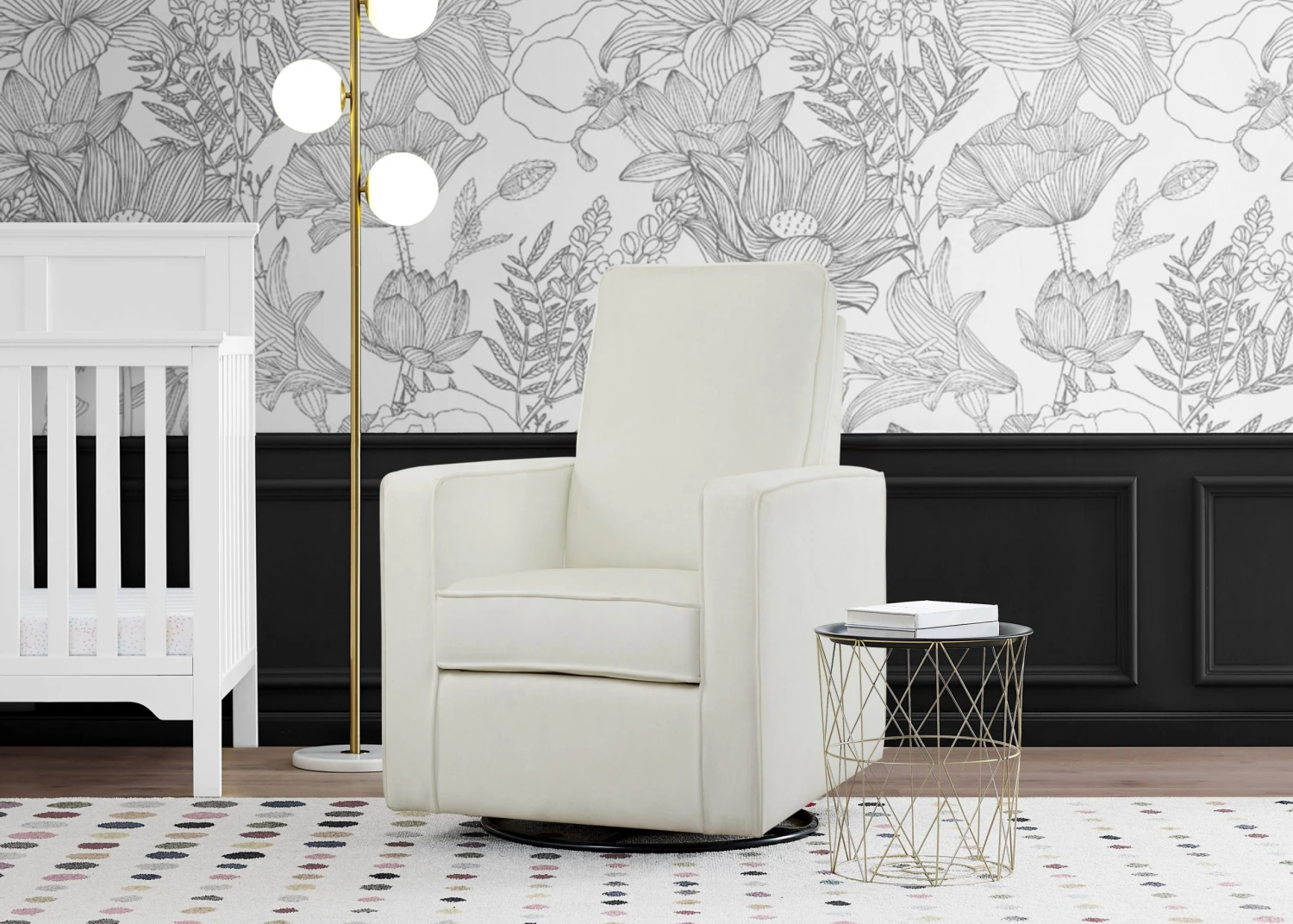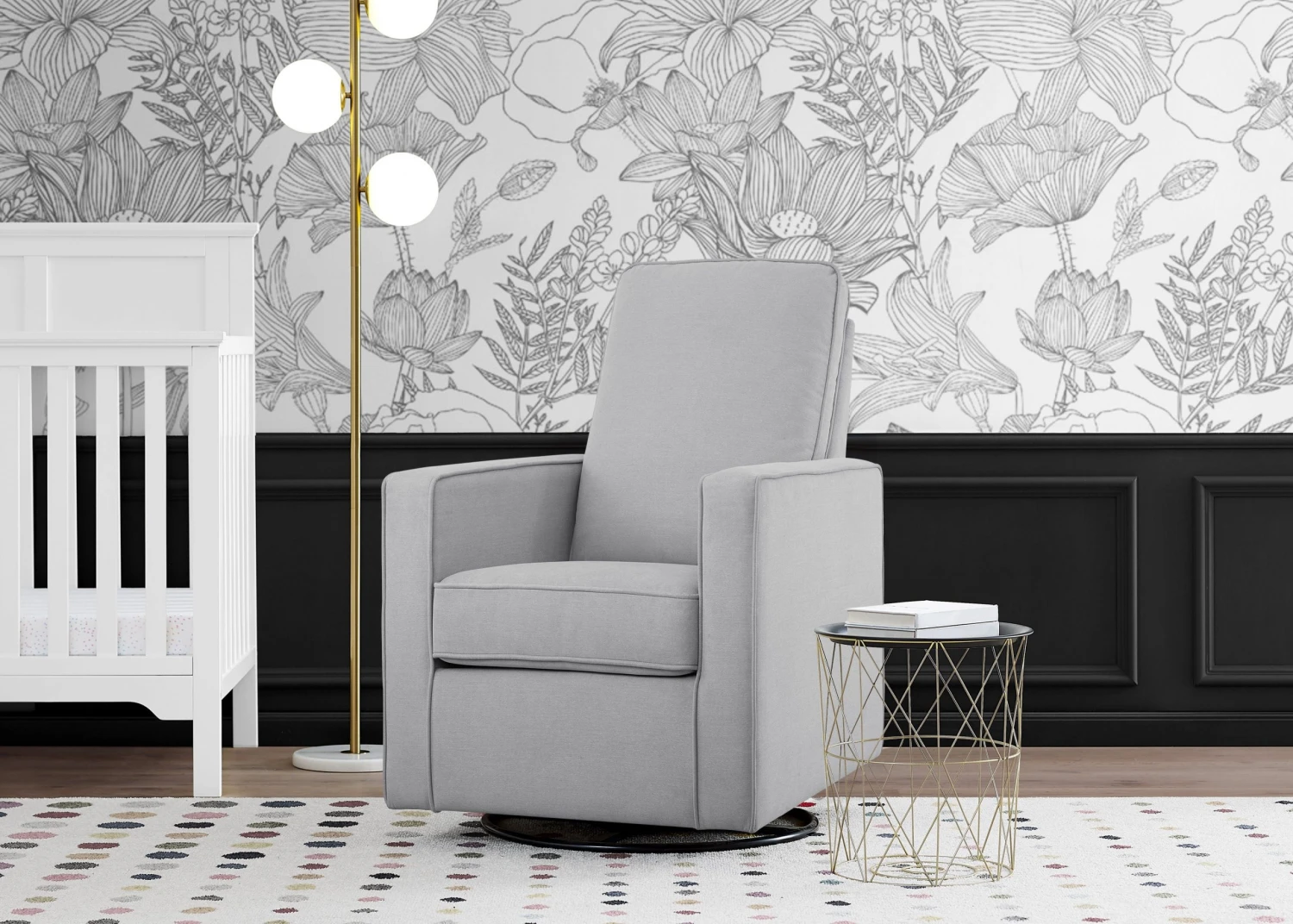 The Skye Nursery Glider Swivel Rocker Chair with LiveSmart Fabric by Delta Children is specifically designed to help support you and your baby. This chair glides and swivels 360-degrees, making it the most soothing spot for late-night feedings, story time and gliding your little one to sleep. Upholstered in LiveSmart fabric, a superior performance fabric that is stain-resistant and repels moisture, this glider is the smart choice for high traffic areas like the nursery or living room. The chair’s whisper quiet movements ensure a serene environment while the soft seat cushion (7″ thick), padded armrests and backrest allow you to sit comfortably for hours. Its modern shape makes it an easy addition to any room in your house. Available in Dark Grey, Light Grey, Pearl and Navy.