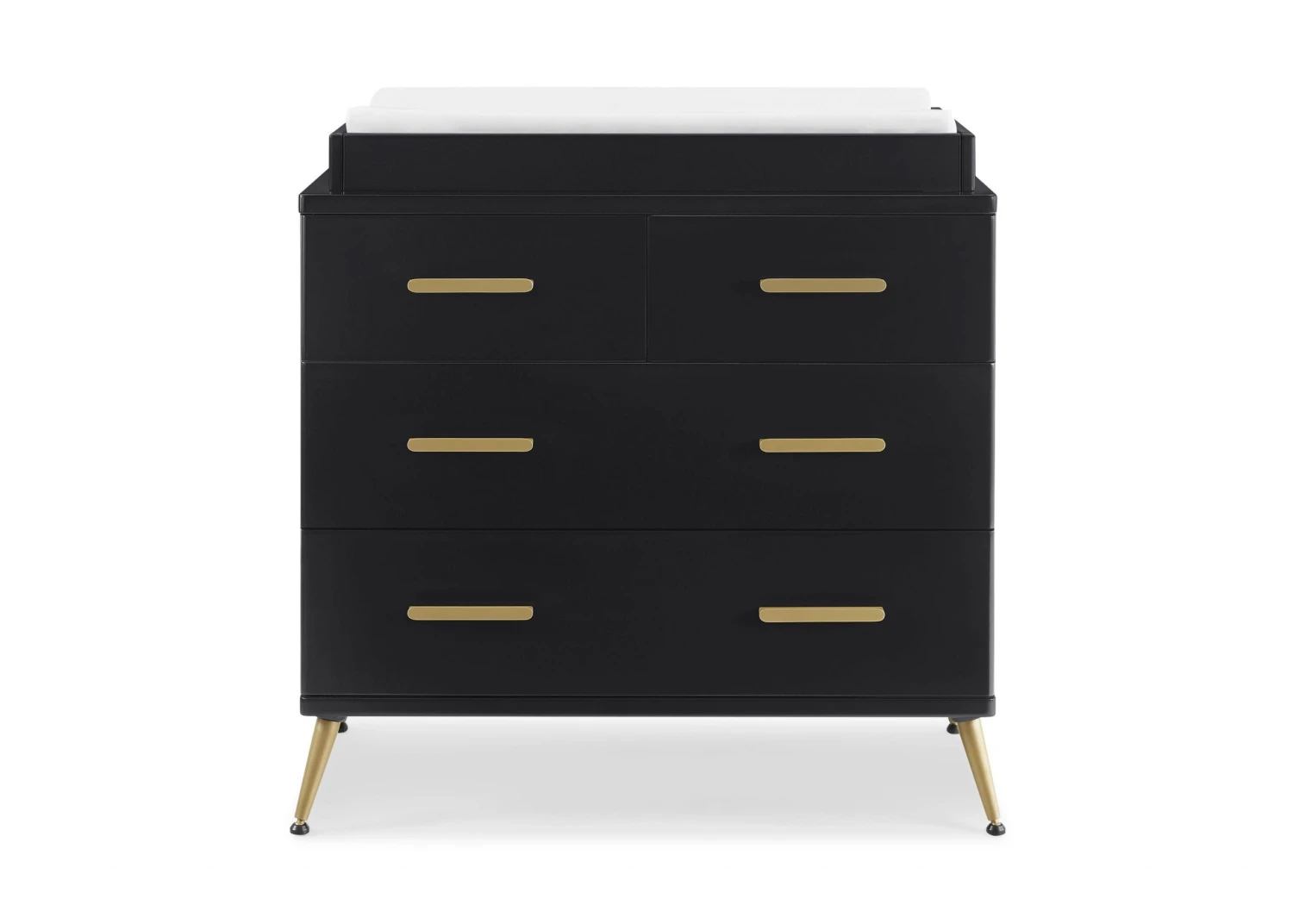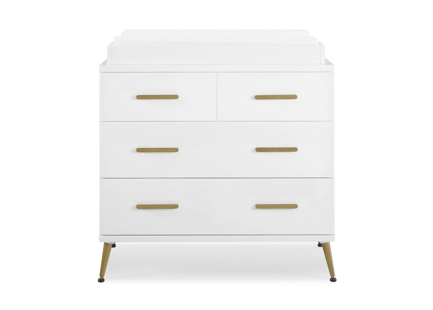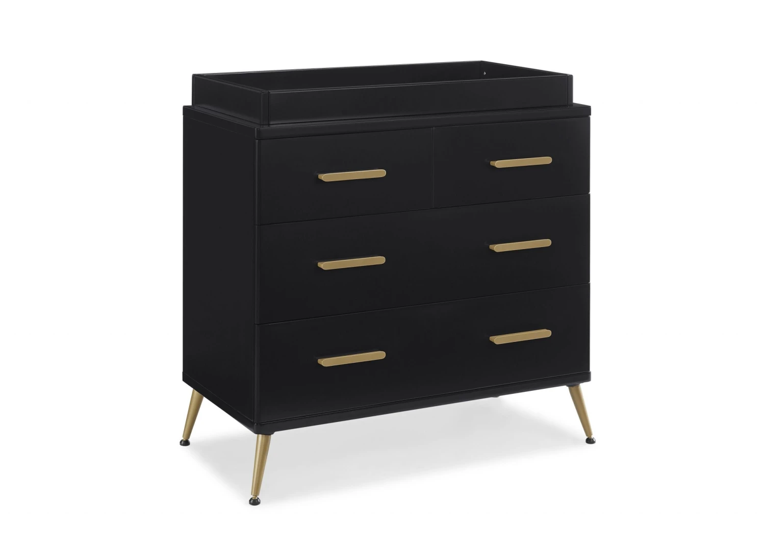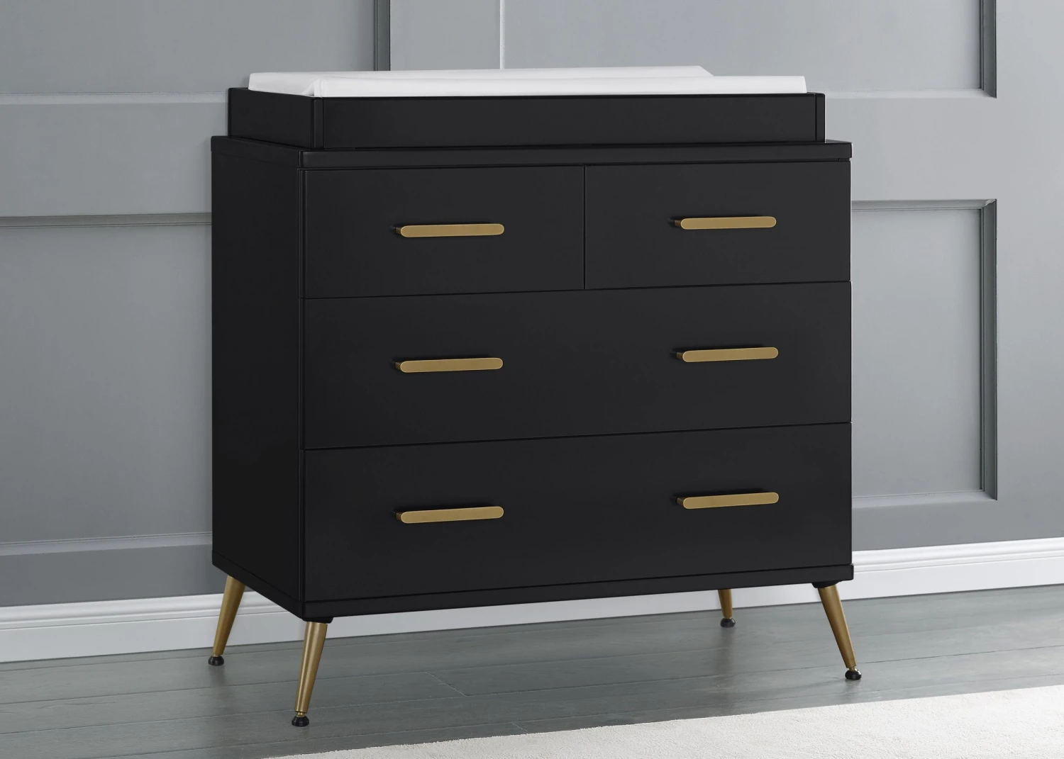 The Sloane 4 Drawer Dresser with Changing Top by Delta Children is the ultimate piece of kids’ furniture. Sleek and modern, it boasts a mixed material design with bronze splayed feet and drawer handles that make it elevated enough for your master bedroom. But this dresser is more than just fashionable—it’s super functional, too. It features four spacious drawers for ample clothing storage and includes a removable changing top that creates the perfect space for diaper changing. Remove the changing top to create a more grown-up space later on. Pair this dresser with other pieces in the Delta Children Sloane Collection for a coordinated look.