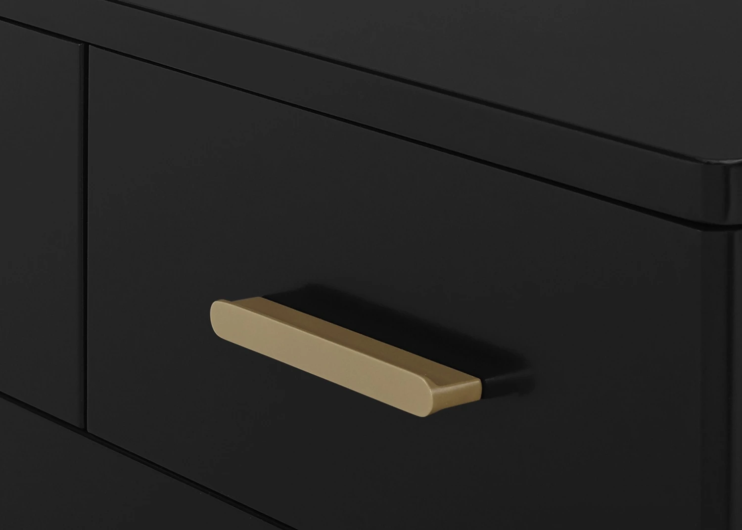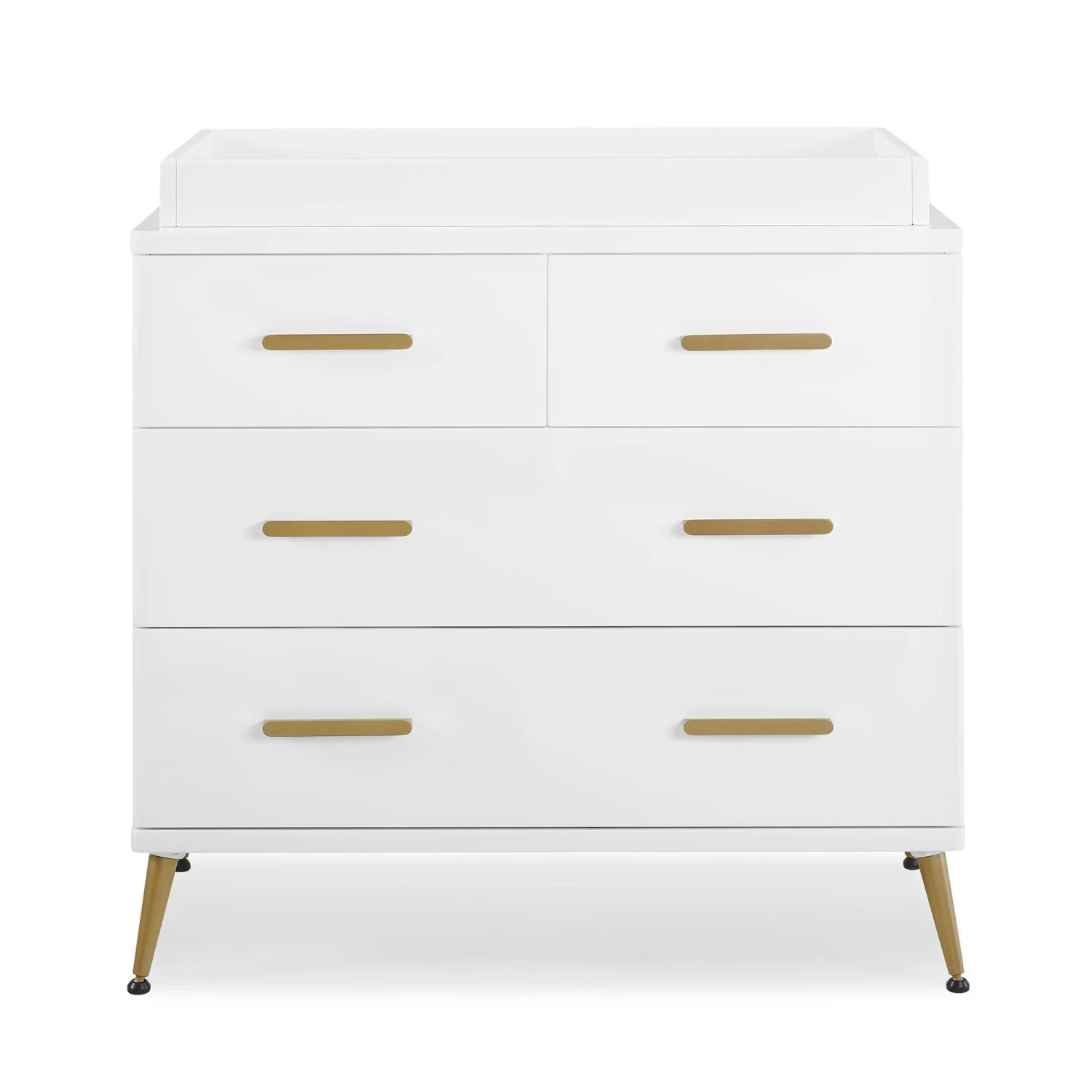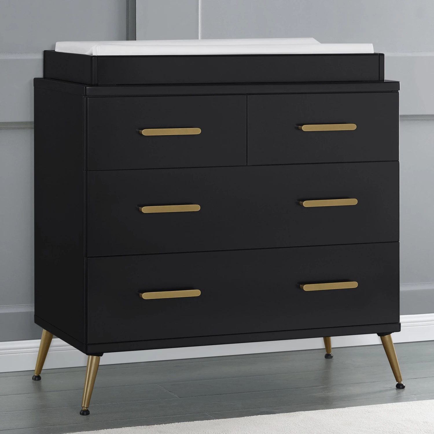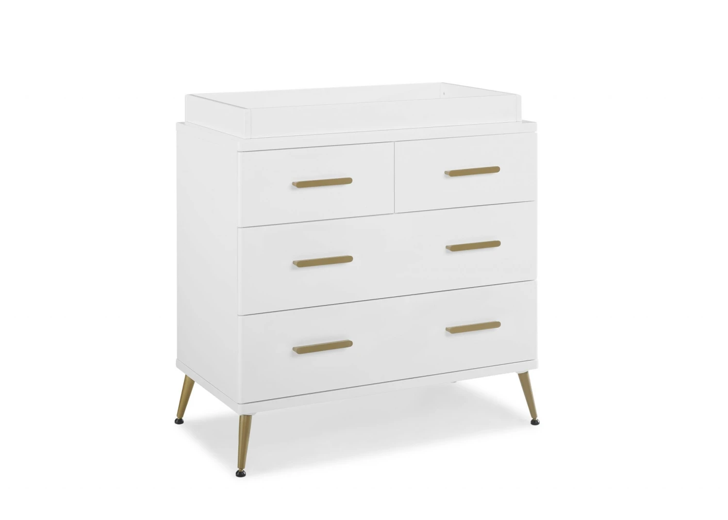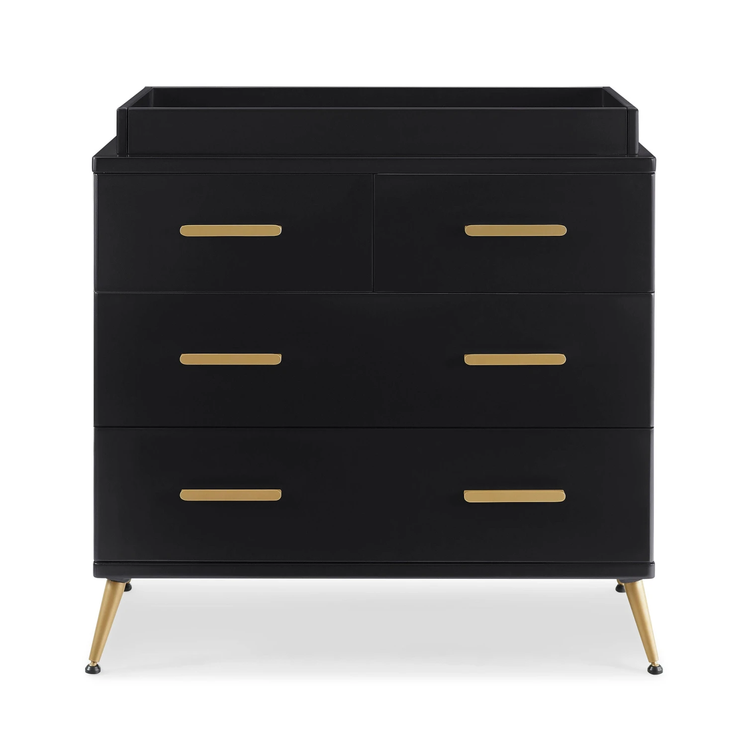 The Sloane 4 Drawer Dresser with Changing Top by Delta Children is the ultimate piece of kids’ furniture. Sleek and modern, it boasts a mixed material design with bronze splayed feet and drawer handles that make it elevated enough for your master bedroom. But this dresser is more than just fashionable—it’s super functional, too. It features four spacious drawers for ample clothing storage and includes a removable changing top that creates the perfect space for diaper changing. Remove the changing top to create a more grown-up space later on. Pair this dresser with other pieces in the Delta Children Sloane Collection for a coordinated look.