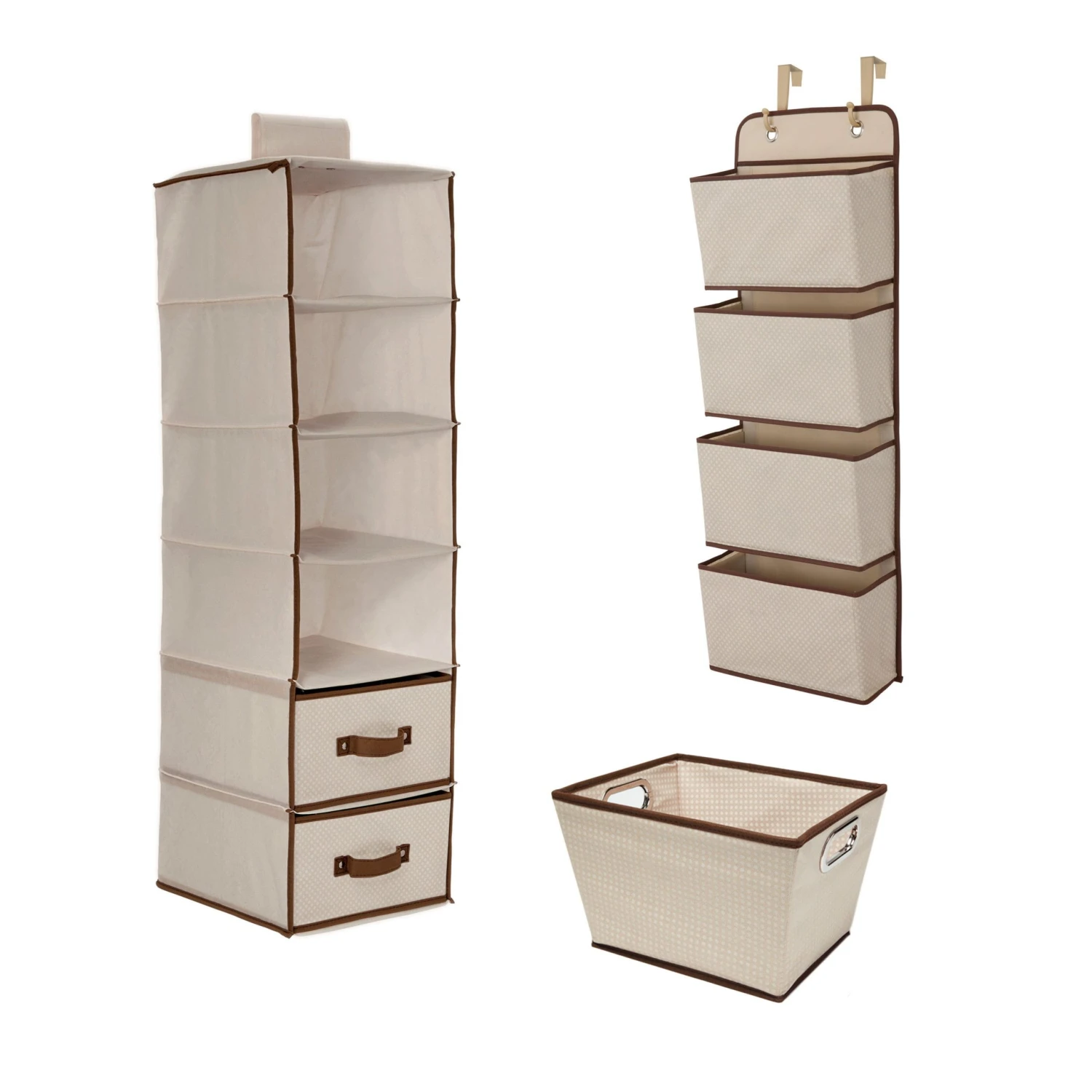 - Set includes 3 items: 4 Pocket Over-The-Door Organizer, 6 Shelf Storage with 2 Drawers, Rectangle Tapered Tote