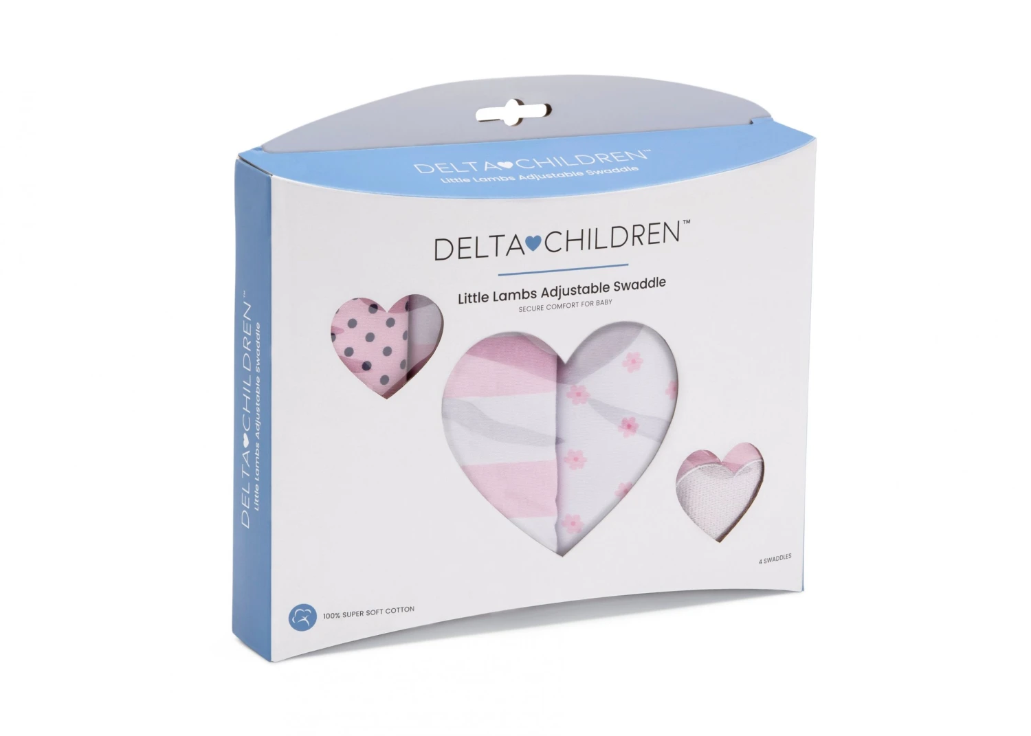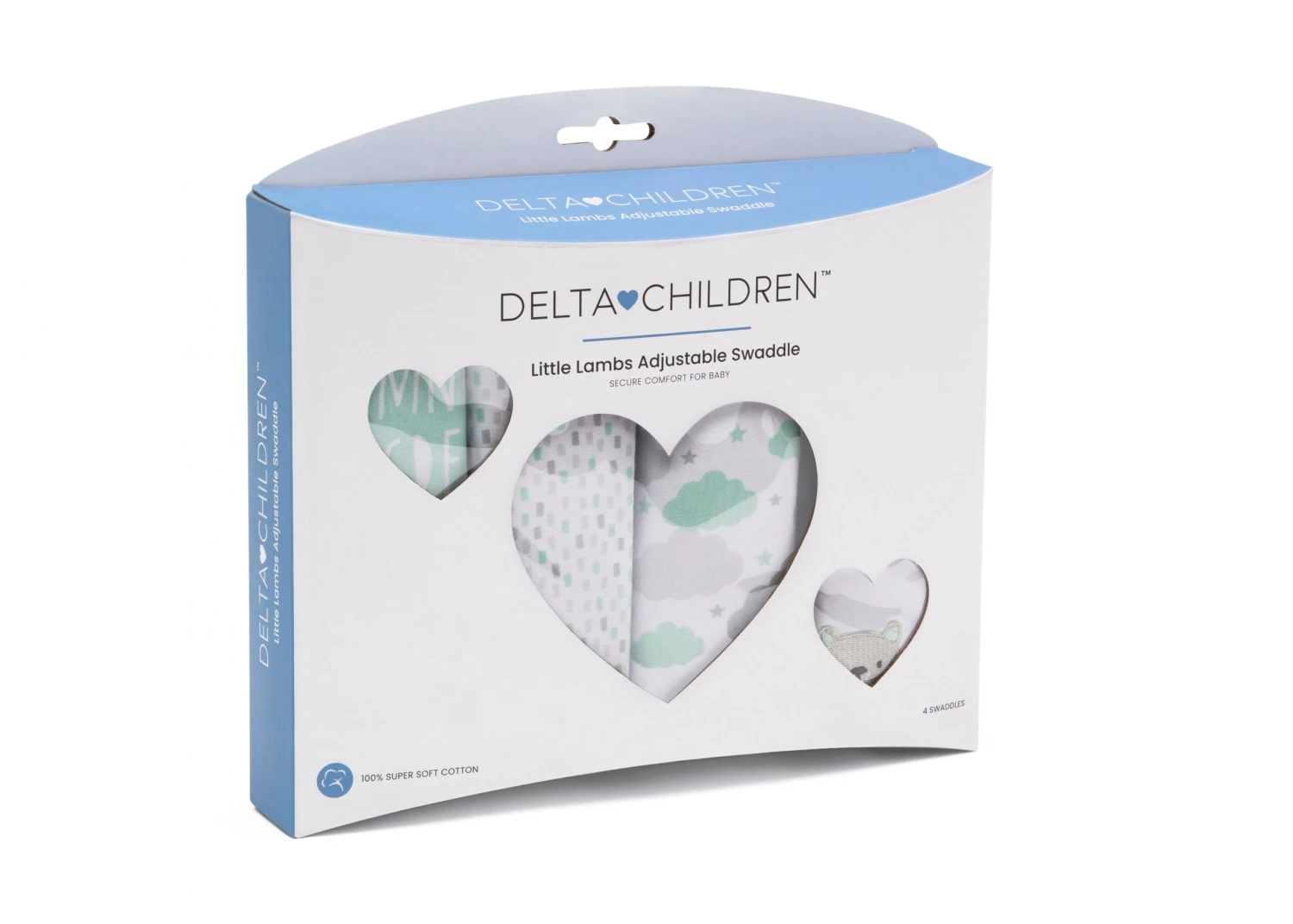 The 4 Pack of Little Lambs Adjustable Swaddle Wraps by Delta Children mimics the safety and comfort of mom’s womb and helps prevent startle reflex, promoting a safer, sounder sleep for your newborn. An easy option that allows parents to quickly achieve a snug fit, these super-soft swaddles feature an adjustable design that fasten with hook and loop attachments to create the perfect fit. Made of 100% natural cotton, theses Little Lambs Adjustable Swaddle Wraps are gentle on baby’s skin, but durable and machine washable for everyday use. The perfect option, these swaddles will keep your little one comfy through the night–and when your baby sleeps well, so will you. Size Small/Medium fits ages 0-3 months, 7-14 pounds.