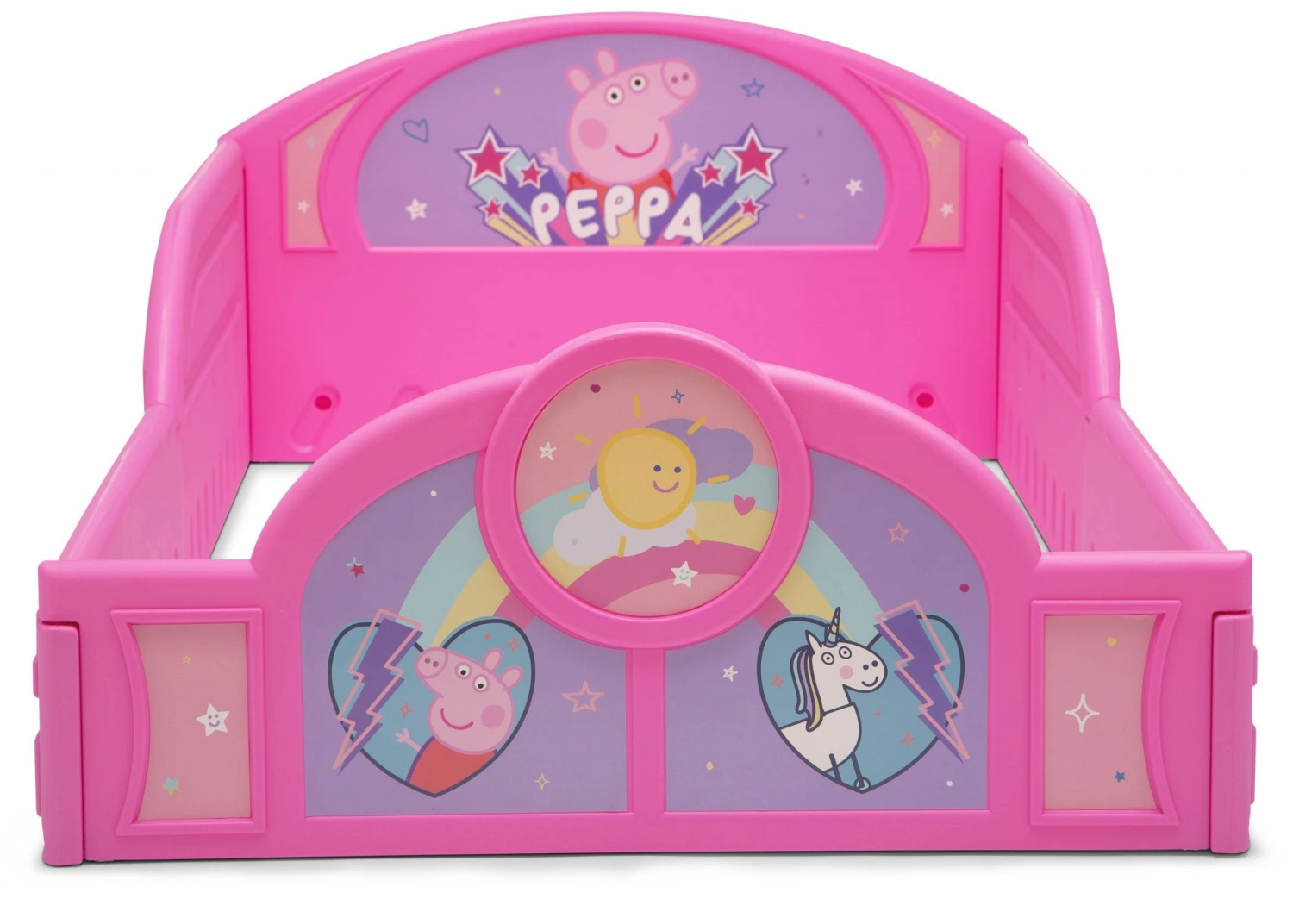 Oh! Your little one will go hog wild for this Peppa Pig Plastic Sleep and Play Toddler Bed by Delta Children! Featuring colorful decals of Peppa, Rebecca Rabbit and Suzy Sheep, this kids’ toddler bed will inspire the sweetest dreams. The bed’s low mattress height and built-in guardrails make it the best option for your child’s first big-kid bed, giving them the independence they crave while keeping them safe throughout the night. And that’s not all, the bed’s versatile plastic frame can also be used as a play enclosure or a ton of other fun things, like a ball pit (play balls not included). Get this toddler bed today and bring home the magic of Peppa Pig