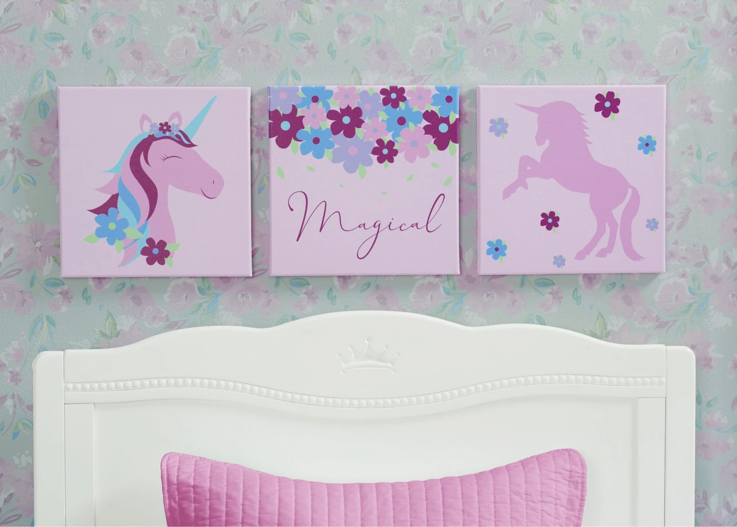 - MANE ATTRACTION: This wall art set features graphics of unicorns, flowers and “Magical” typography | Ideal for unicorn-themed nurseries or bedrooms | Coordinates with Unicorn Rug by Delta Children (sold separately)