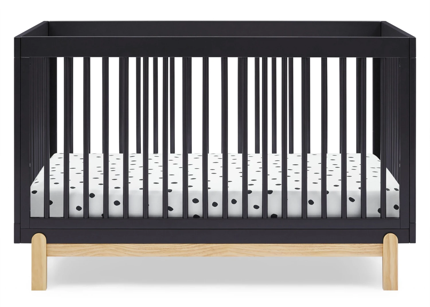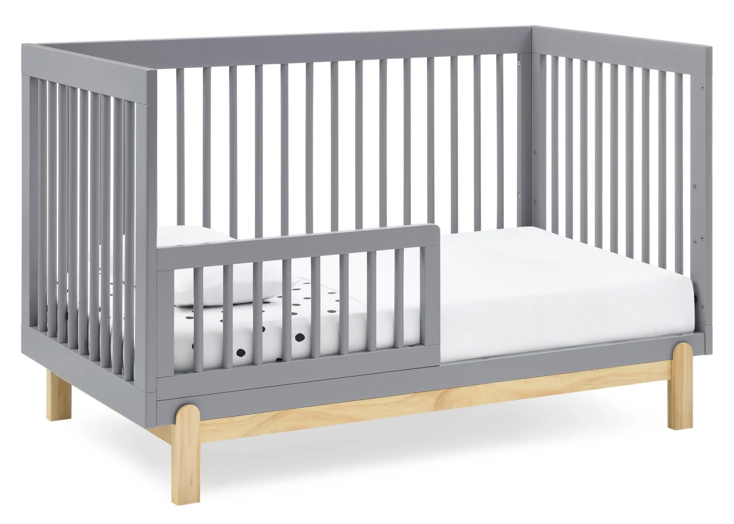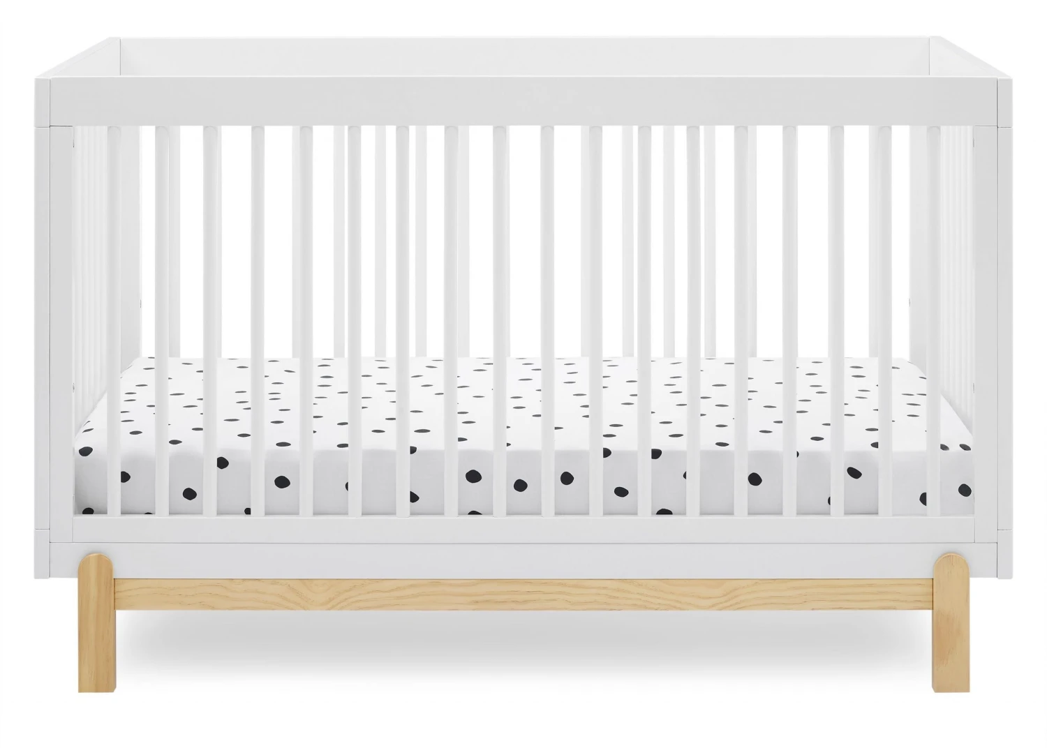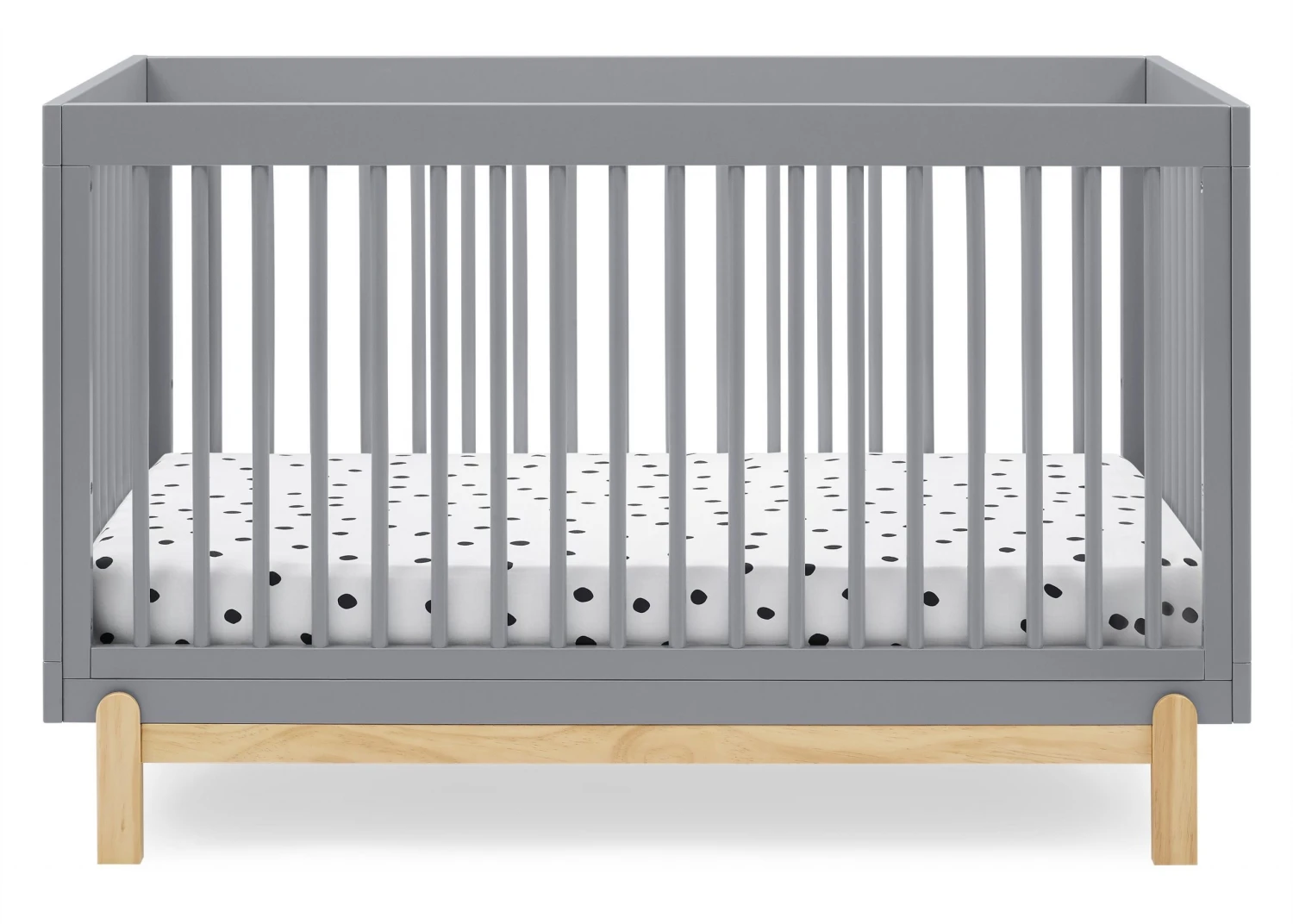 The stylish two-toned Poppy 4-in-1 Convertible Baby Crib by Delta Children will be the centerpiece of your little one’s bedroom for years to come. It’s a timeless, modern crib that features an adjustable height mattress, plus it converts into a toddler bed, daybed and sofa as your child grows (Daybed/Sofa Rail included; Toddler Guardrail #W100725 sold separately). The warm, natural wood tone of this crib’s base and feet is paired with contrasting round spindles to create a modern, sleek style that adapts to all your child’s sleep needs from baby to big-kid. To complete your nursery, pair the Poppy 4-in-1 Convertible Crib with the Poppy 3 Drawer Dresser with Cubbies by Delta Children. Crib is available in Bianca White with Natural, Grey with Natural and Midnight Grey with Natural. Crib mattress not included.