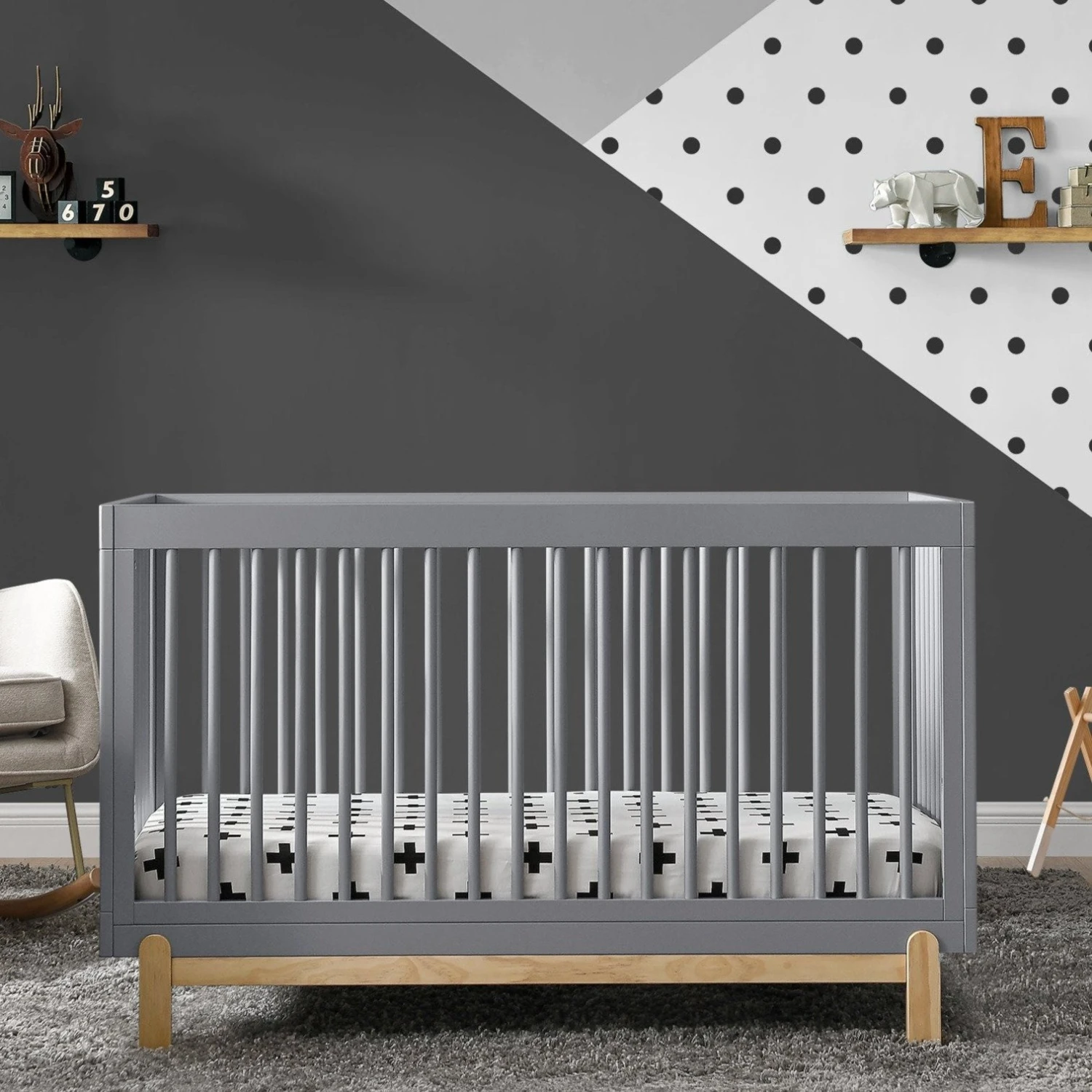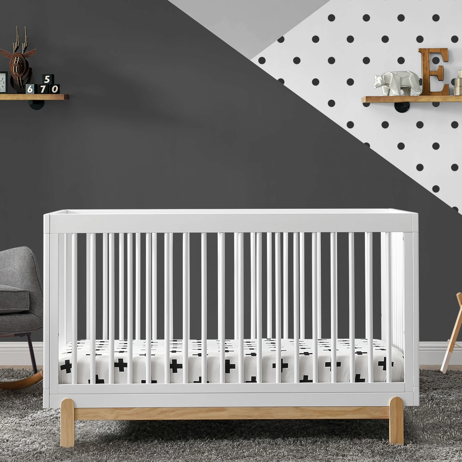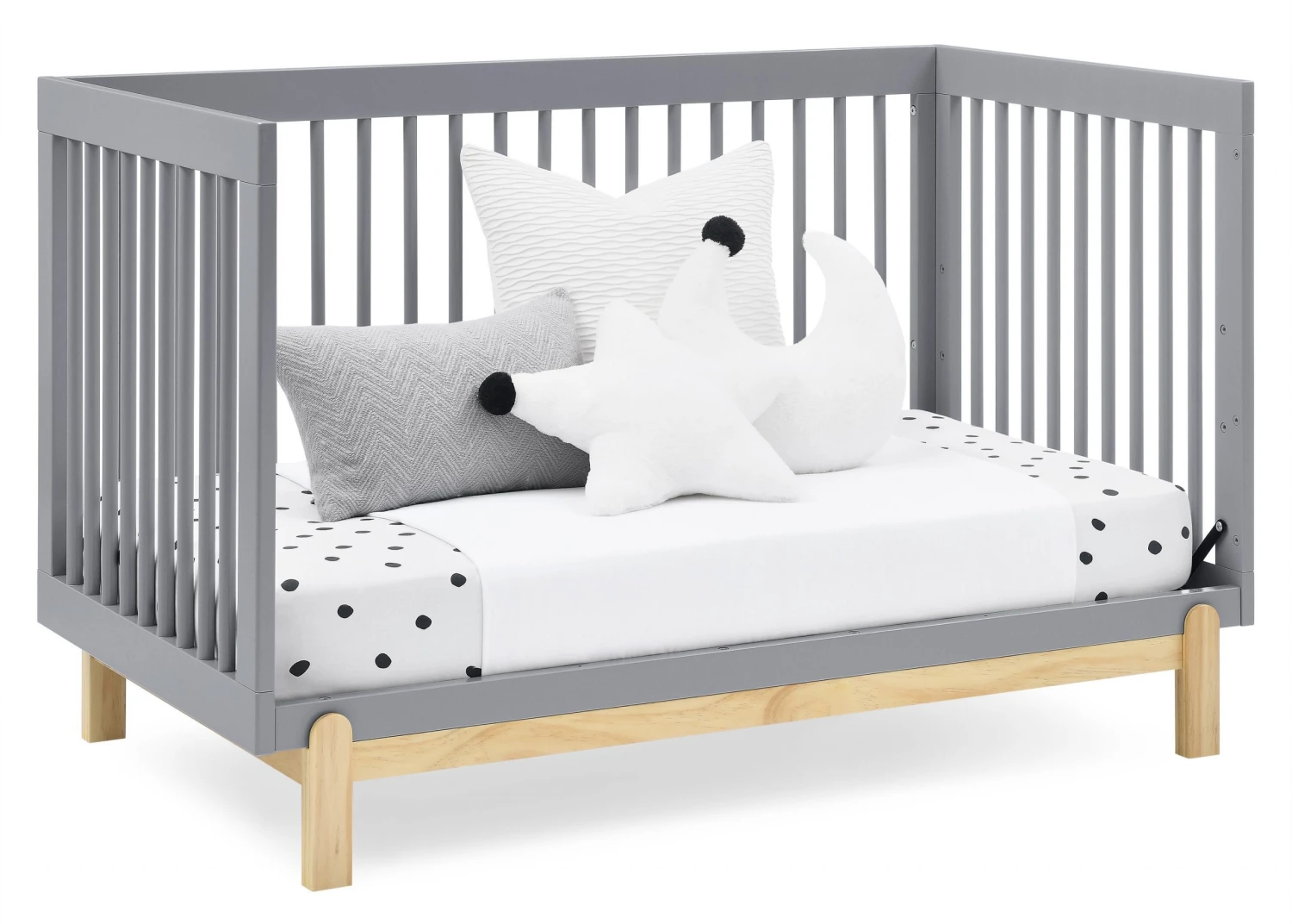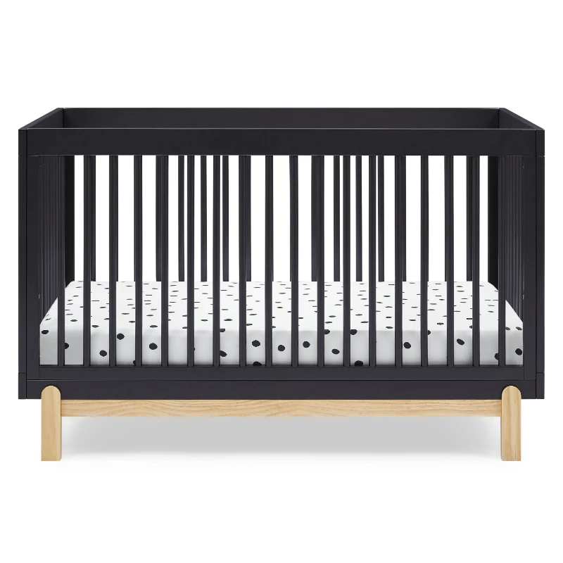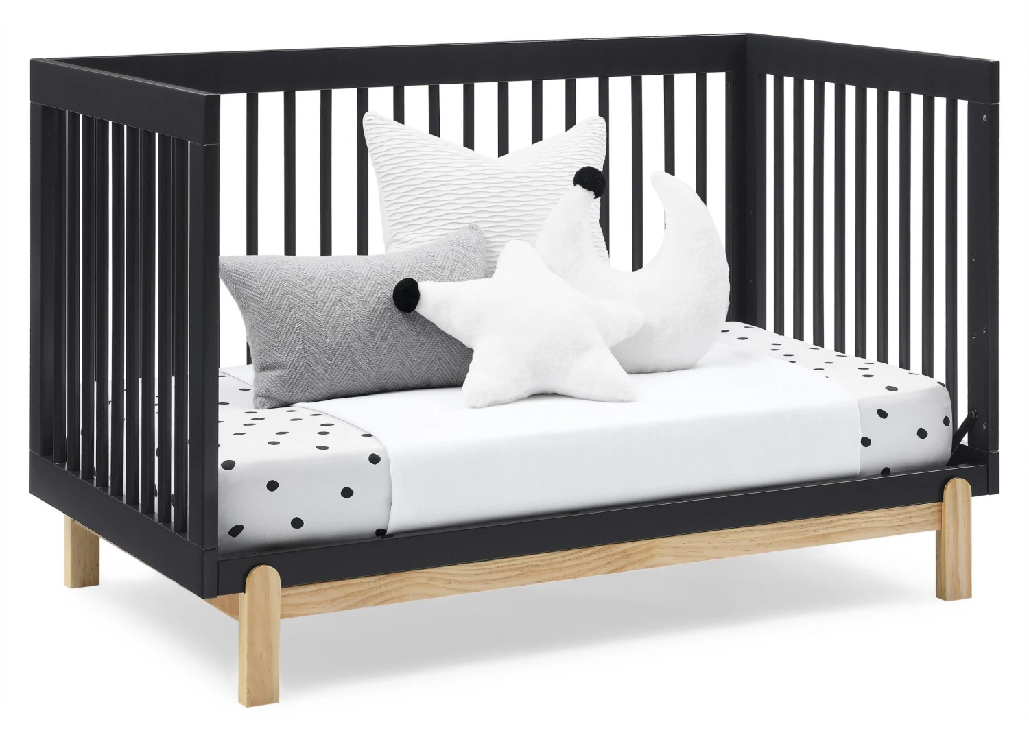 The stylish two-toned Poppy 4-in-1 Convertible Baby Crib by Delta Children will be the centerpiece of your little one’s bedroom for years to come. It’s a timeless, modern crib that features an adjustable height mattress, plus it converts into a toddler bed, daybed and sofa as your child grows (Daybed/Sofa Rail included; Toddler Guardrail #W100725 sold separately). The warm, natural wood tone of this crib’s base and feet is paired with contrasting round spindles to create a modern, sleek style that adapts to all your child’s sleep needs from baby to big-kid. To complete your nursery, pair the Poppy 4-in-1 Convertible Crib with the Poppy 3 Drawer Dresser with Cubbies by Delta Children. Crib is available in Bianca White with Natural, Grey with Natural and Midnight Grey with Natural. Crib mattress not included.