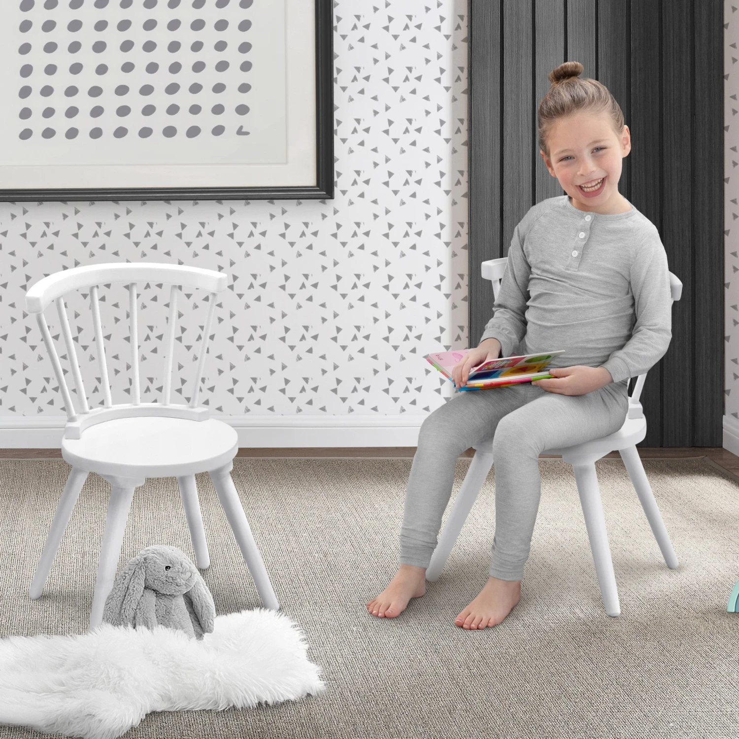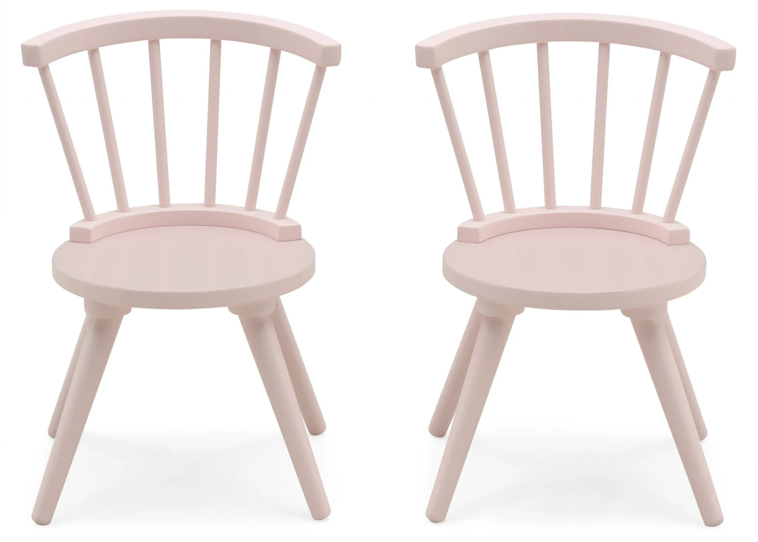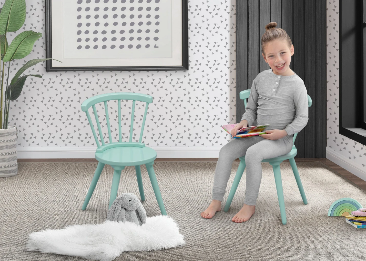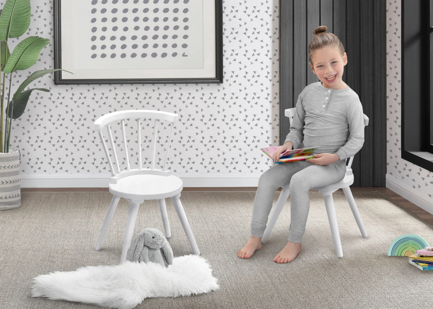 Have a seat (or two) with this Windsor 2-Piece Chair Set by Delta Children. These sturdy wooden chairs are designed in a traditional style and feature a recognizable Windsor silhouette with vertical spokes and curved backs. Sized just right for your growing child, the 12-inch seat height of these kids’ chairs ensure they can be used for many years. To complete your play space, pair these chairs with Windsor Table and Chair Set (sold separately) or any other play table of your choice.