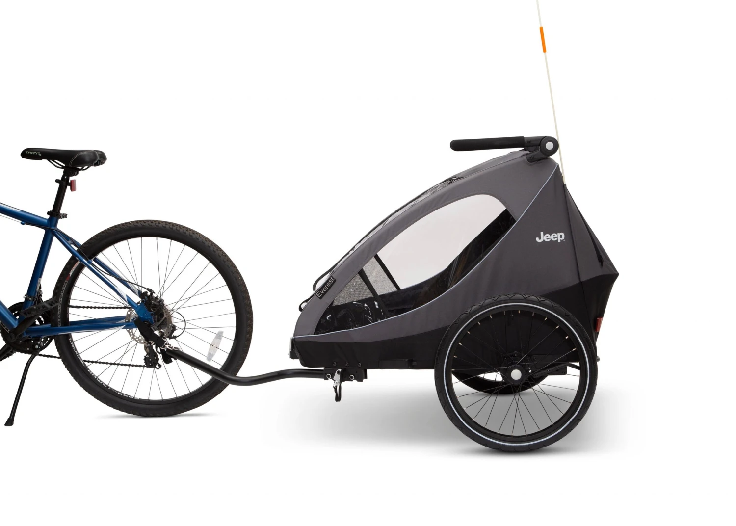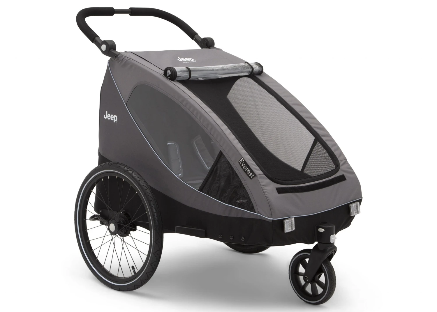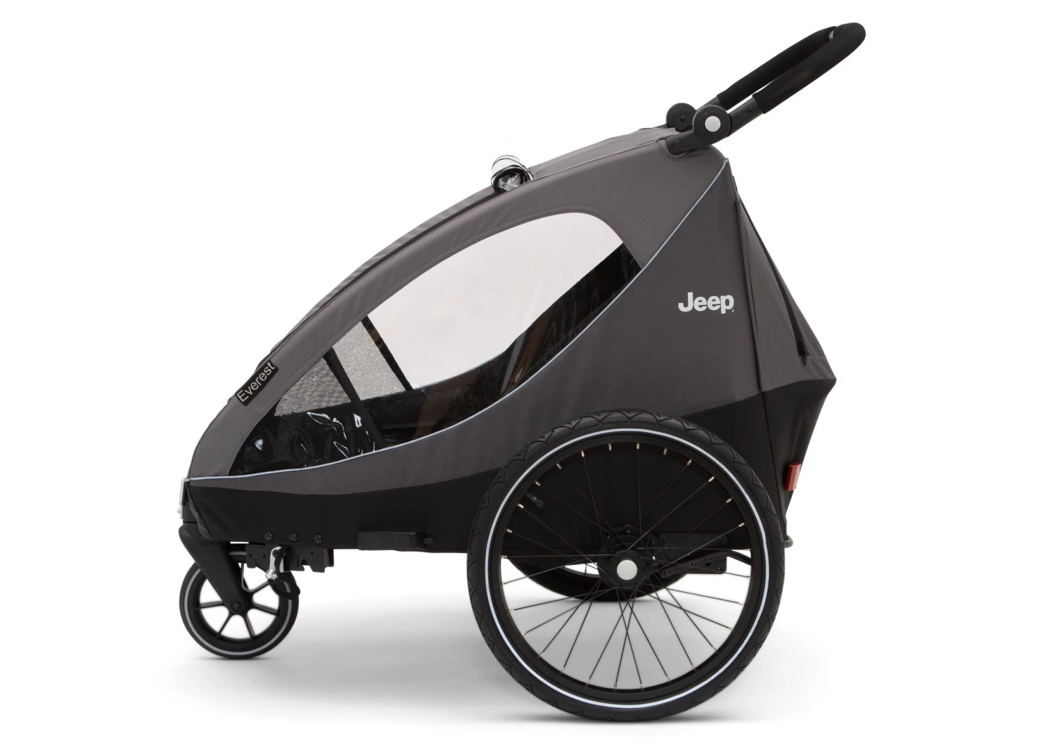 Take the whole family along for any adventure with the Jeep Everest 2-in-1 Bike Trailer and Stroller for 2 Kids by Delta Children. A durable bicycle trailer that easily transforms into a double stroller once you reach your destination, it provides a comfortable ride for two children. The included universal bike hitch easily attaches to most bicycles and the included stroller kit allows you to go from biking to strolling quickly by adding a front wheel. Designed to keep kids comfortable, the trailer features a large front mesh window, roll down rain shield and roll down windows on both side with mesh vents for airflow. An adjustable handlebar provides comfort for parents while in stroller mode and spacious rear cargo storage space can house frisbees, footballs, food—whatever your family needs while on the go. And when your outing is over, the compact, flat fold makes travel and storage easier than ever. For your safety, trailer includes safety flag, reflective piping, and two 5-point safety harnesses.