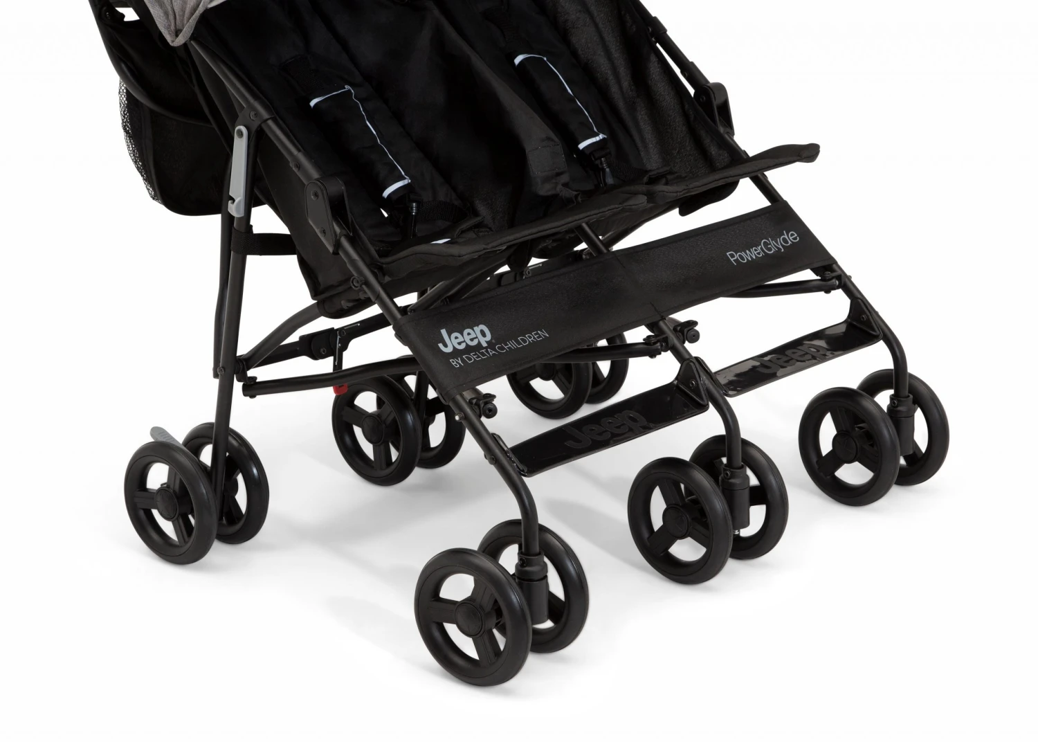 Looking for a wheel-y great ride for you and your growing family? Look no further than the Jeep PowerGlyde Side-by-Side Double Stroller by Delta Children! Designed to deliver the best ride ever, the Jeep PowerGlyde Side-by-Side Double Stroller offers the most advanced handling thanks to all-new front wheels that feature precision technology, making it easier than ever to glide, turn and maneuver any surface. Ideal for travel or everyday use, this extremely lightweight double stroller weighs under 20 pounds and features a compact umbrella fold with an auto lock design. An extra-large extendable canopy with UPF 50+ sun visor will protect your children from the elements while calf and footrests ensure kids are comfortable during walks, near and far. Some additional features of this lightweight double stroller include ergonomic handles, five-point safety harness with reflective piping, two storage pockets, extra-large parent cup holder and swivel front wheels. This stroller is recommended for infants 9 months up to 35 lbs. per seat (70 lbs. total). Let’s glyde!